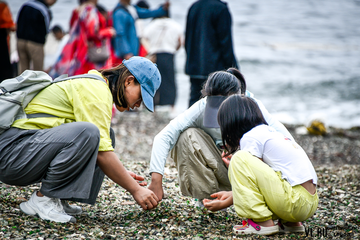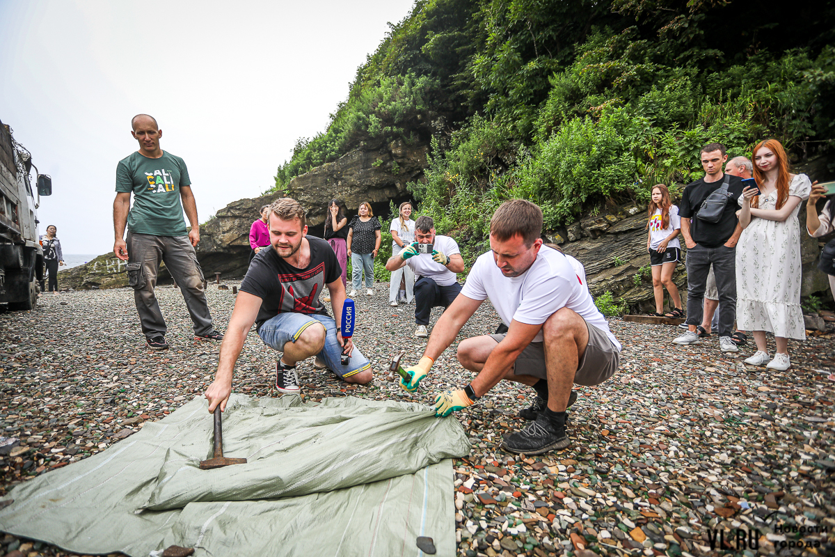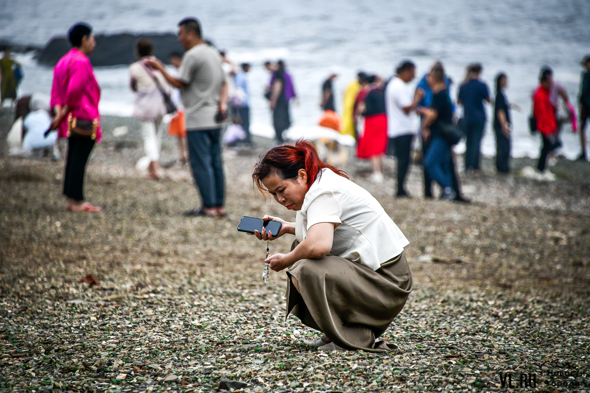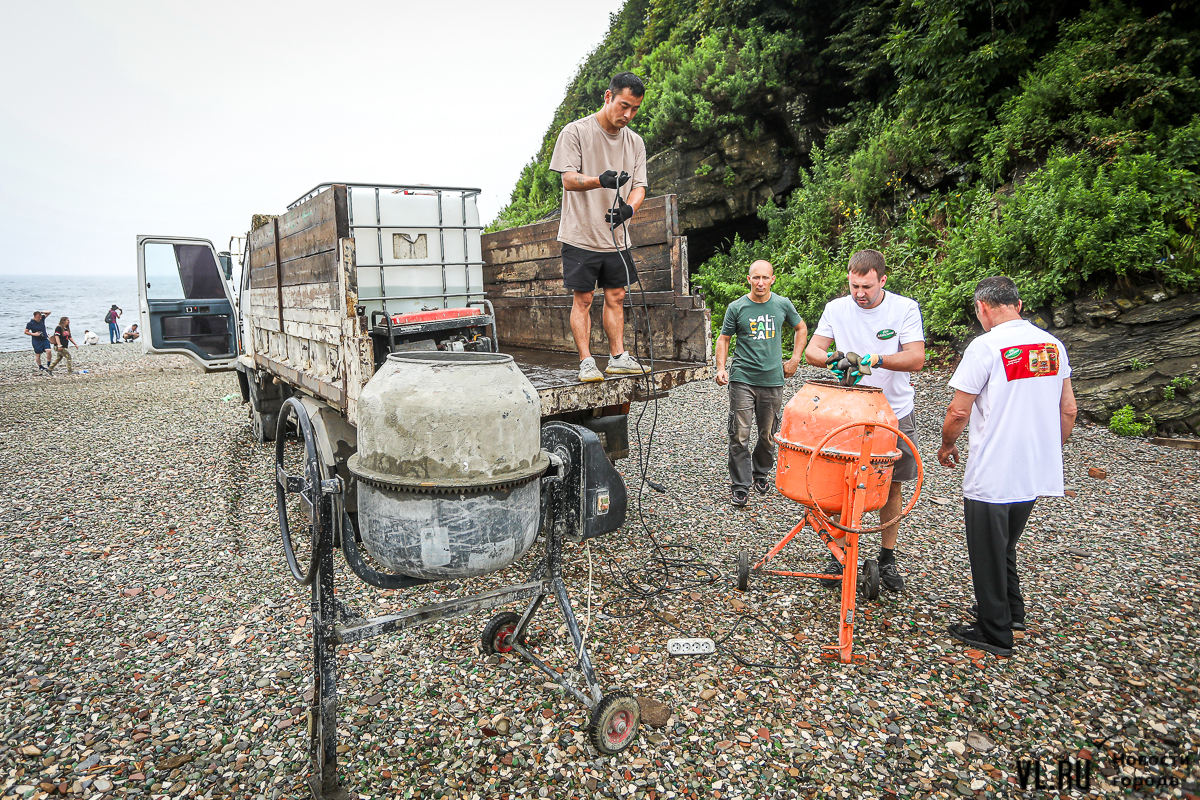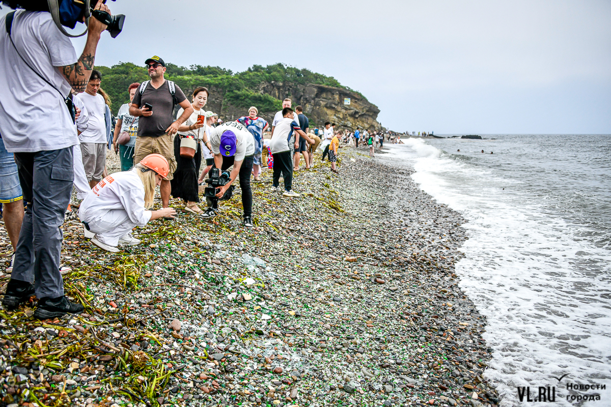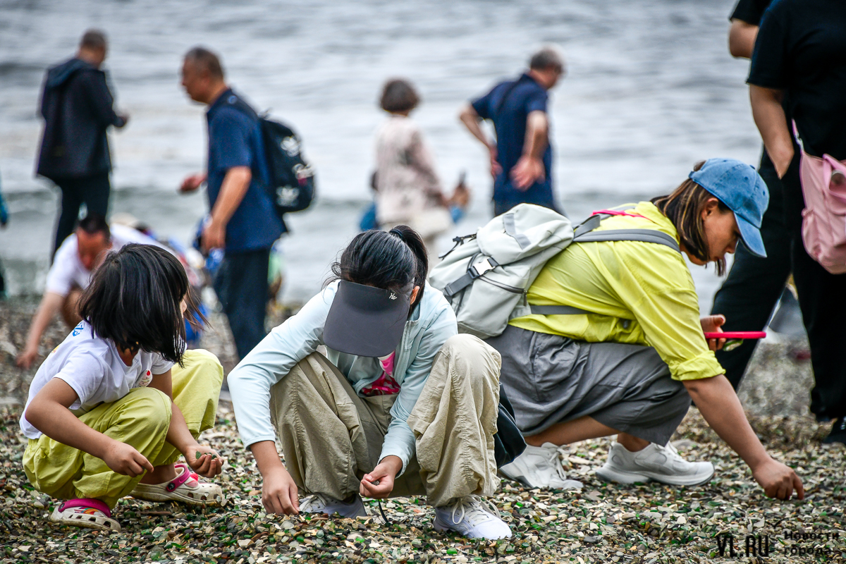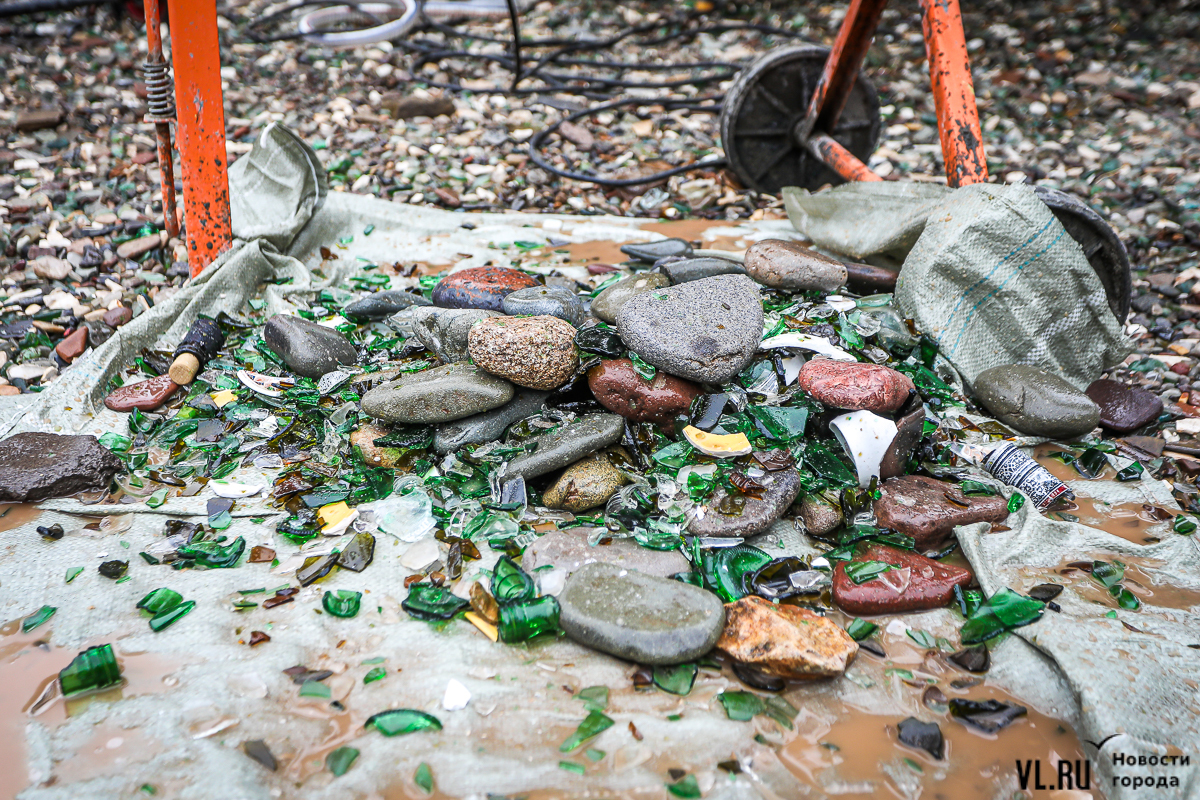 Подготовка к обработке вызвала нешуточный интерес у китайских туристов. Сперва они просто подходили поинтересоваться, заглядывали в бетономешалки, рассматривали вёдра и мешки со стеклом. А затем решили принять в спасении бухты Стеклянной самое деятельное участие. Взяли молотки и стали колотить по стёклам, снимая друг друга на телефоны. Подходили по одному, по двое, целыми группами, хохотали и вообще от души веселились. Затем подтянулись и русские отдыхающие, но уже не для веселья, а чтобы внимательно следить за процессом. Кто-то говорил «дурью маются», кто-то, напротив, хвалил.