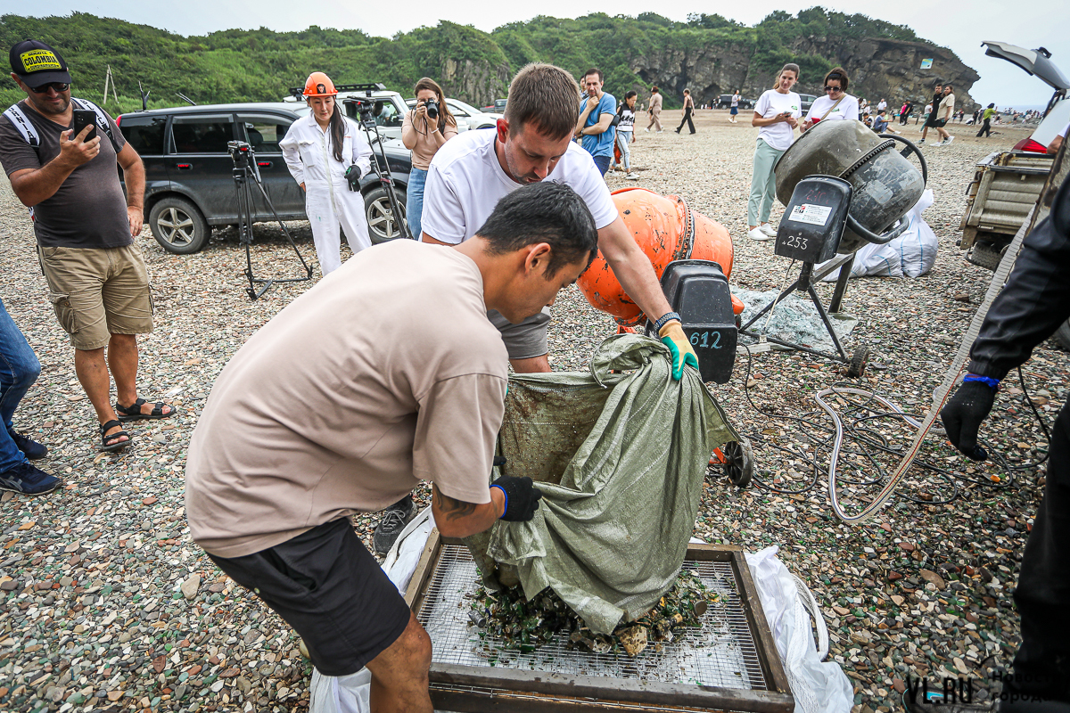 Вторая акция по восстановлению пляжа бухты Стеклянной прошла 1 августа при уже гораздо большем скоплении людей и «сырья». Делать постоянной её не планировали, но после первого раза в управление туризма и городской среды поступило так много запросов, что пришлось на них откликнуться. «Осколки моря» сегодня высыпали уже грузовиками.