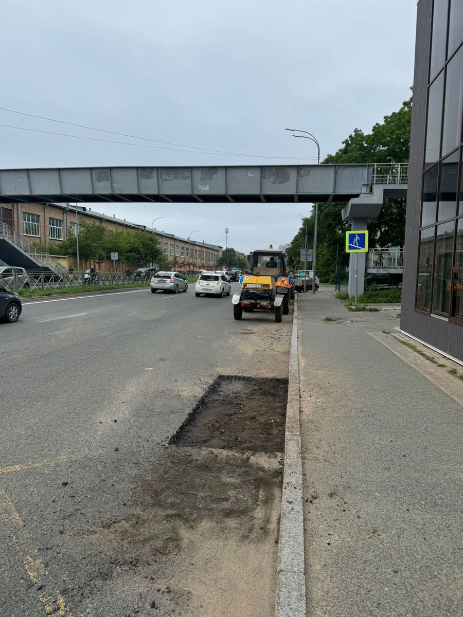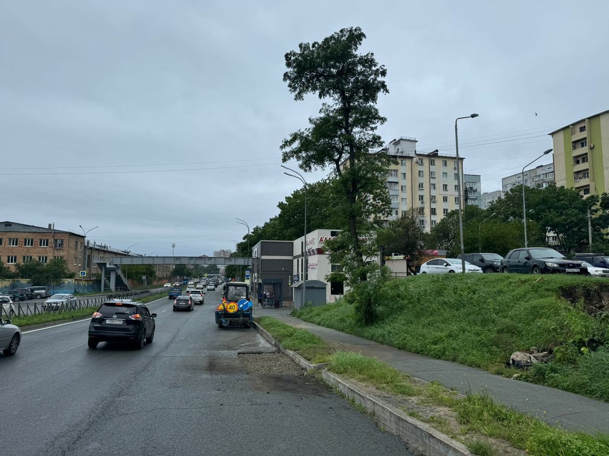 Ремонт проезжей части и пешеходных дорожек проводит сегодня дорожная служба «Содержание городских территорий» на улицах Калинина и Олега Кошевого. Как уточнили в пресс-службе администрации Владивостока, здесь устраняют провалы, пучины и повреждённые в результате ДТП бортовые камни. Из-за дорожных работ со стороны Золотого моста и развязки на Окатовой собралась пробка.
