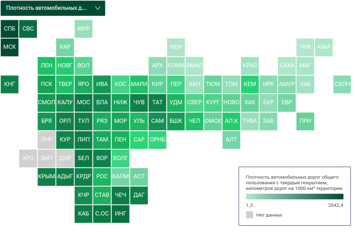 А выше всего в стране плотность дорог с твёрдым покрытием оказалась в Санкт-Петербурге – 2542,4 на 1000 кв. м.