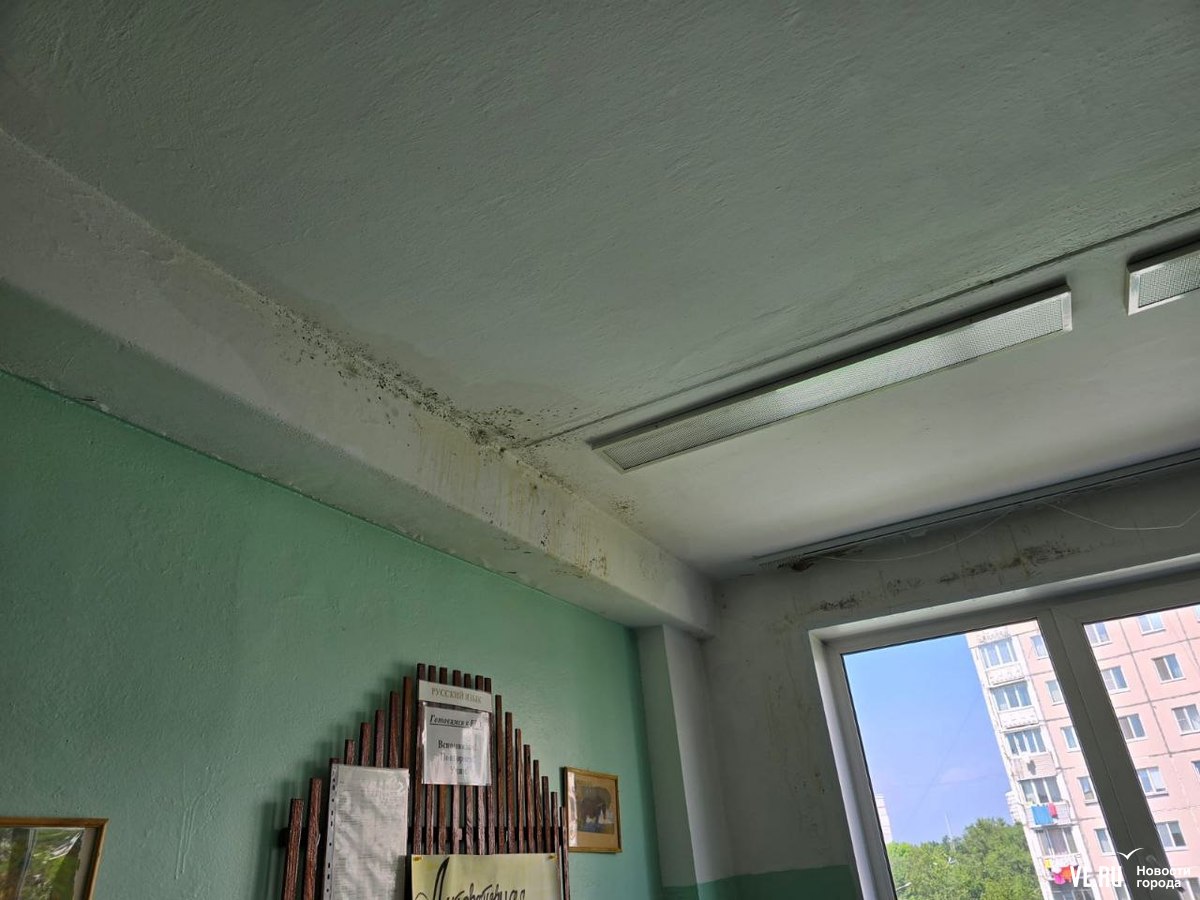 На этих фотографиях уже видны и следы косметического ремонта, который делали летом в кабинетах не в рамках капремонта, и последствия дождя: потёки на стенах, вспученная краска и штукатурка, плесень на стенах, старом линолеуме и даже на мебели. Местами на партах можно заметить странные оранжевые образования. И это не монтажная пена, уверяет собеседник, а грибы.