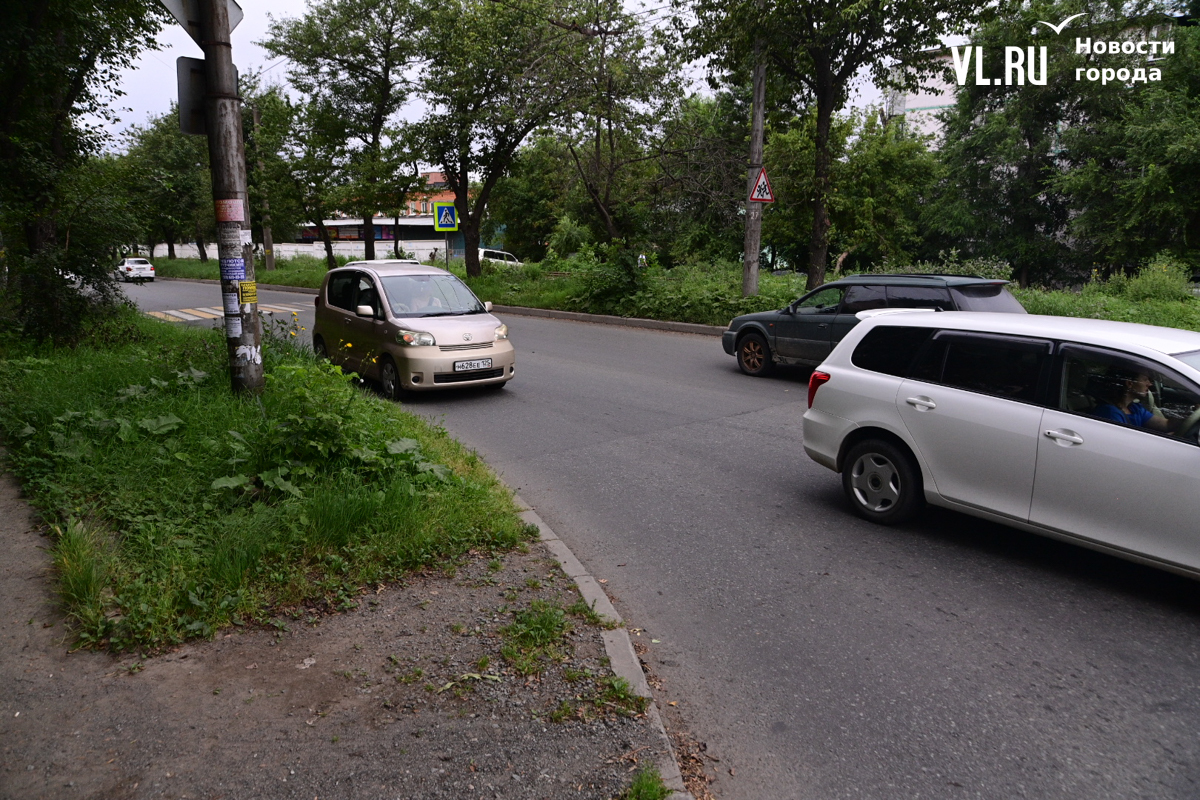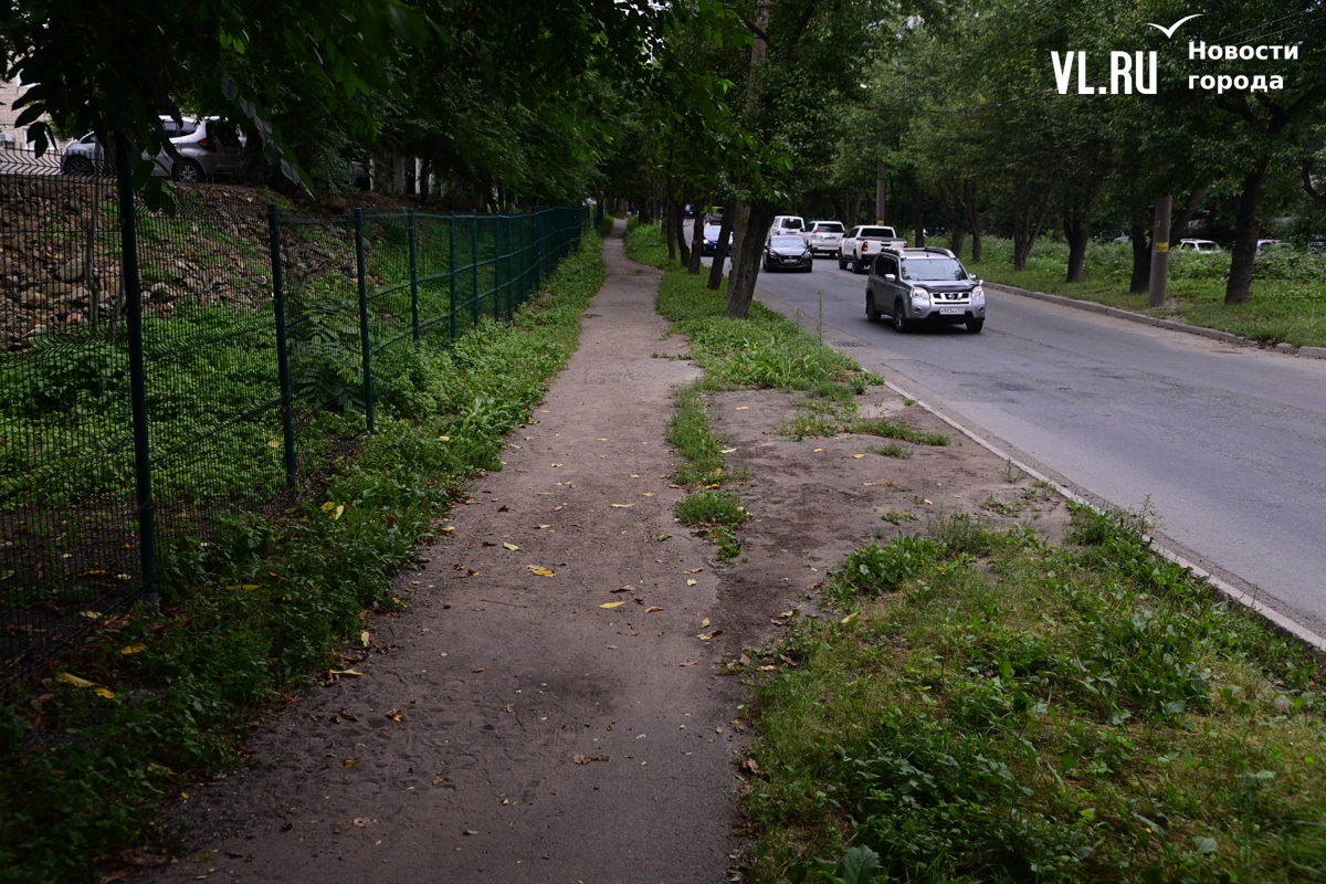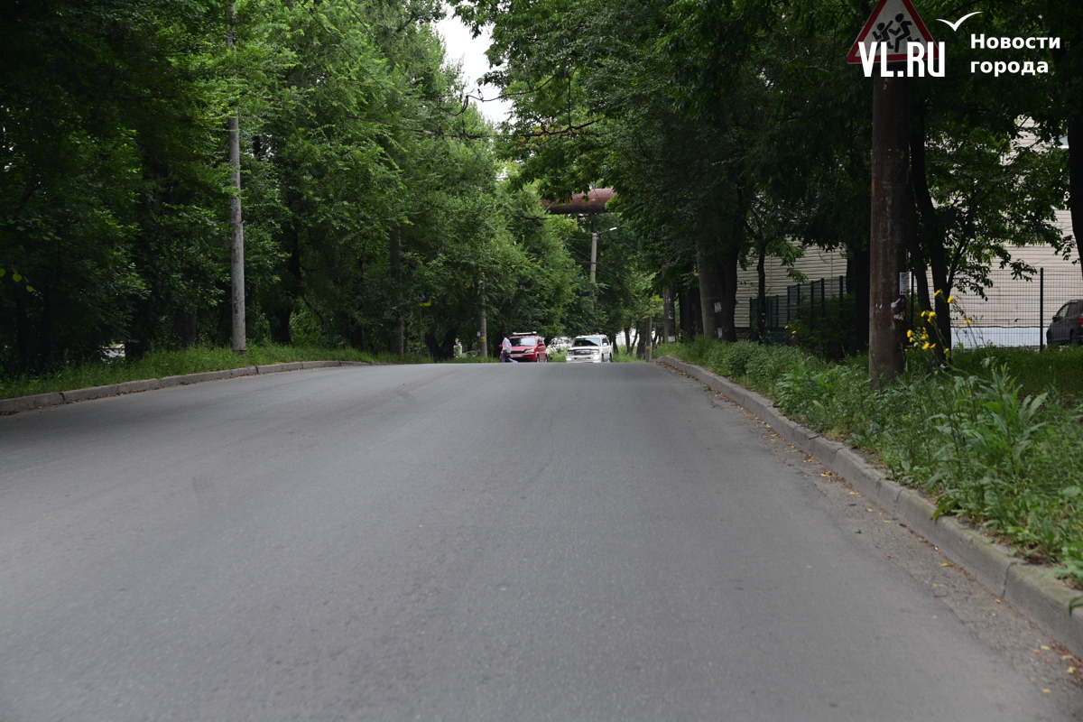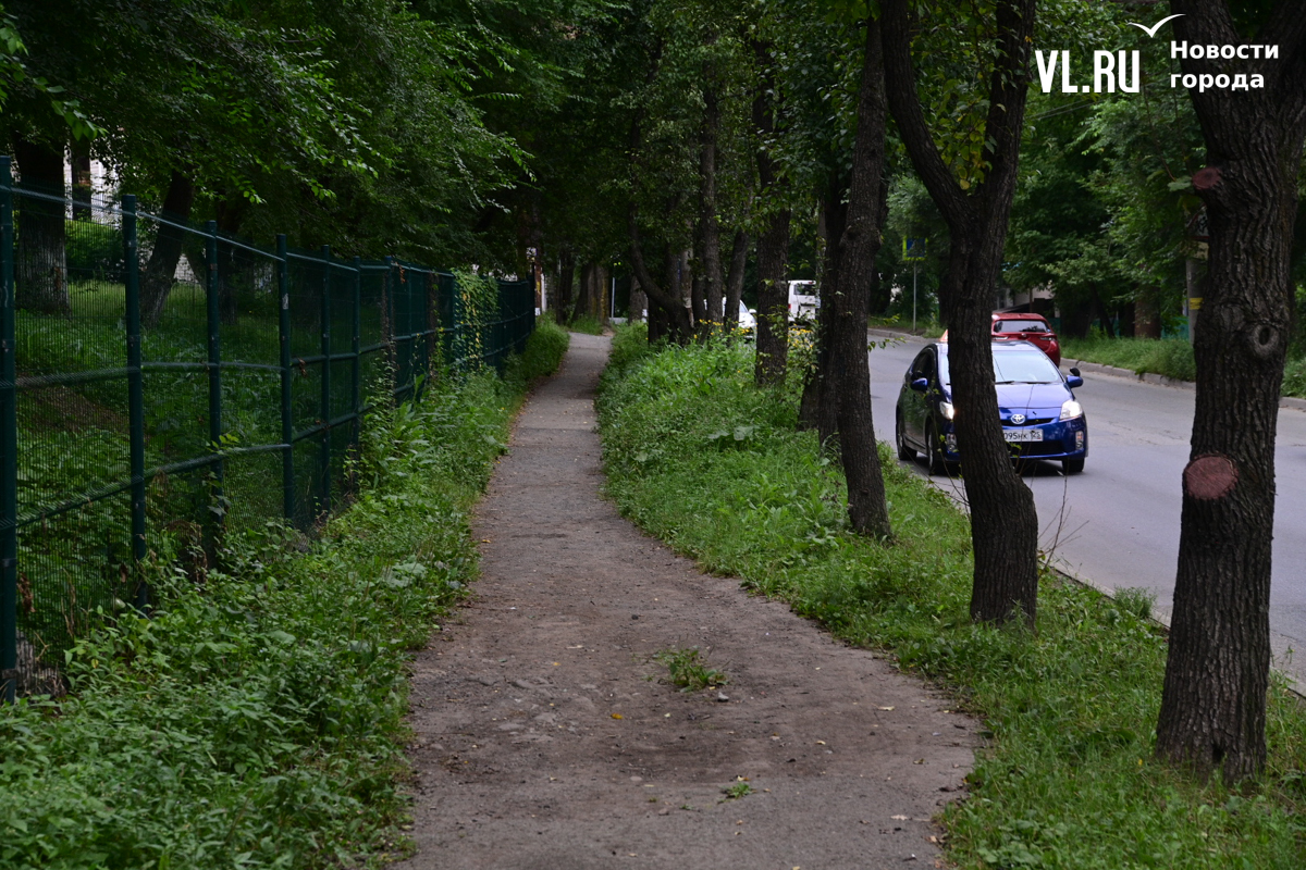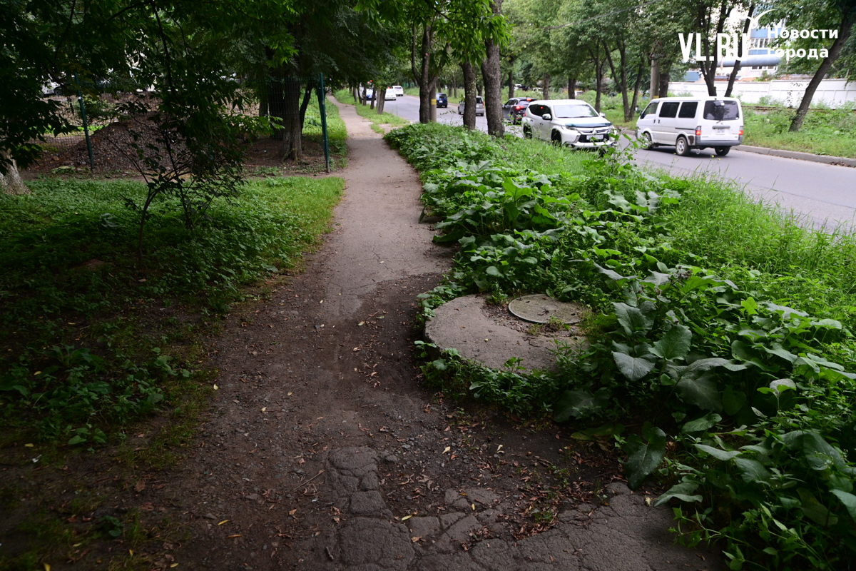 Если забыть про подтопления участка, то выбор его для ремонта может показаться очень странным. Асфальт тут не идеальный, много латок и трещин, но больших ям не видно на всём протяжении. Даже вокруг ливнёвок асфальт не просел, что редко бывает во Владивостоке. Местами не хватает тротуара – вместо него тут натоптаны пешеходные тропинки. Но в целом не самая аварийная дорога в городе.