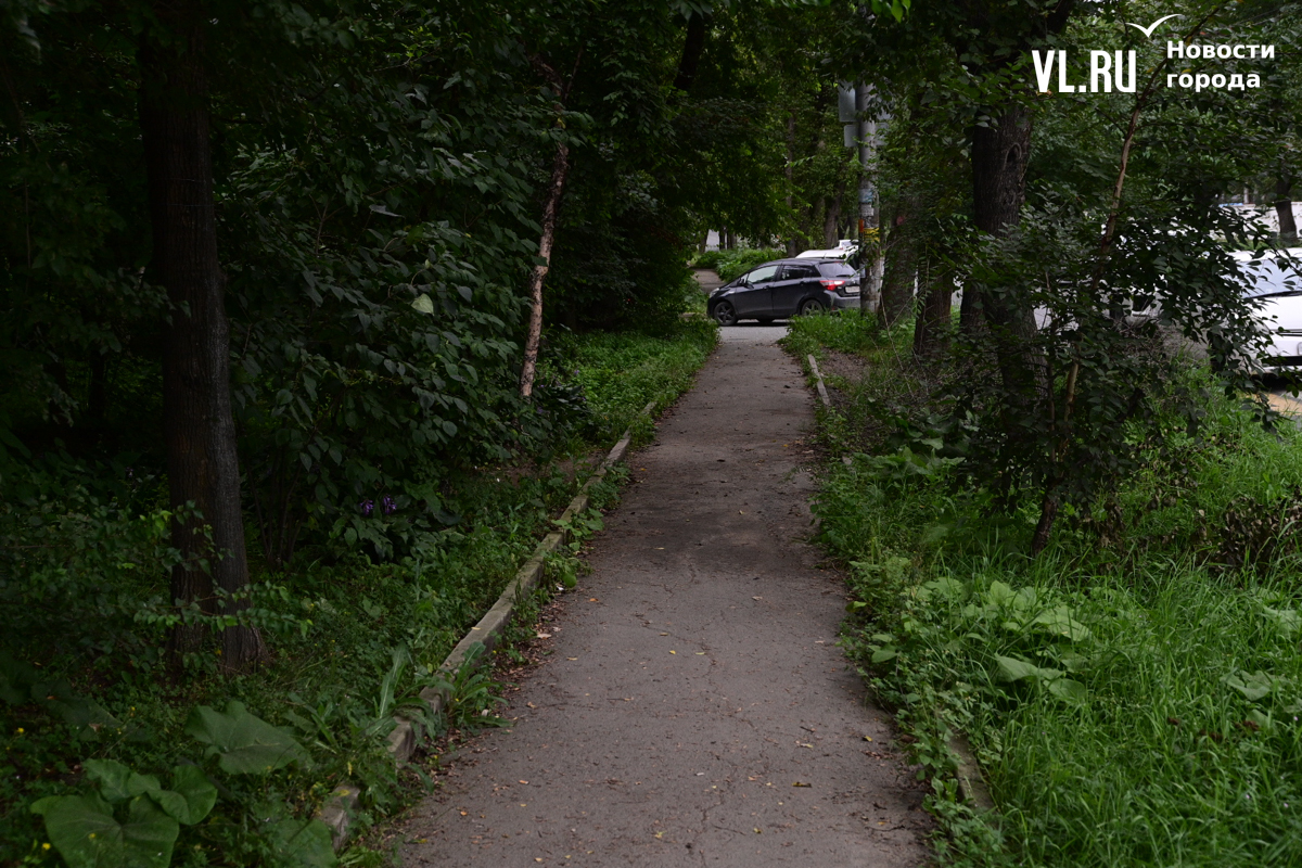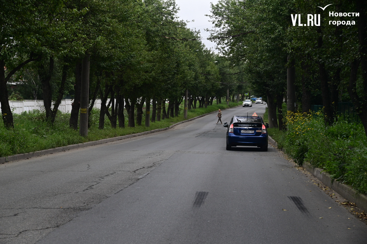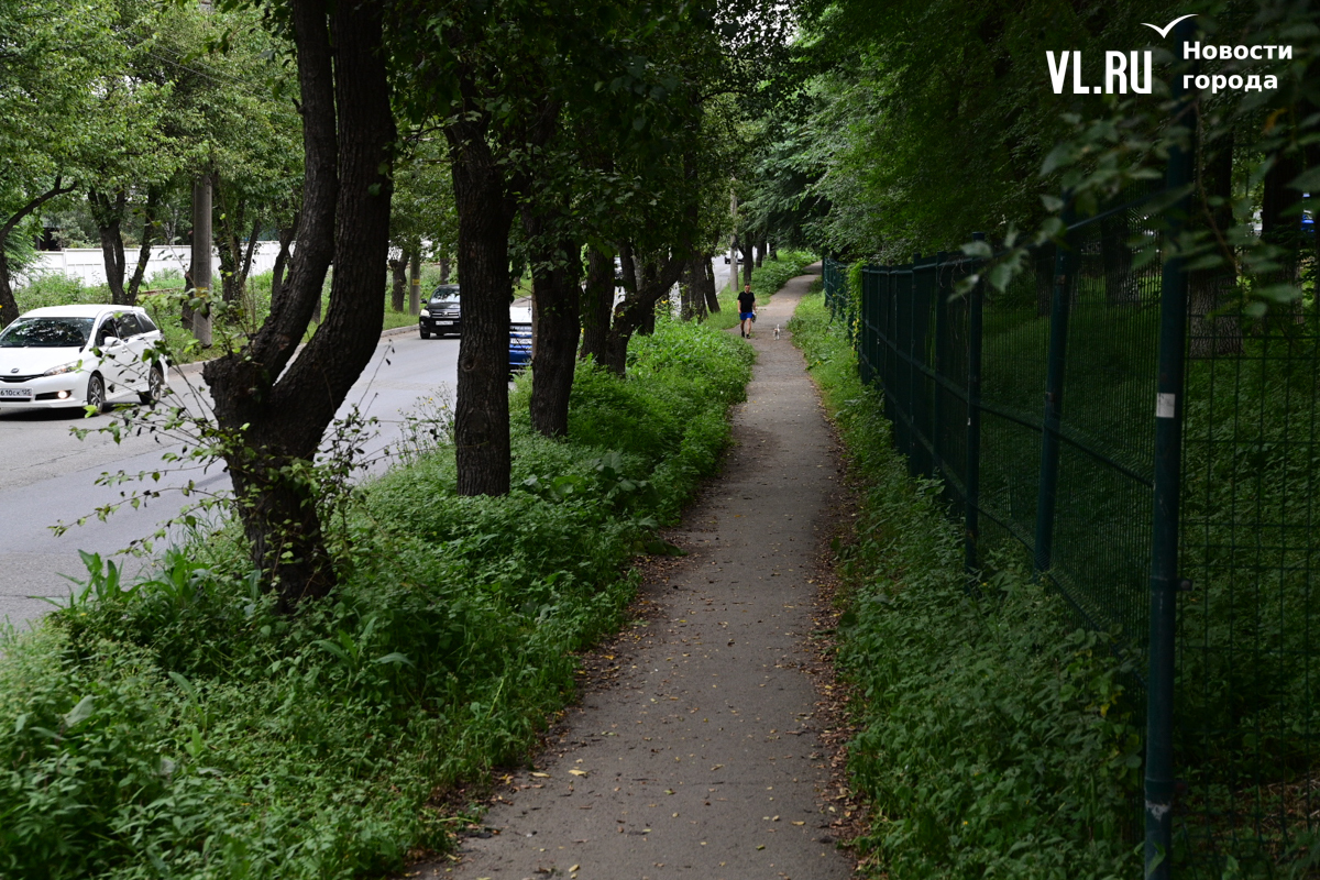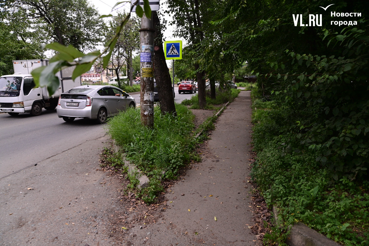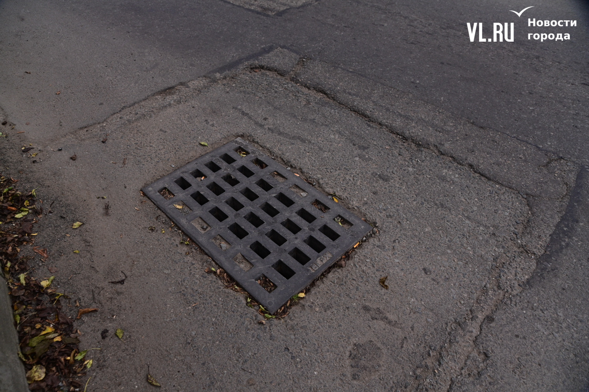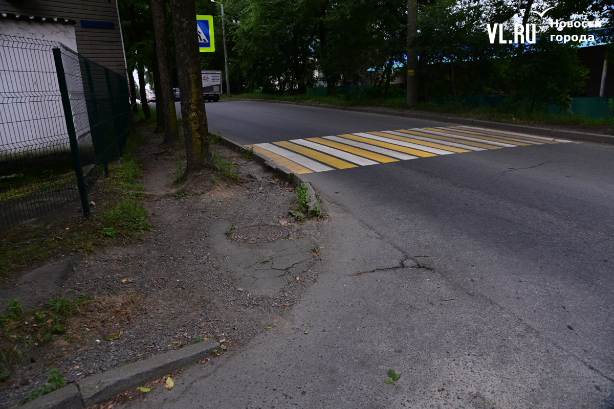 Если забыть про подтопления участка, то выбор его для ремонта может показаться очень странным. Асфальт тут не идеальный, много латок и трещин, но больших ям не видно на всём протяжении. Даже вокруг ливнёвок асфальт не просел, что редко бывает во Владивостоке. Местами не хватает тротуара – вместо него тут натоптаны пешеходные тропинки. Но в целом не самая аварийная дорога в городе.