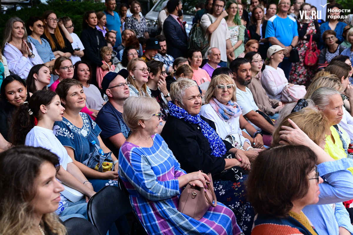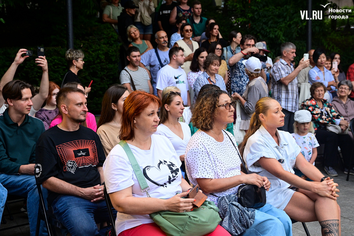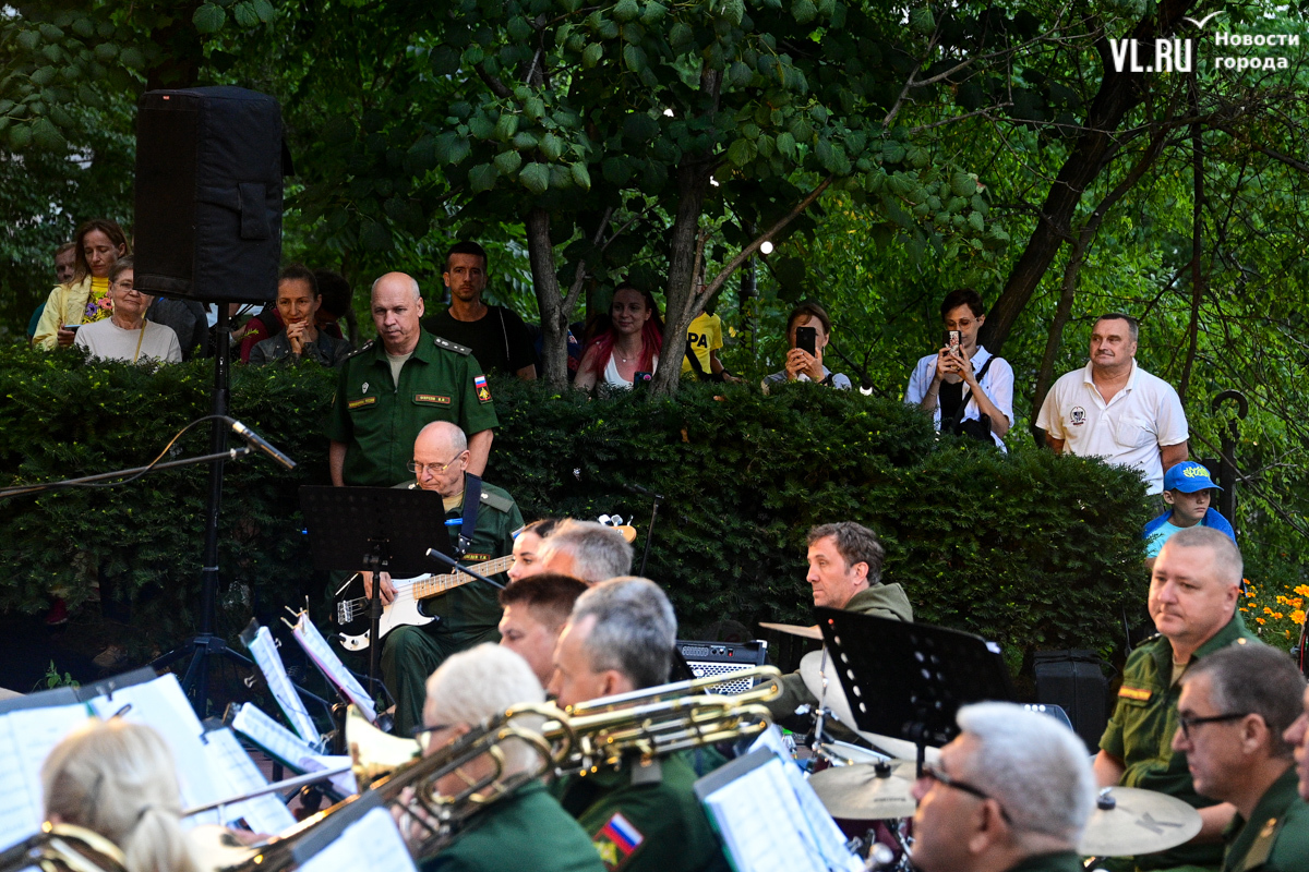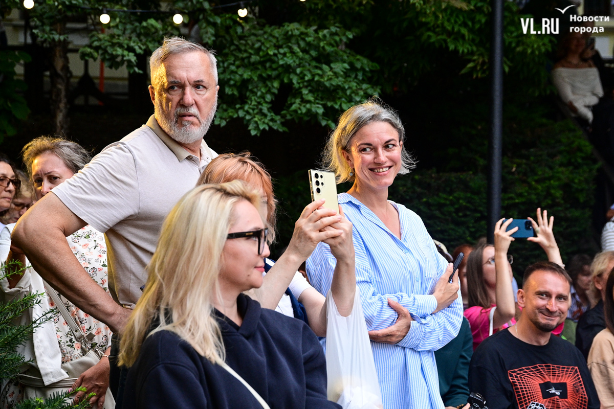 Несмотря на «блэкаут» в Приморском крае в пятницу, 16 августа, концерт в сквере Юла Бриннера начался вовремя – в 19:00. К генератору подключили микрофон, колонки, а также иллюминацию, которая в сочетании с отсутствием света во всём городе создала особенную атмосферу. Насладиться джазовыми композициями собрались десятки человек – все сидячие места были заняты, гости стояли вокруг музыкантов на тротуаре и даже газонах, танцевали и подпевали, на время забыв о коллапсе на электросетях. Жители соседних домов наслаждались джазом, сидя на своих балконах.