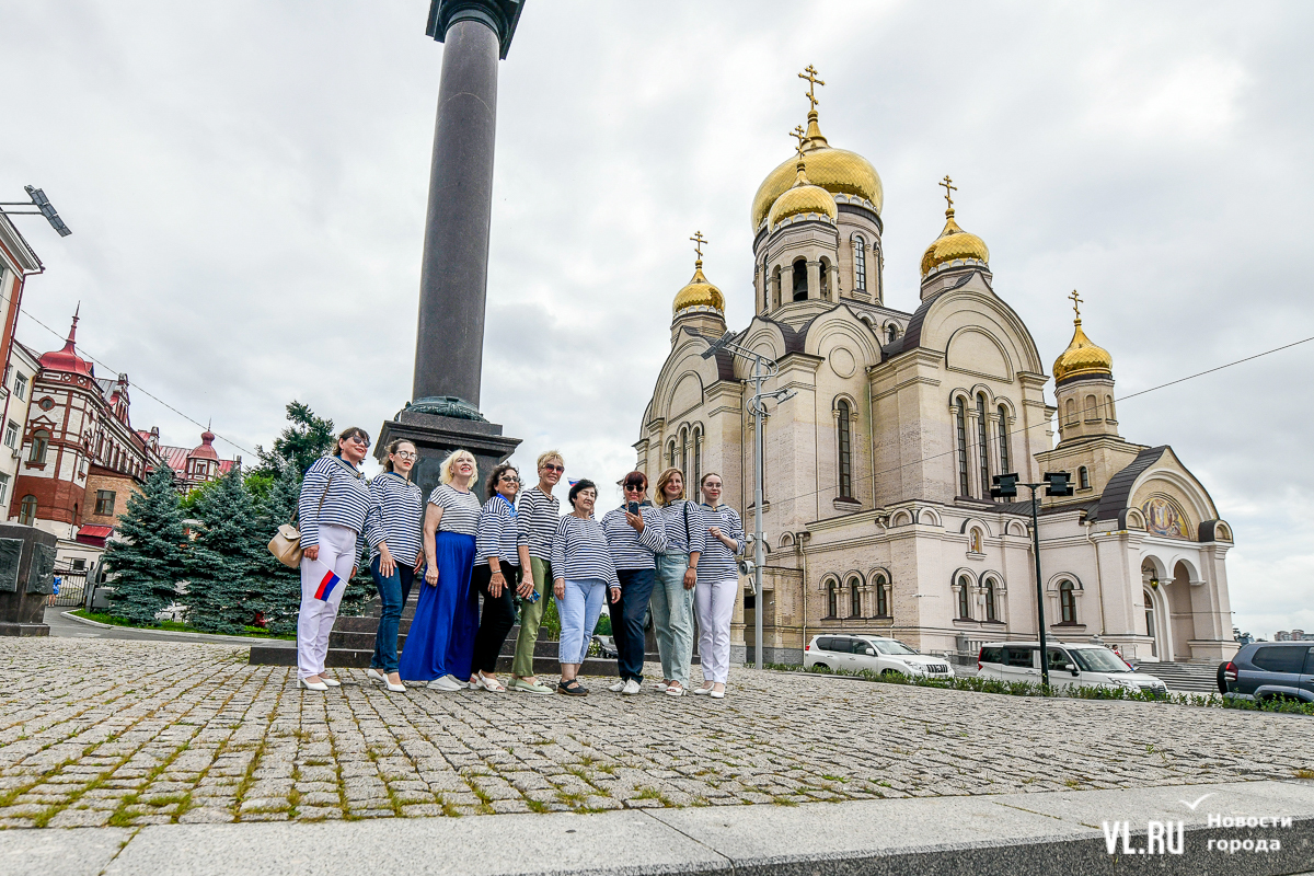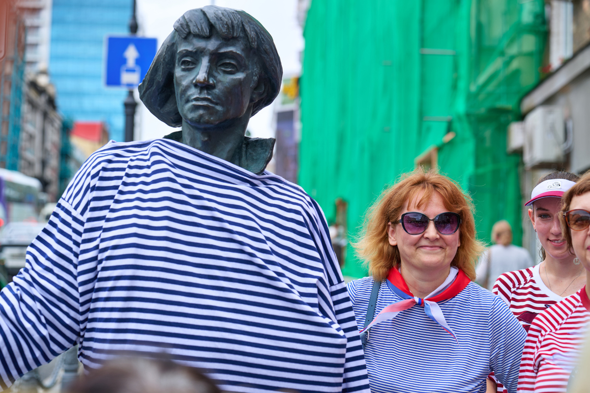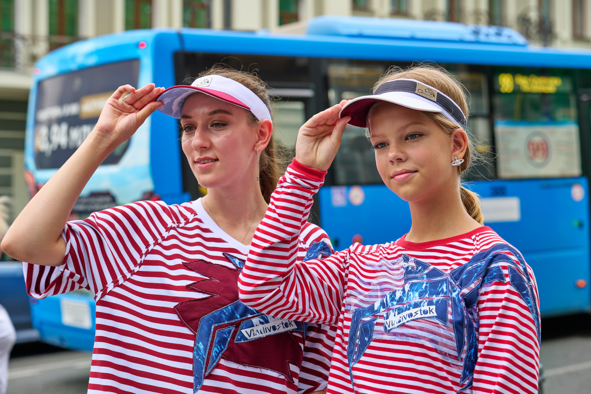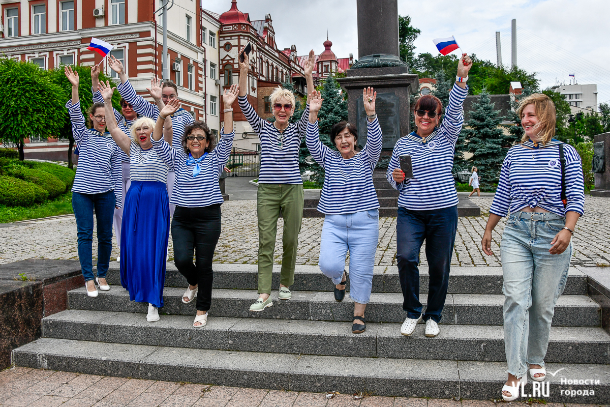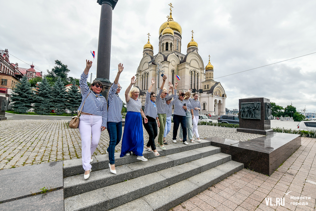 Завершилось празднование «полосатым» шествием по улицам Владивостока. Его участники дошли до памятника моряку и надели на него полосатый предмет гардероба, а потом отправились фотографироваться на центральную площадь.