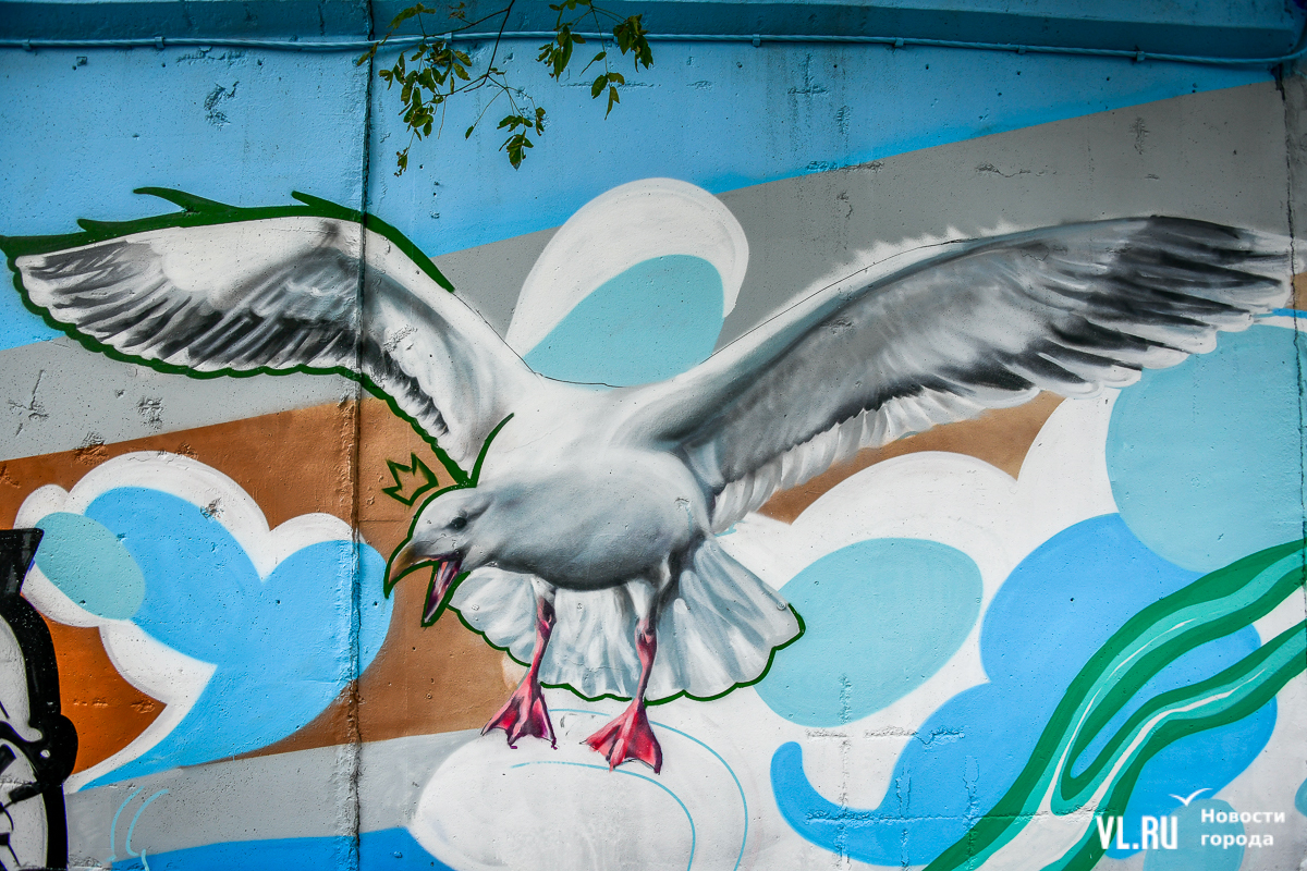 «Их сделал Павел Feat – он рисует фотореализм с яркими фонами. А вообще, у каждого в команде собственный стиль. У Ксении Илларионовой – тоже фотореализм. Чайки на стене – это её, она корректирует своих птиц ещё и кистью. Я наношу картинки, стилизованные под комиксы. Максим Некко универсал, но больше всего любит каллиграфию и леттеринг – искусство рисования букв».