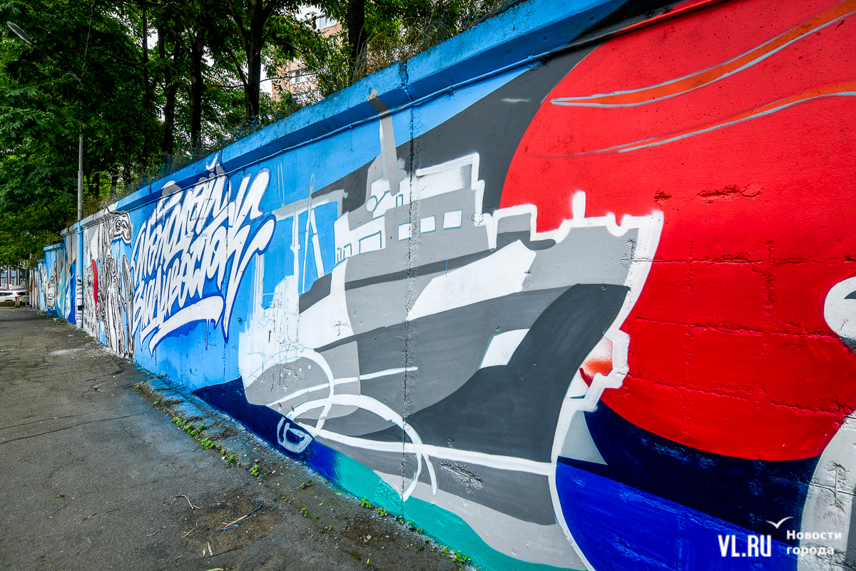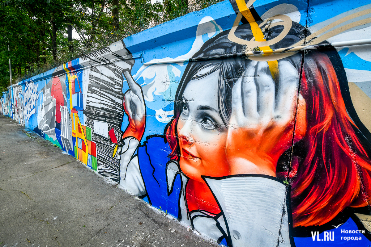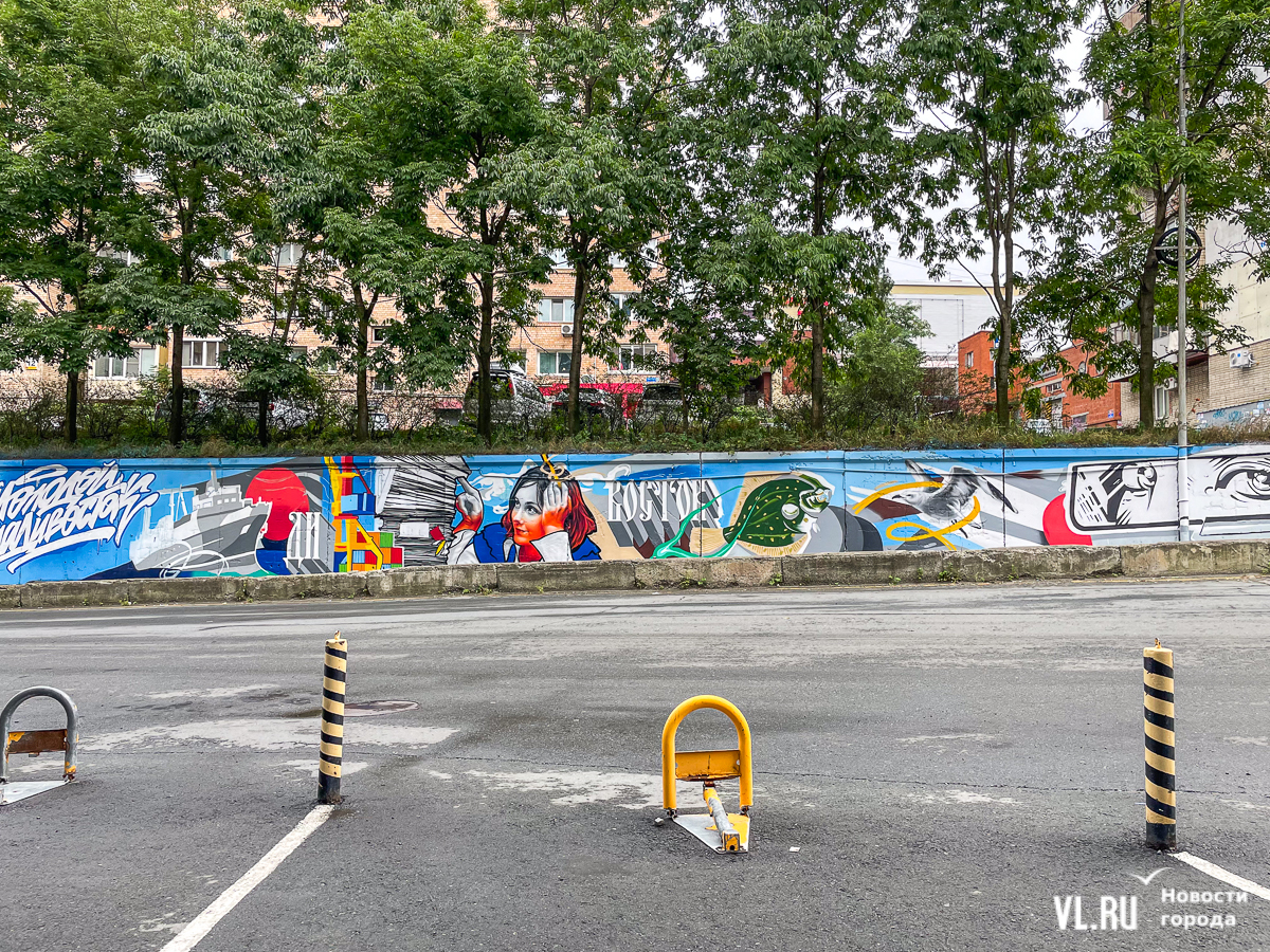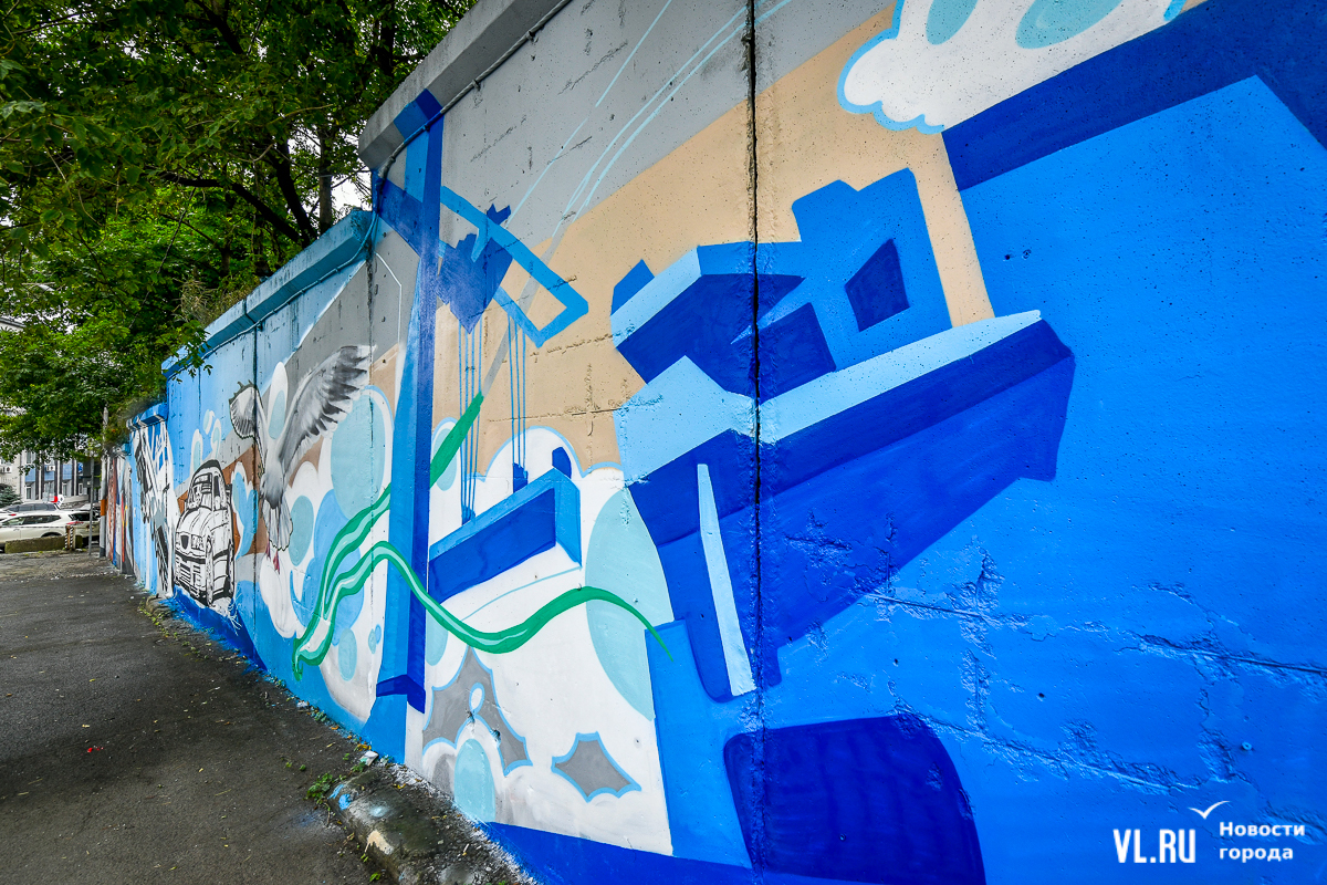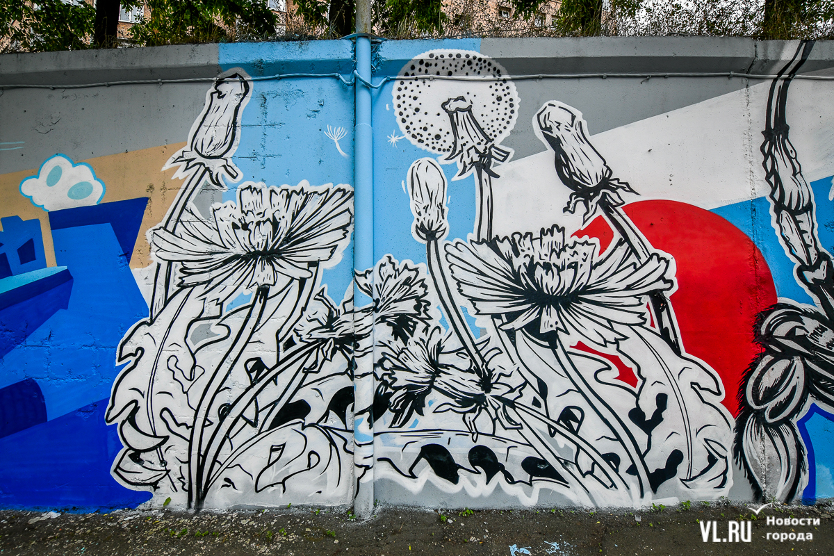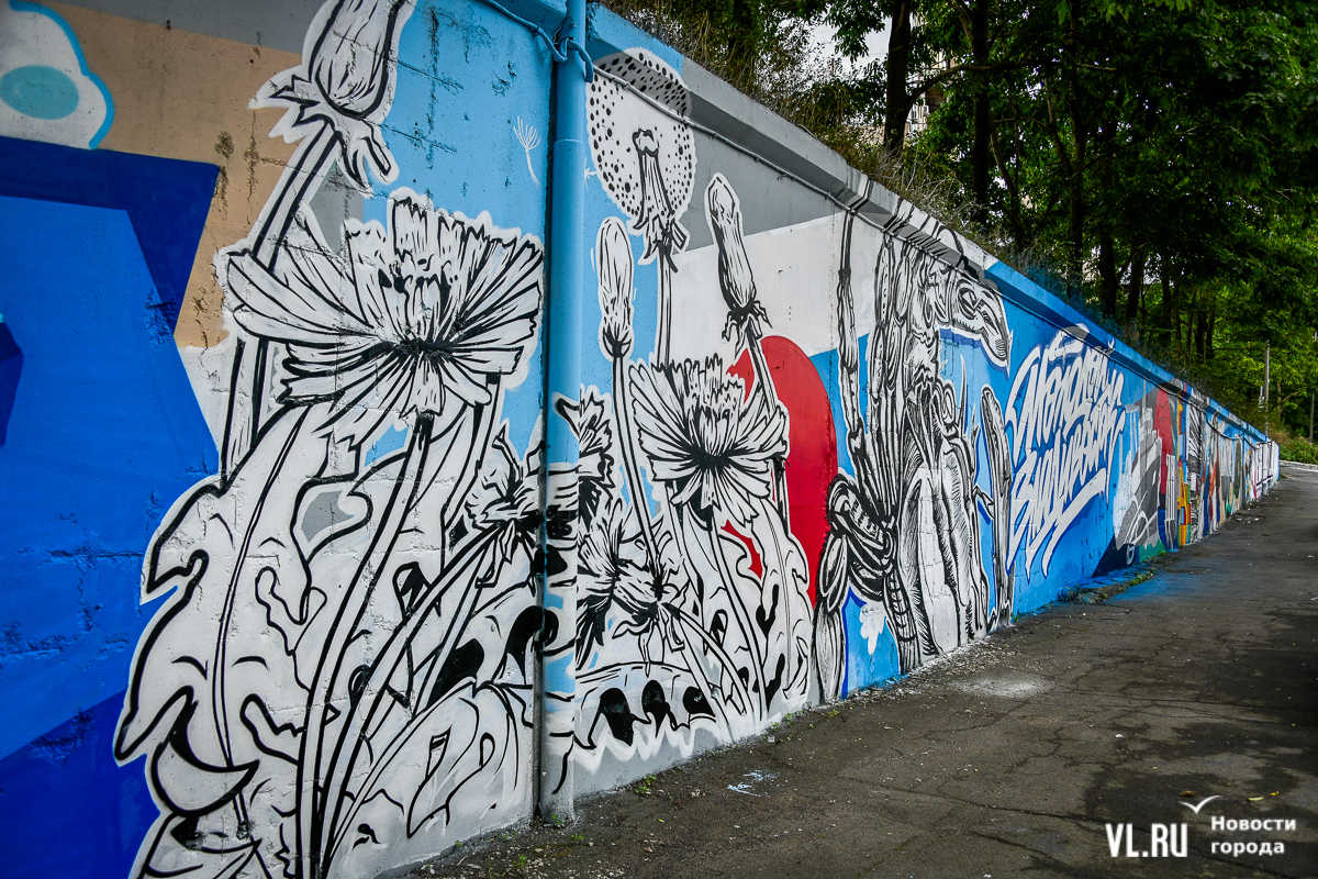 Мурал украсил ещё одну подпорную стену Владивостока. Это подарок городу от компании «Ист-Вэст», которая находится в двух шагах от арт-объекта на Стрельникова. Работу выполнила команда Artel Squad. Люди и звери, «тачки» и подъёмные краны, одуванчики и камбала – подпорная стена тянется вдоль тротуара на 90 метров, так что вместилось многое.