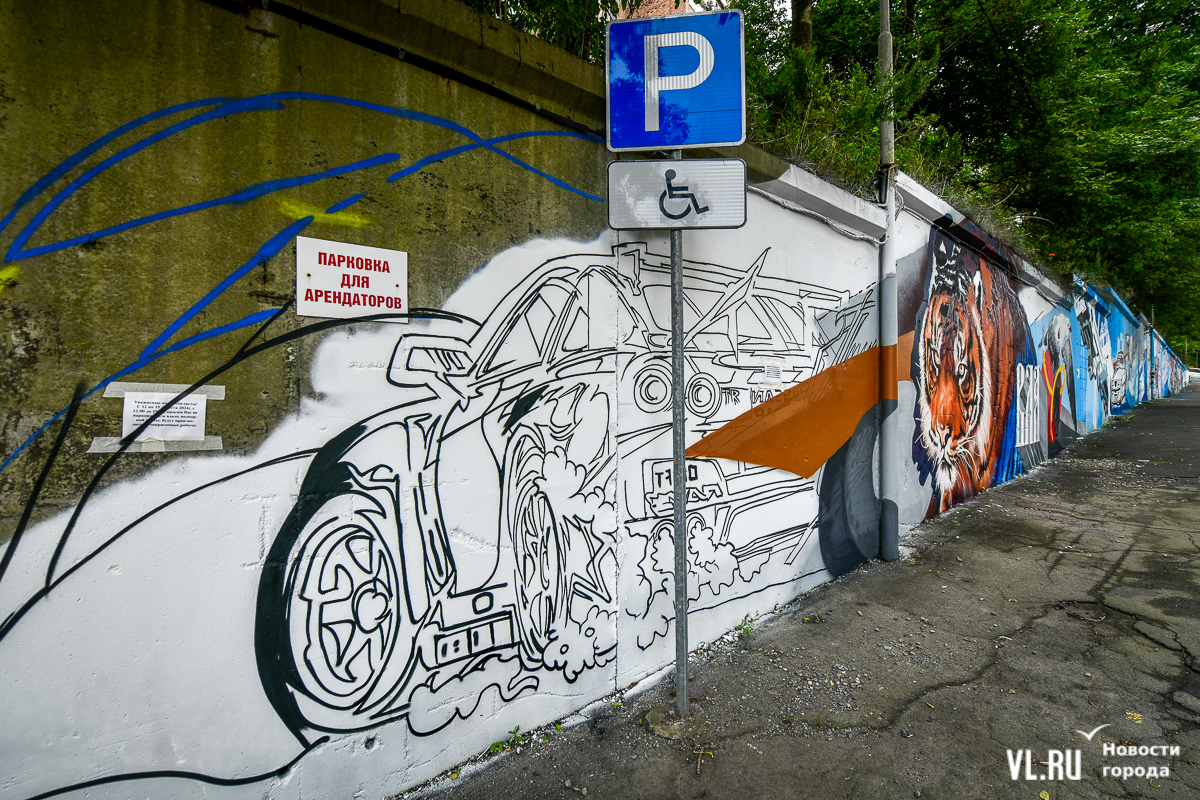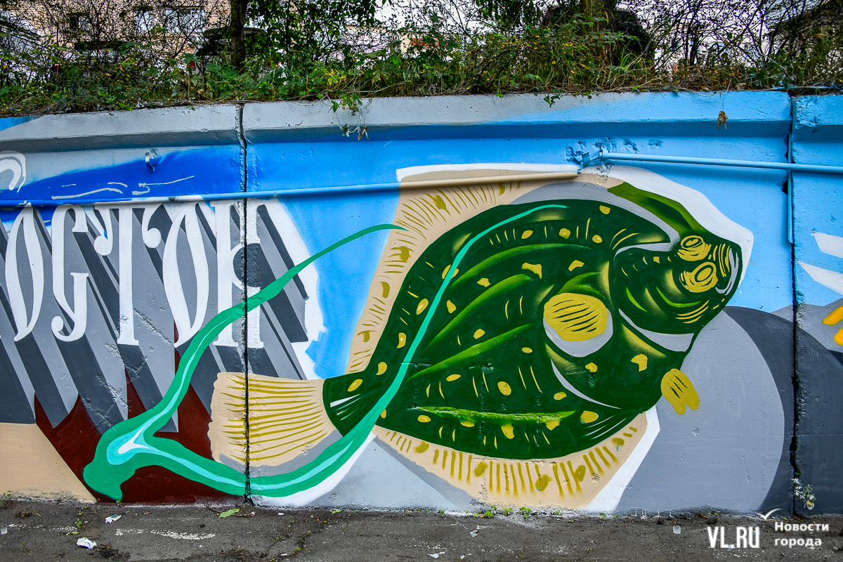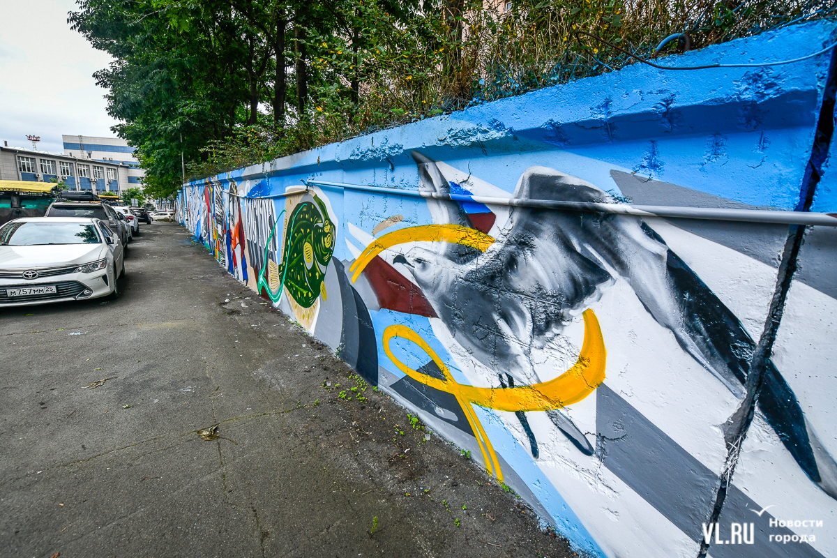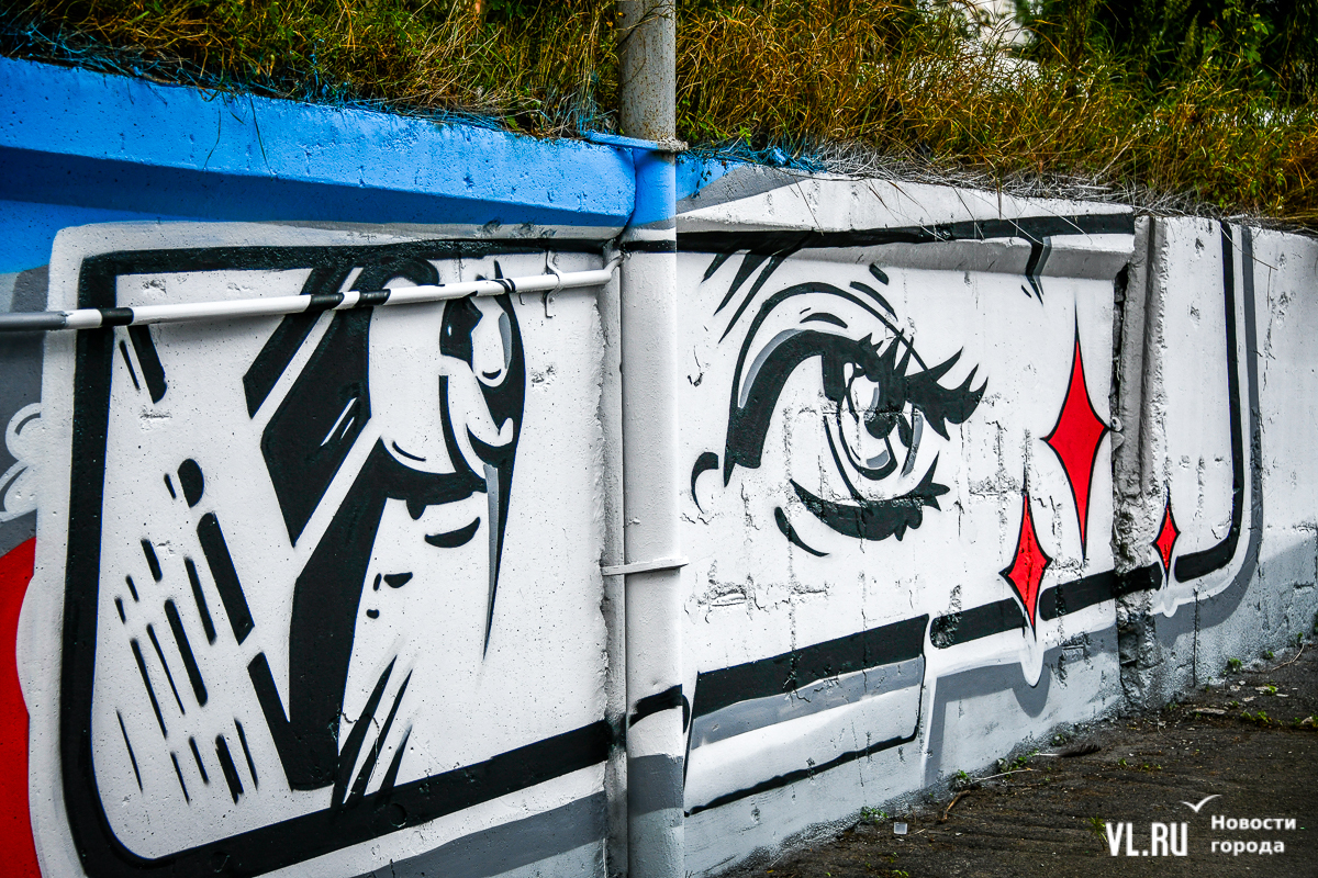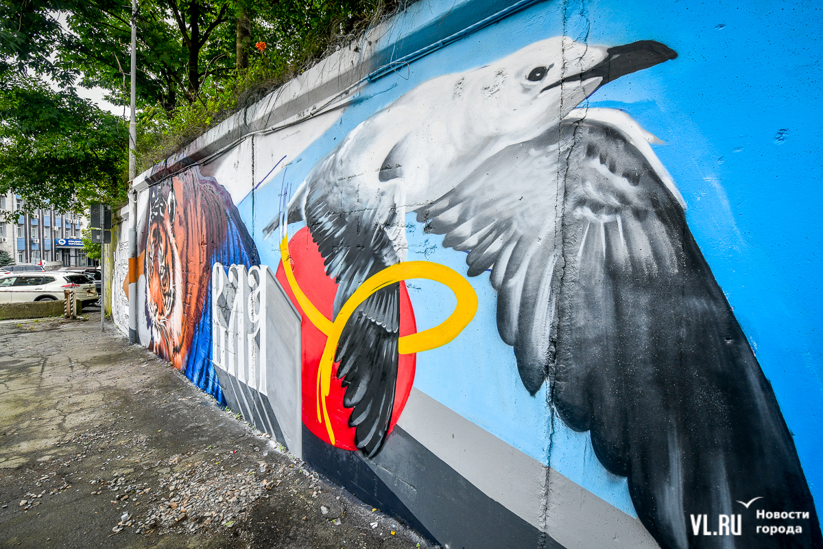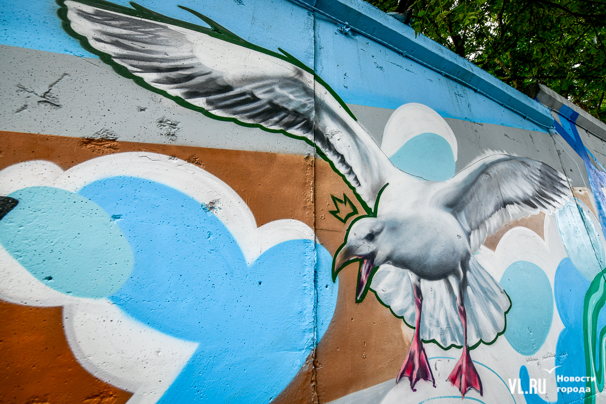Мурал украсил ещё одну подпорную стену Владивостока. Это подарок городу от компании «Ист-Вэст», которая находится в двух шагах от арт-объекта на Стрельникова. Работу выполнила команда Artel Squad. Люди и звери, «тачки» и подъёмные краны, одуванчики и камбала – подпорная стена тянется вдоль тротуара на 90 метров, так что вместилось многое.