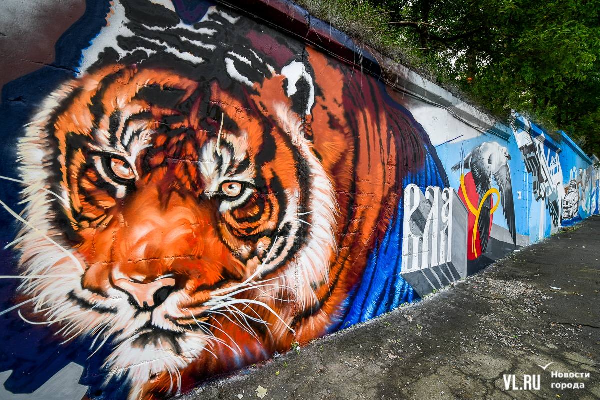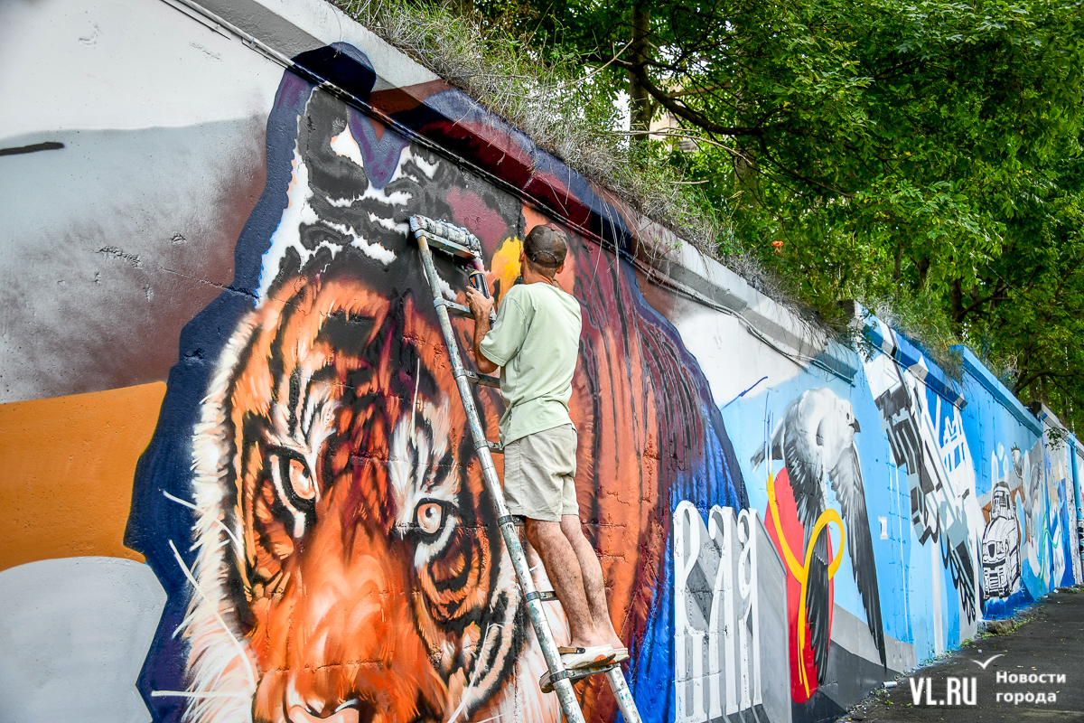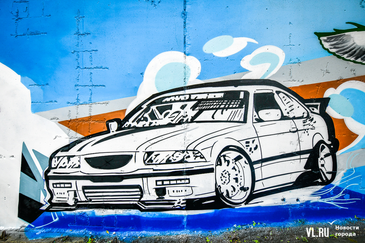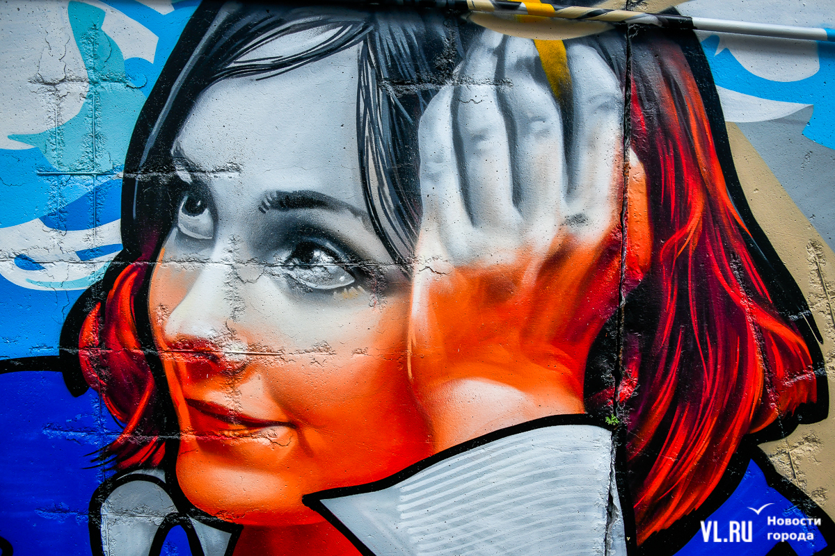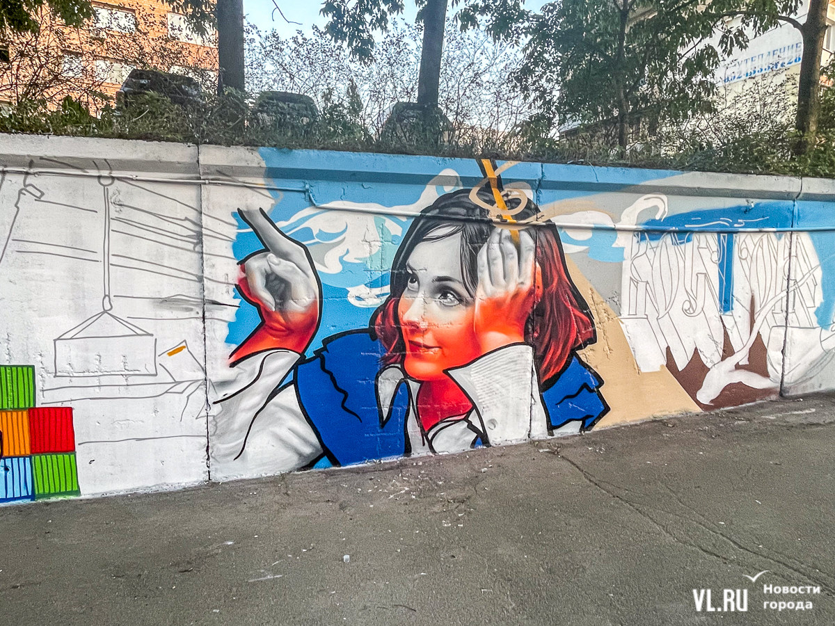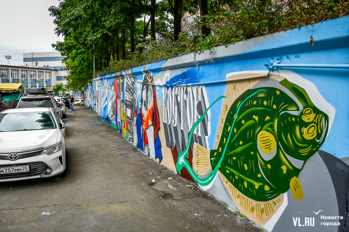 Мурал украсил ещё одну подпорную стену Владивостока. Это подарок городу от компании «Ист-Вэст», которая находится в двух шагах от арт-объекта на Стрельникова. Работу выполнила команда Artel Squad. Люди и звери, «тачки» и подъёмные краны, одуванчики и камбала – подпорная стена тянется вдоль тротуара на 90 метров, так что вместилось многое.