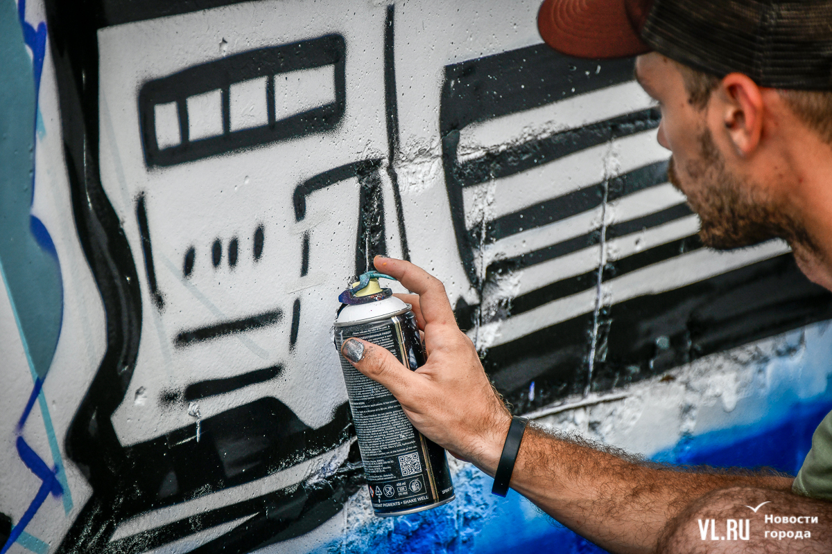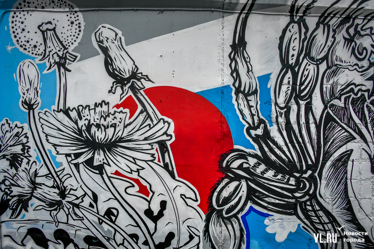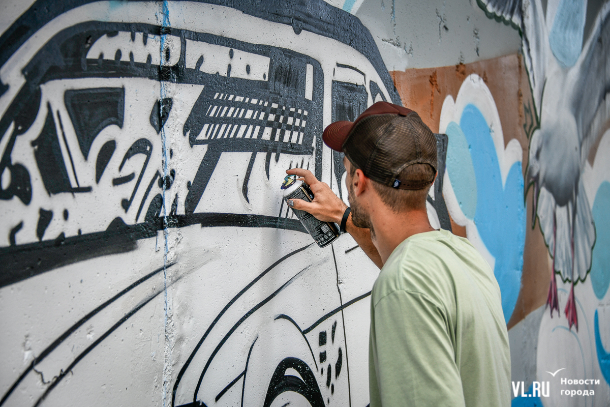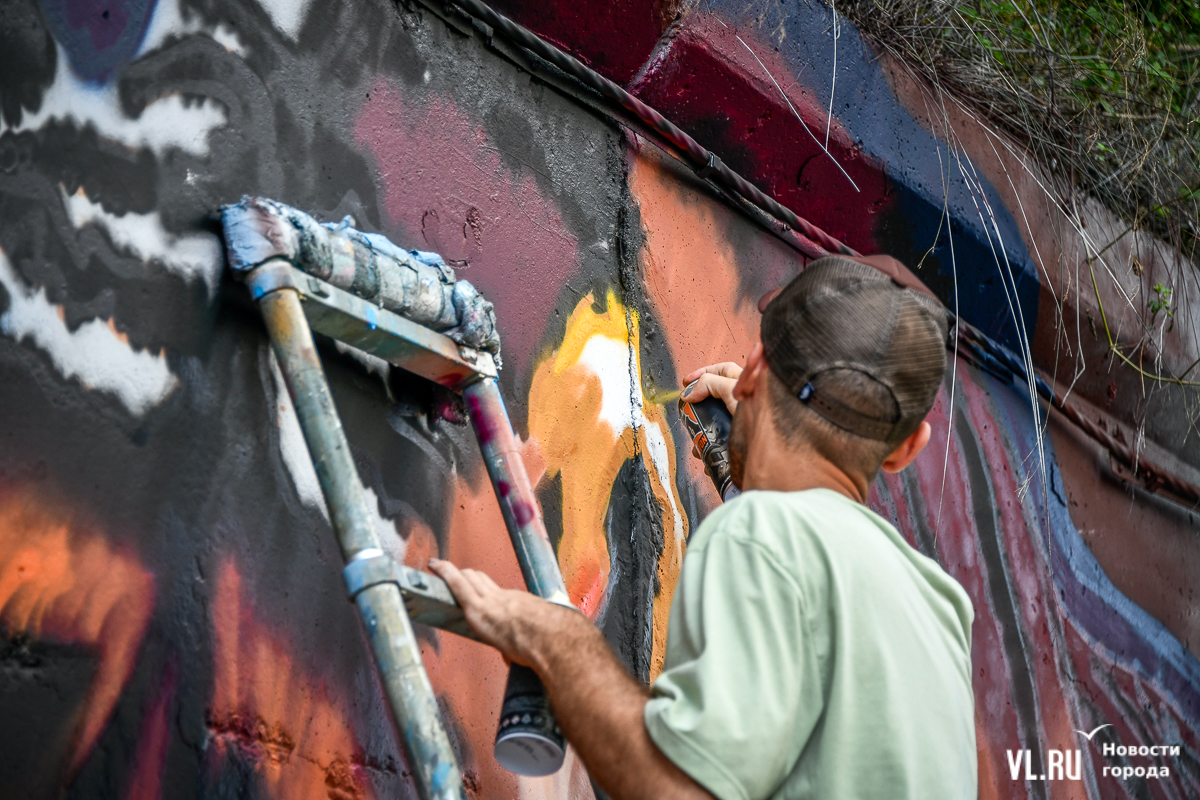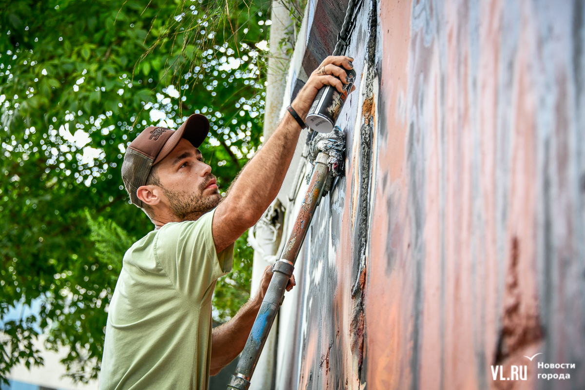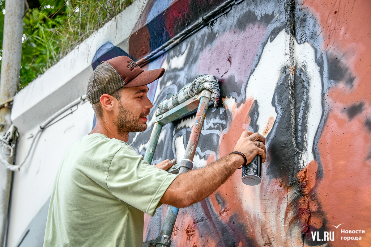 Павел Feat – одноклассник Виктора, вместе начинали рисовать граффити ещё в восьмом классе, вместе поступили в ДВФУ. Но Павел после университета уехал в Шанхай и там остался. Он вместе с артелью, но чаще дистанционно. Хотя на этом мурале работал сам – как раз приехал во Владивосток. И эскиз арт-объекта сделал тоже он.
