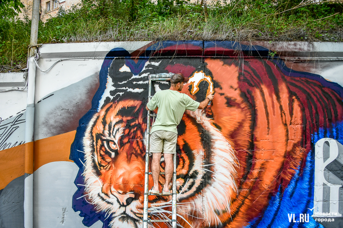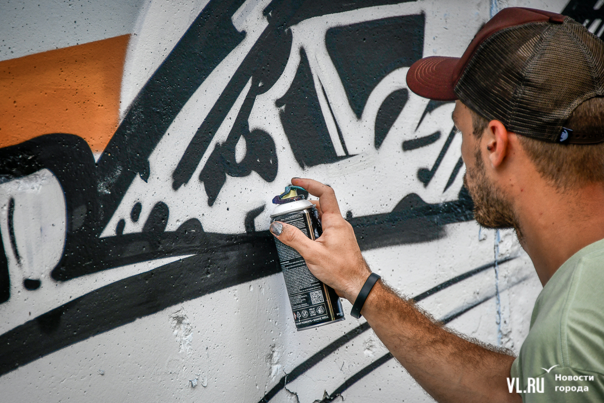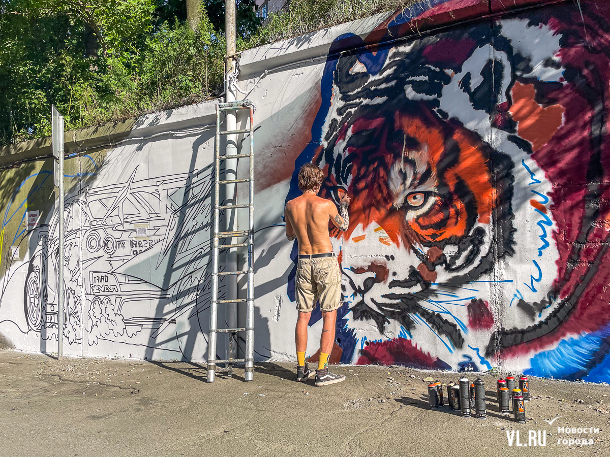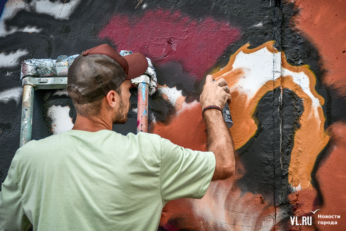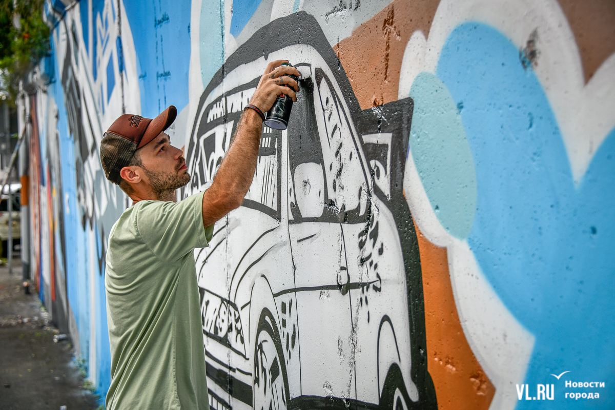Павел Feat – одноклассник Виктора, вместе начинали рисовать граффити ещё в восьмом классе, вместе поступили в ДВФУ. Но Павел после университета уехал в Шанхай и там остался. Он вместе с артелью, но чаще дистанционно. Хотя на этом мурале работал сам – как раз приехал во Владивосток. И эскиз арт-объекта сделал тоже он.