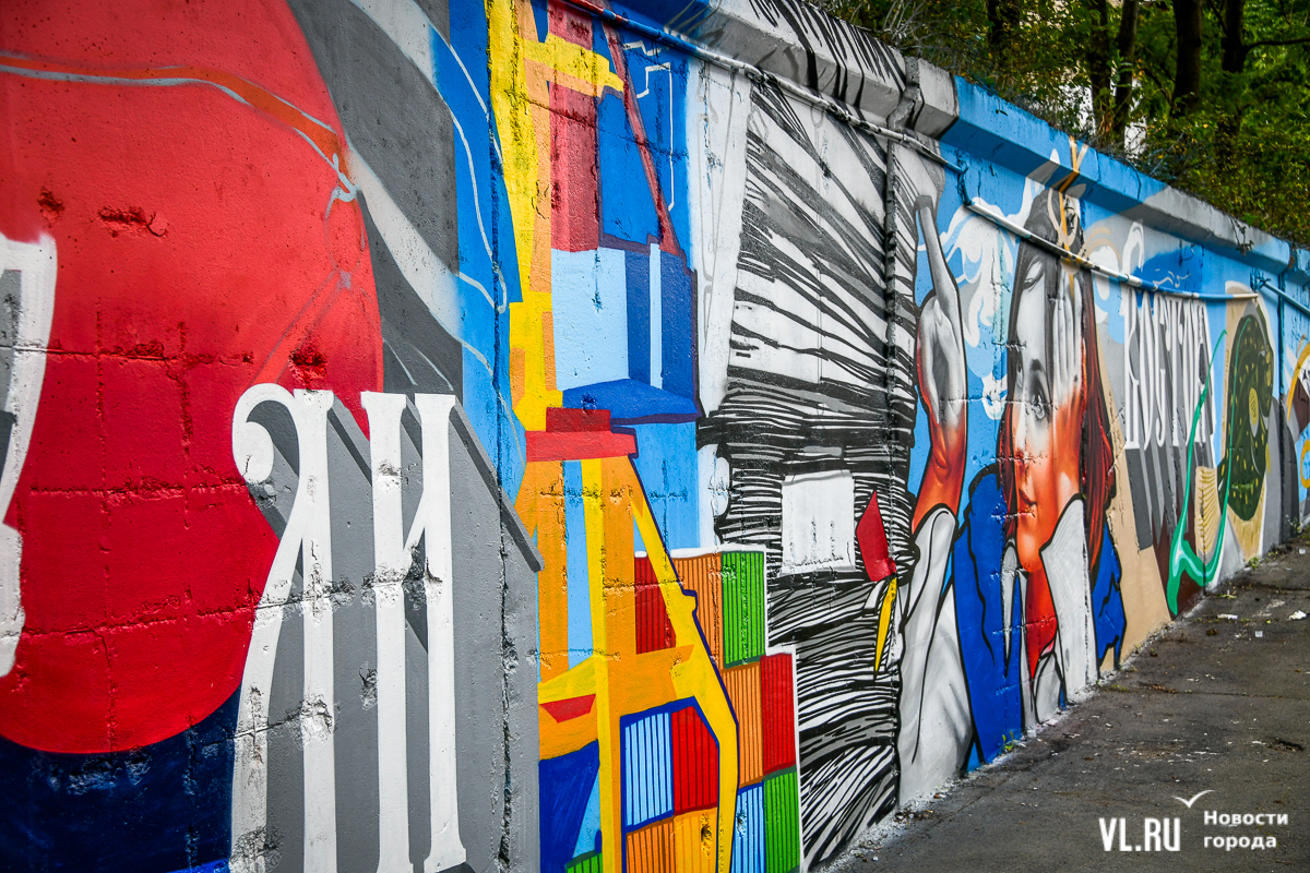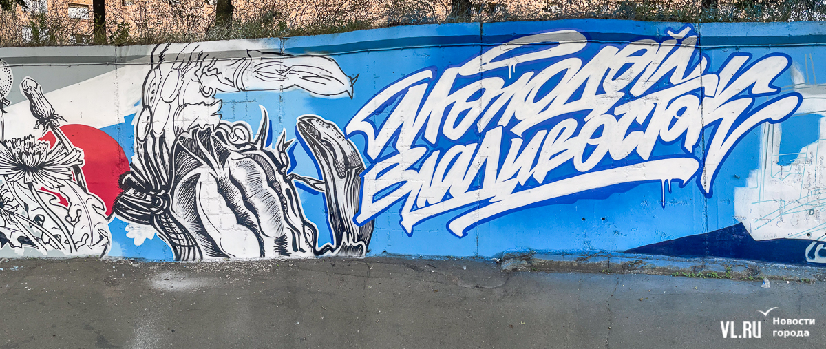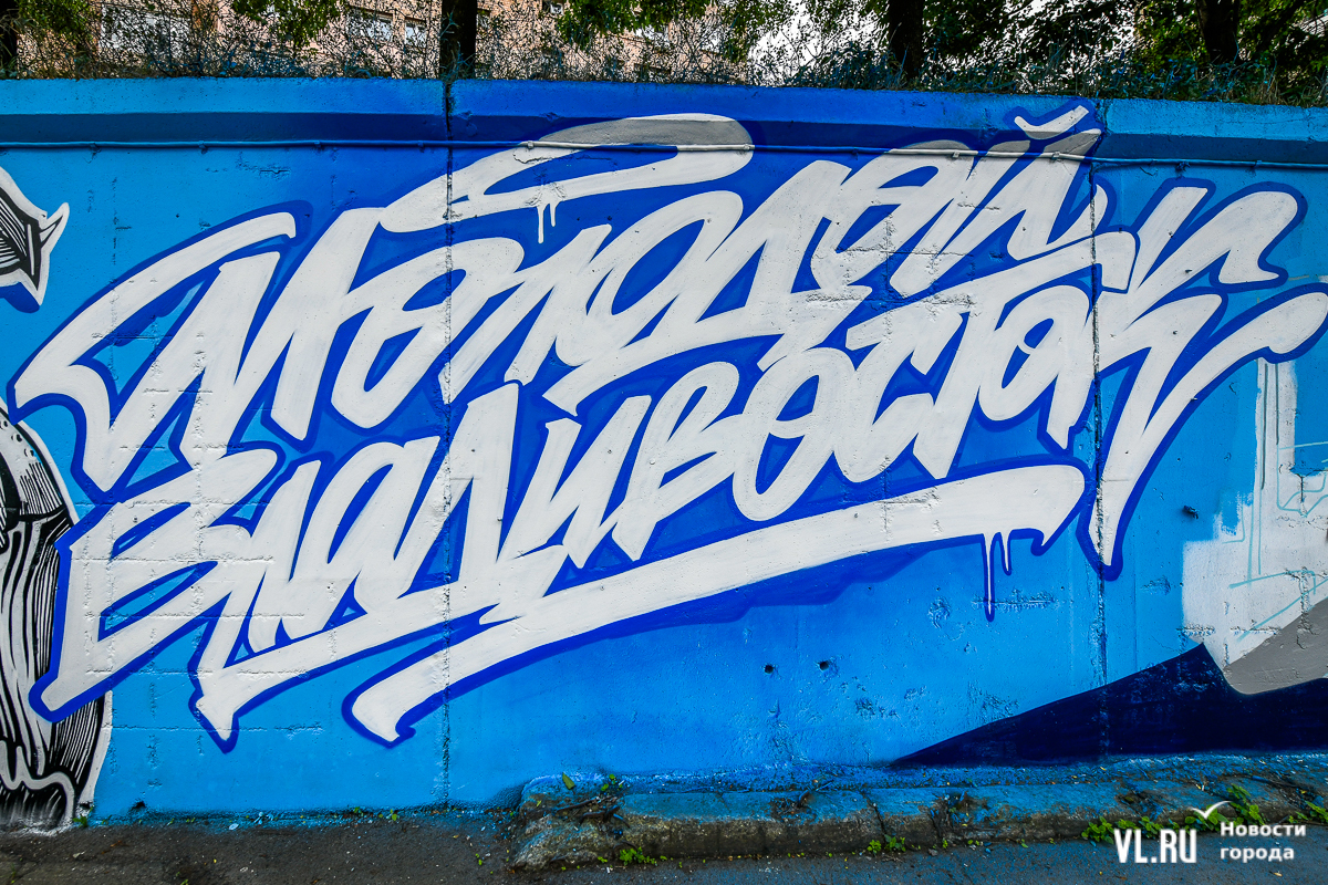 Буквы здесь тоже есть – в центре надпись «молодой Владивосток», и ещё одно название города разбито по всей длине на фрагменты и прописано в старославянском стиле.