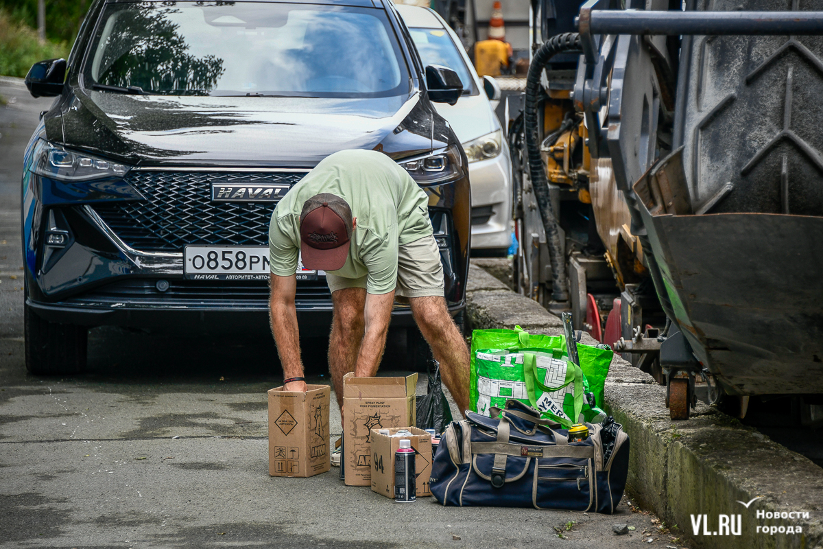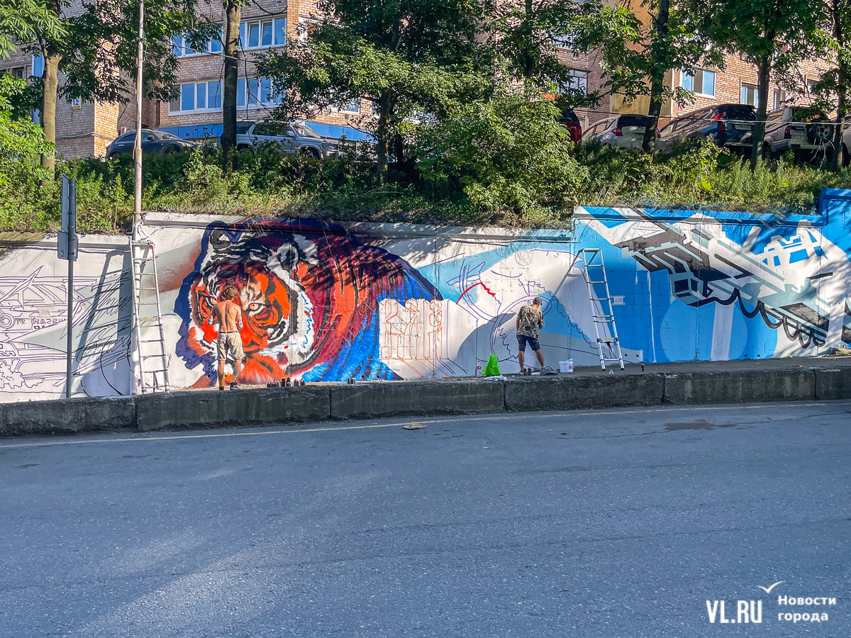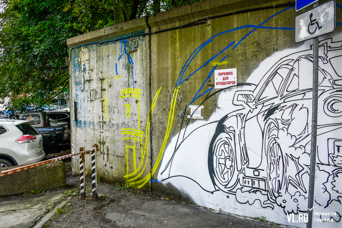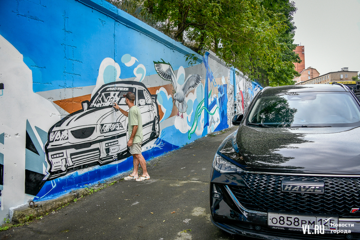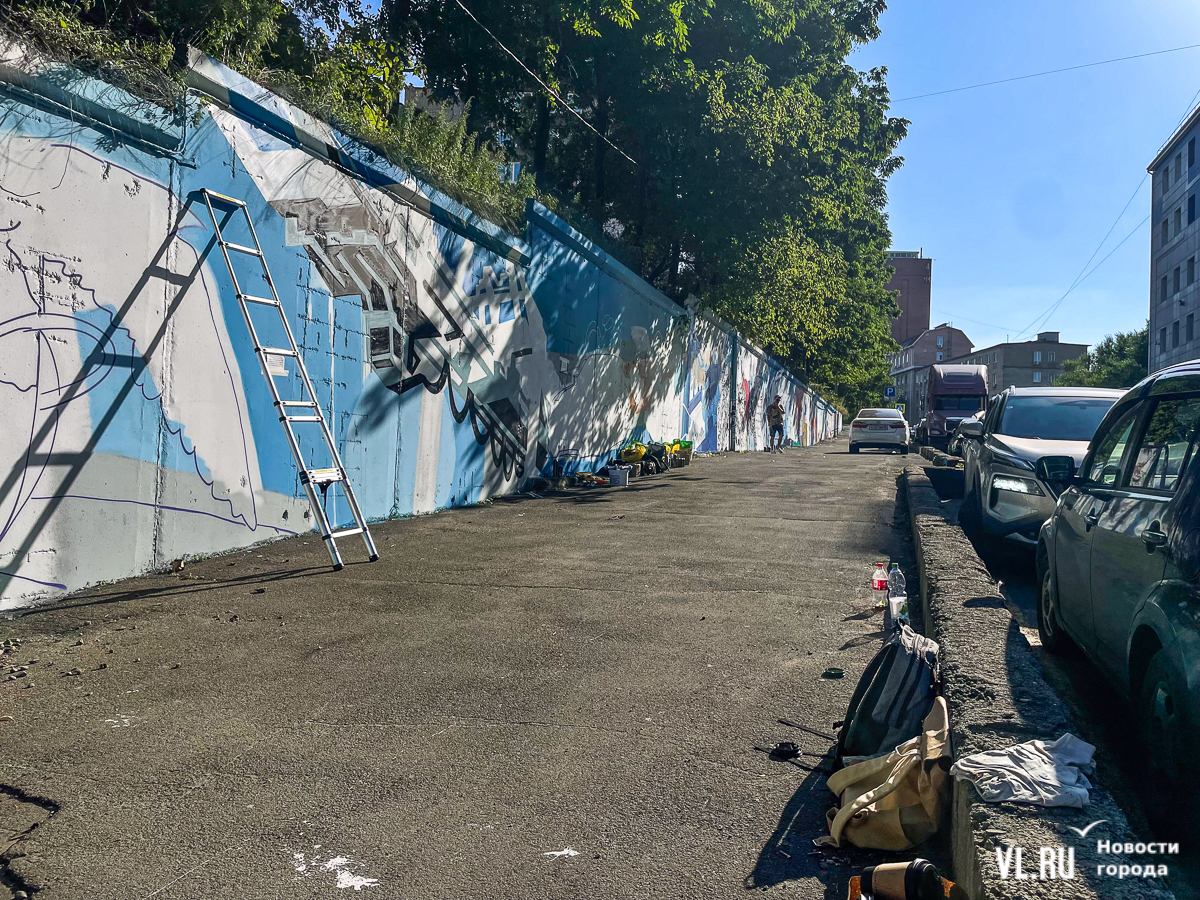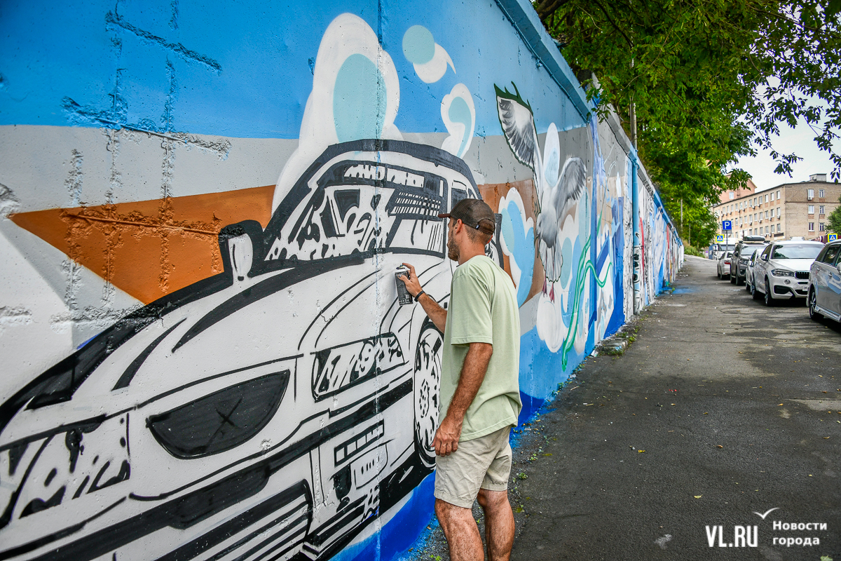 Мурал – о молодом Владивостоке, о морском порте, который как раз рядом. Названия работе художники пока не придумали. Арт-объект можно хорошо разглядеть, когда пустеют обочины – улица сильно запаркована. Из-за этого художники урывками дописывают маяк в левой части – мешают машины. Зато работа получается и к месту, и о месте – эти автомобили приходят в регион через порт, которому посвящён арт-объект.