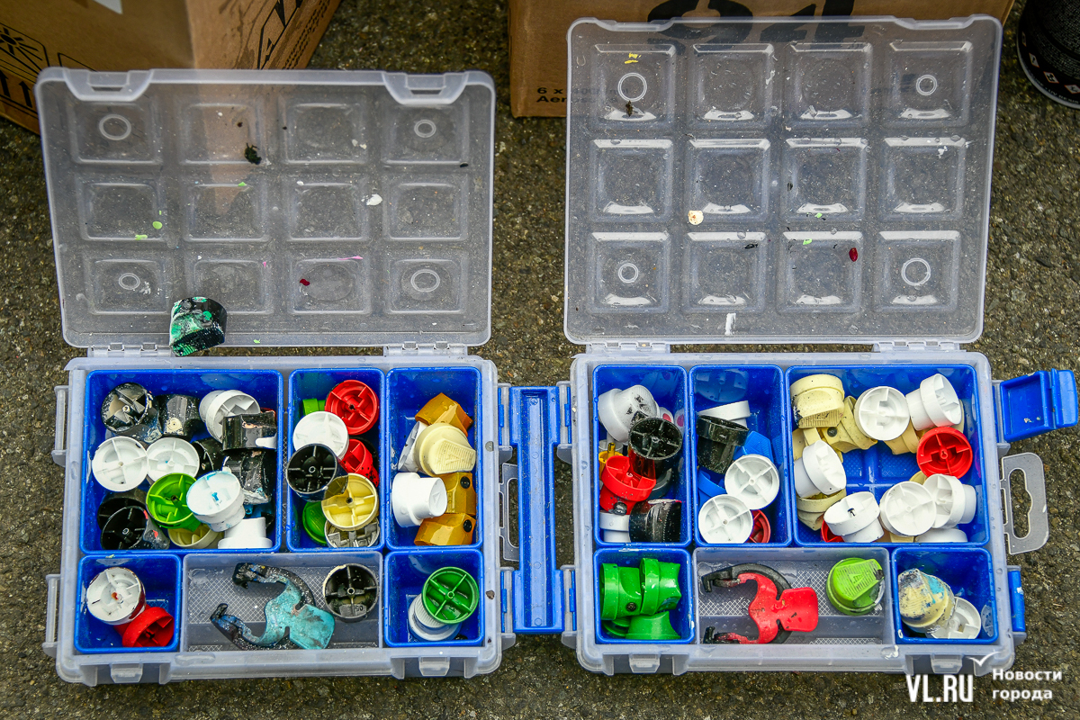 «Во-первых, они забиваются, – объясняет Виктор. – Я раз в месяц устраиваю им ацетоновые ванны – три дня очищаю в пятилитровой банке. Ну и отверстия разные – одна выдаёт плоскую линию, другая – чёткую, ровную, я обычно ей рисую. А эта стандартная – круглая, но с размытым контуром. А такая регулирует давление – можно пальцем корректировать силу нажатия».