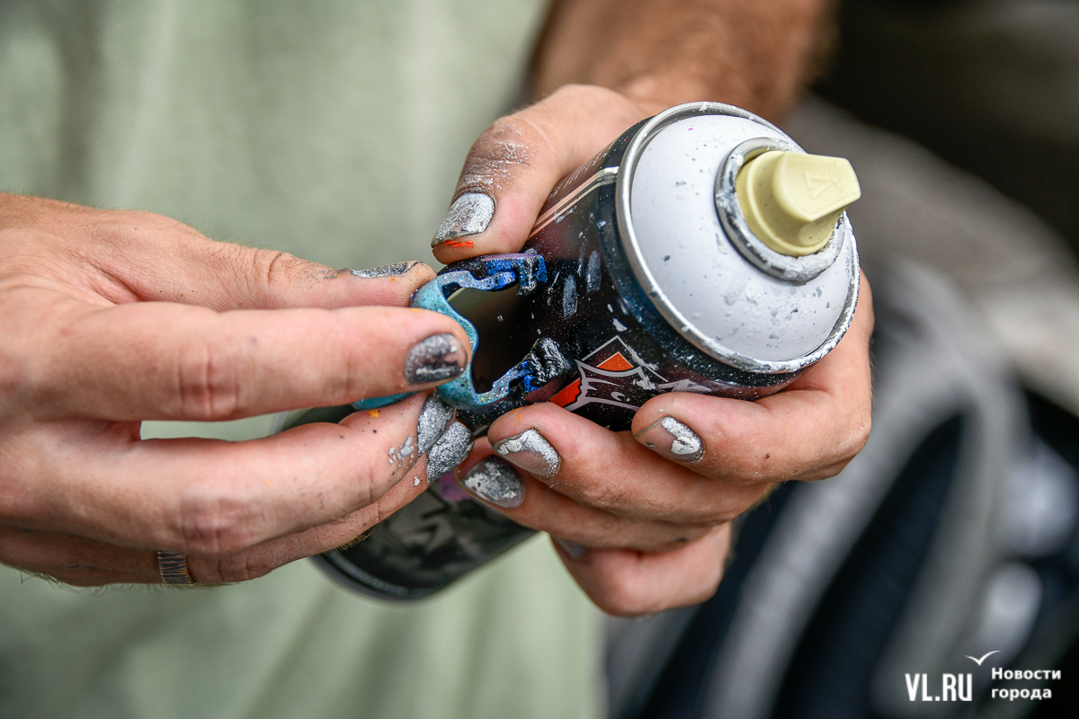 Самой сложной стала подготовка стены. Она была покрыта мхом, и всё пришлось очищать болгаркой – а это примерно 250-300 «квадратов». Потом нанесли праймер, эскиз – и непосредственно мурал. Художники работают акриловыми аэрозольными красками. Рядом стоят целых две коробки с кэпами – насадками на баллончики.