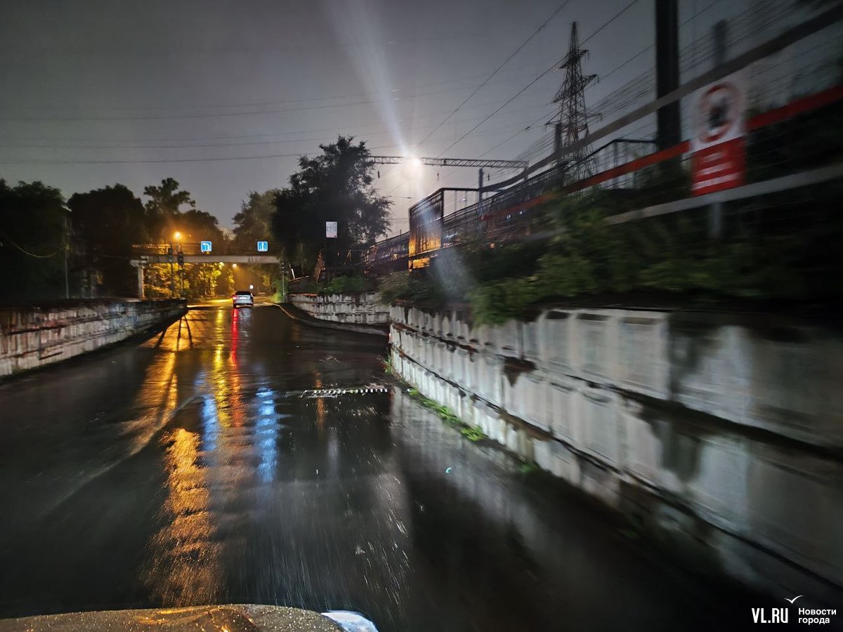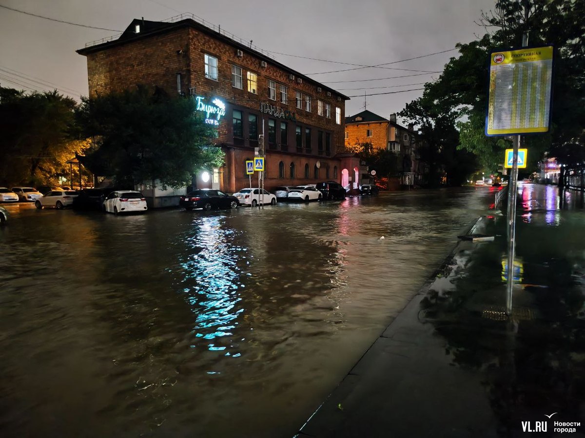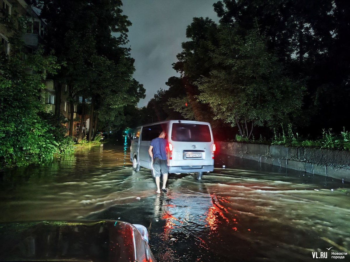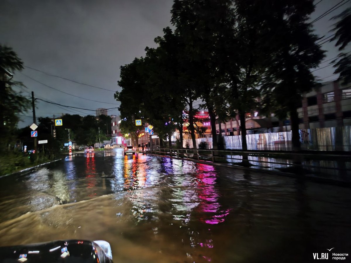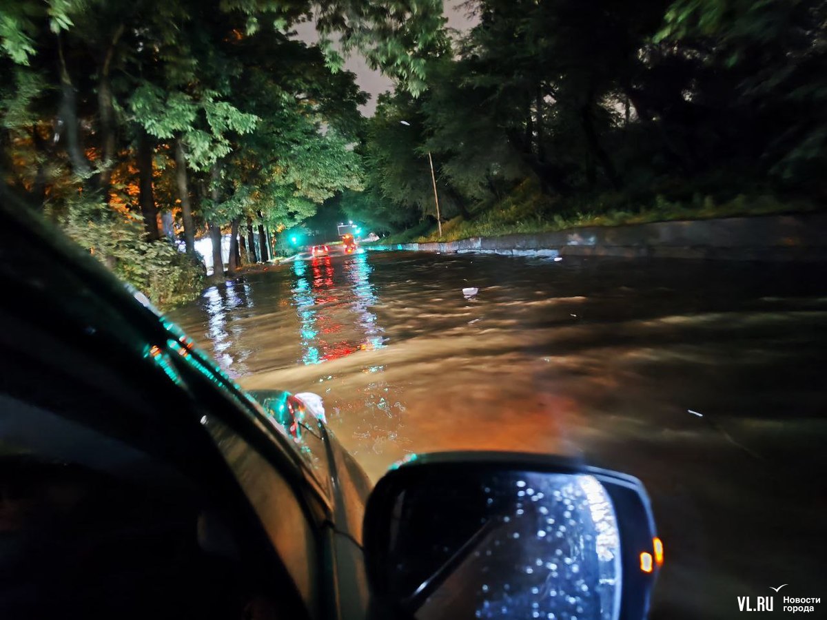 Вода во Владивостоке почти везде сошла, но улица Спортивная до сих пор затоплена. Воды местами по колено, причём в обе стороны – и к Калинина, и к Луговой. Некоторые машины, доезжая до затопленного участка, не решаются ехать дальше и разворачиваются, двигаясь по односторонней против движения.