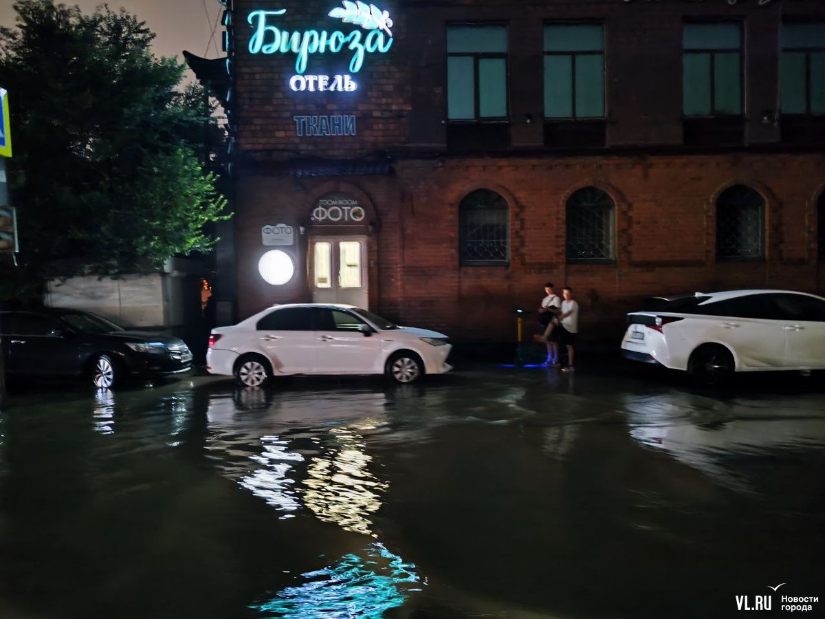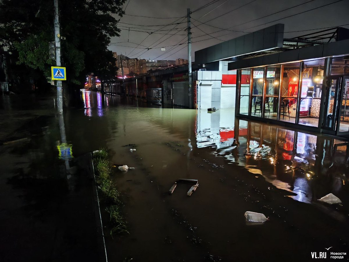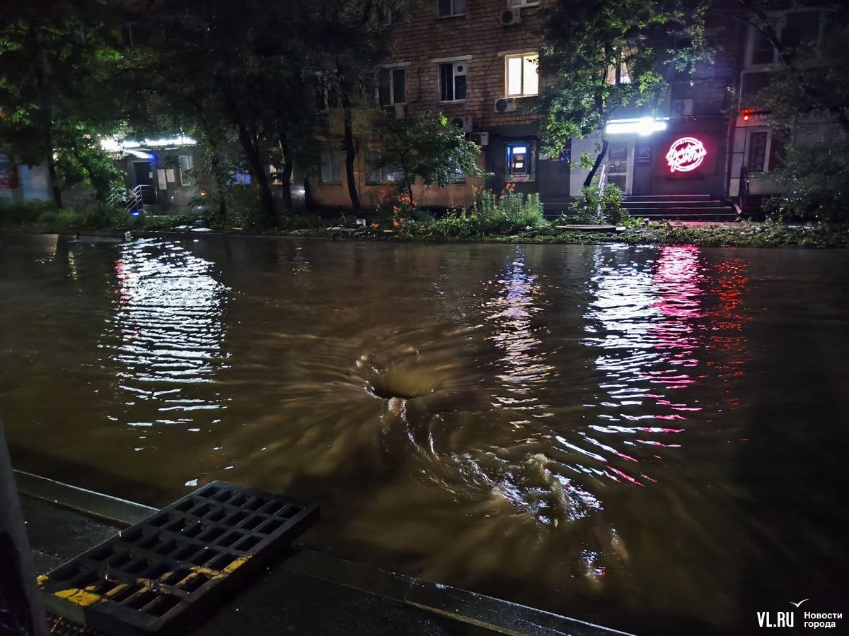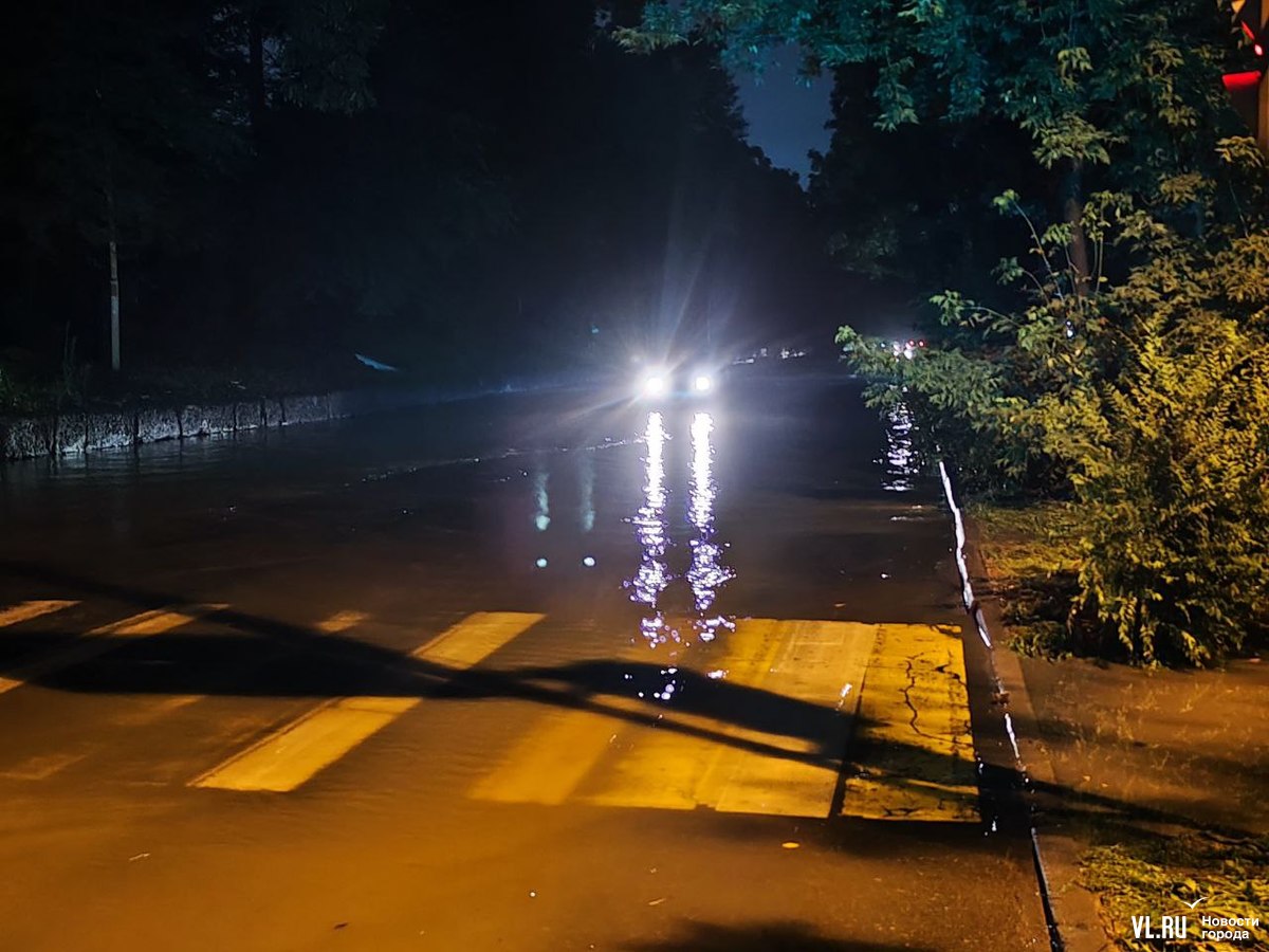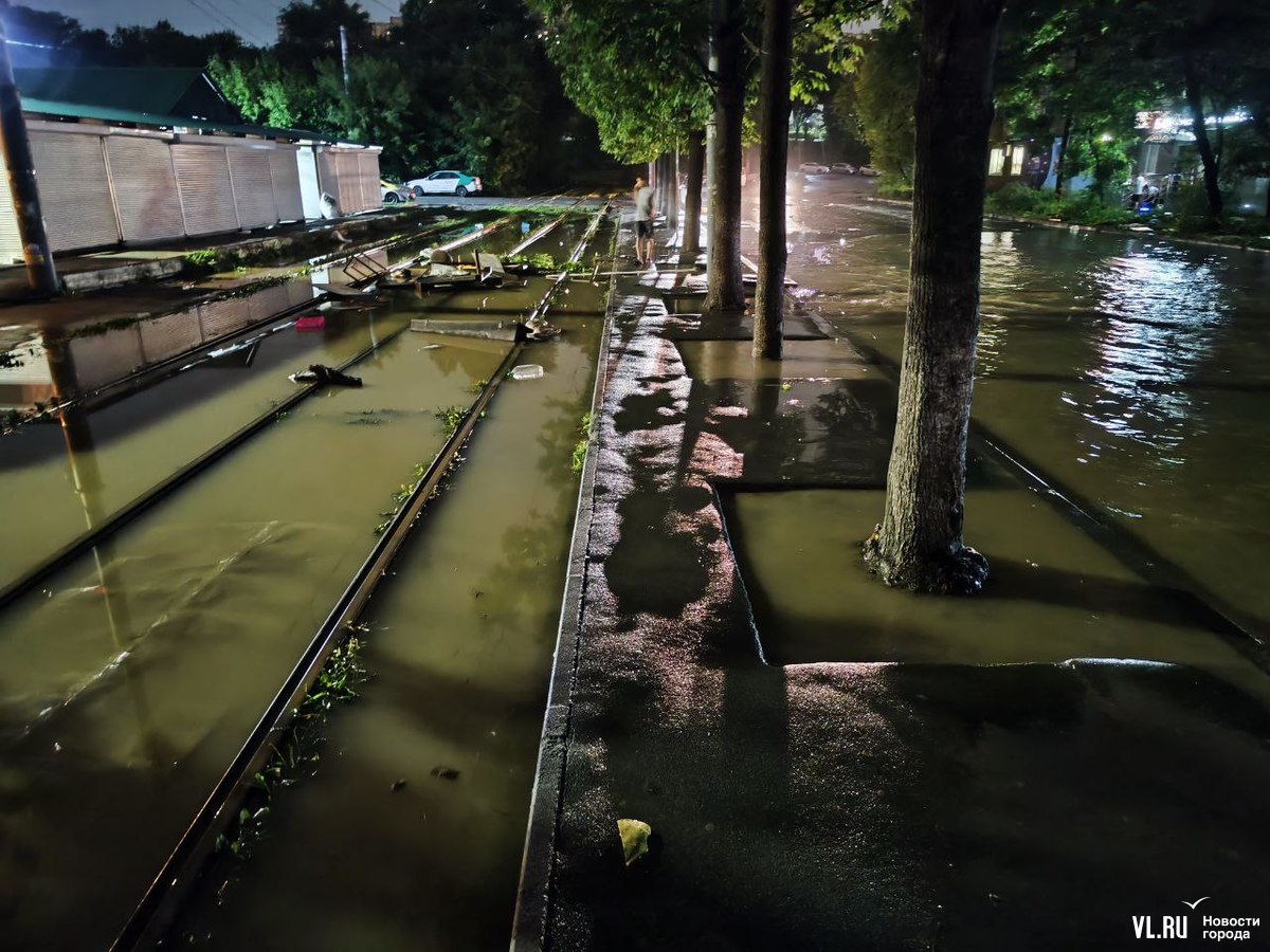 Вода во Владивостоке почти везде сошла, но улица Спортивная до сих пор затоплена. Воды местами по колено, причём в обе стороны – и к Калинина, и к Луговой. Некоторые машины, доезжая до затопленного участка, не решаются ехать дальше и разворачиваются, двигаясь по односторонней против движения.