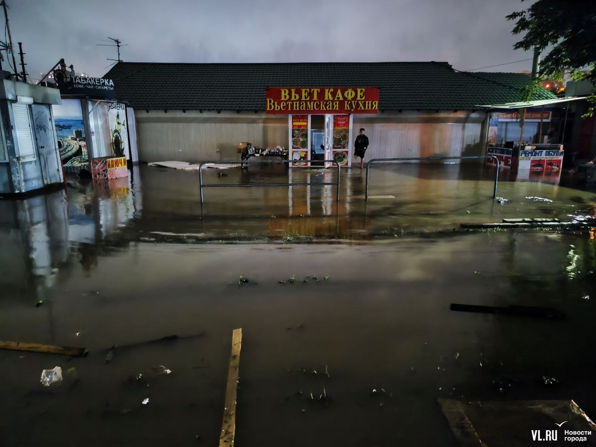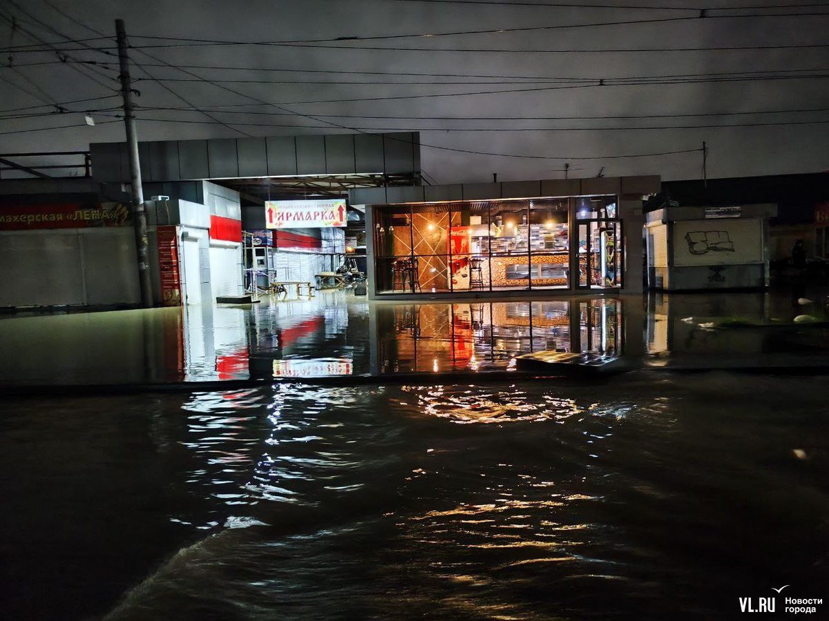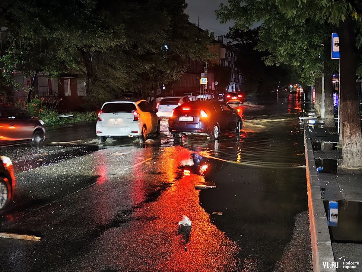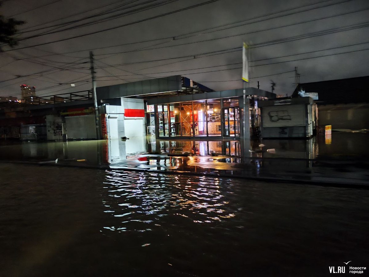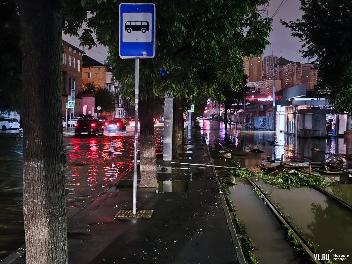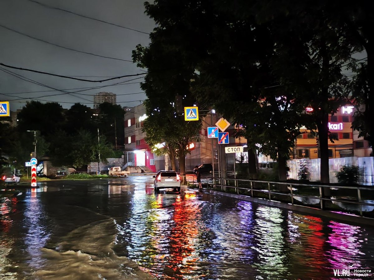 Вода во Владивостоке почти везде сошла, но улица Спортивная до сих пор затоплена. Воды местами по колено, причём в обе стороны – и к Калинина, и к Луговой. Некоторые машины, доезжая до затопленного участка, не решаются ехать дальше и разворачиваются, двигаясь по односторонней против движения.