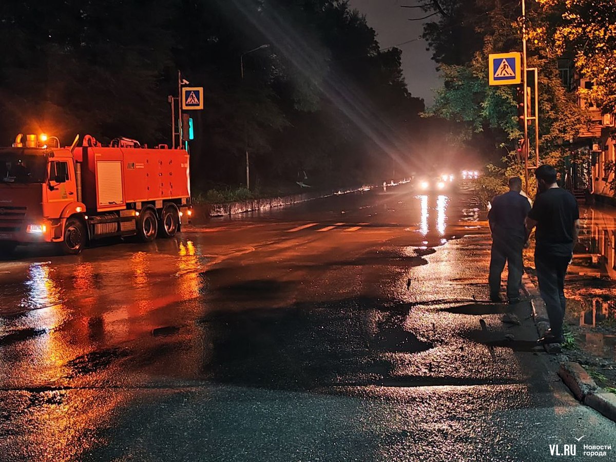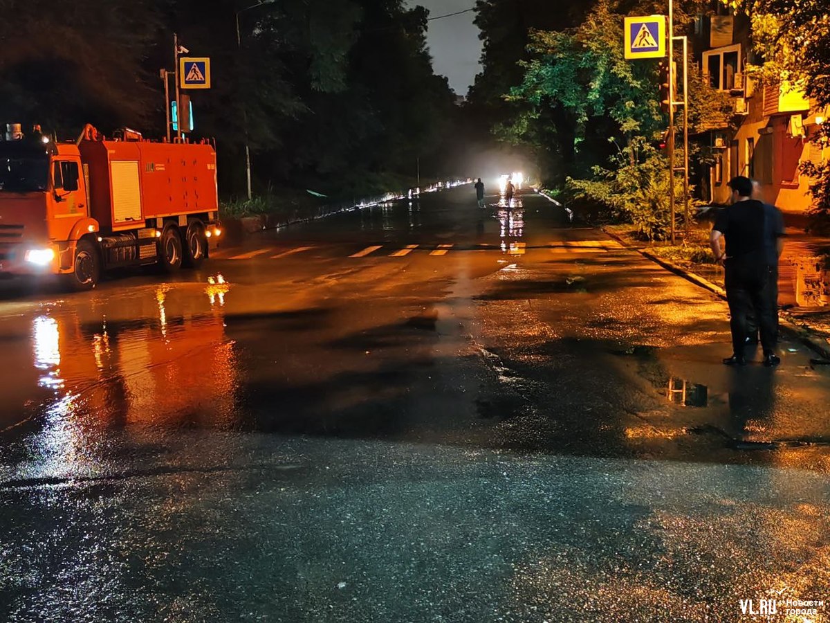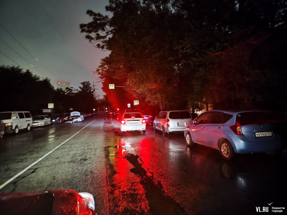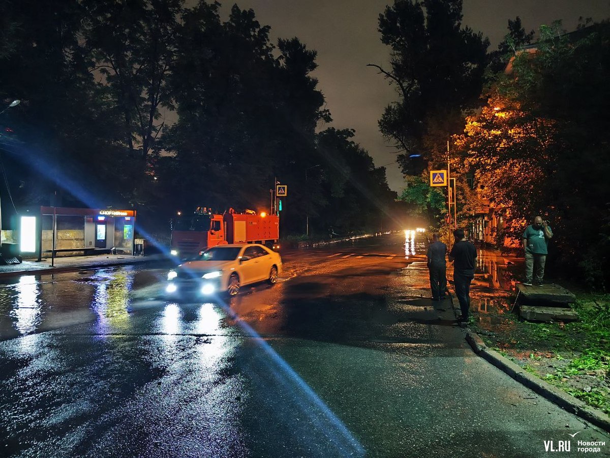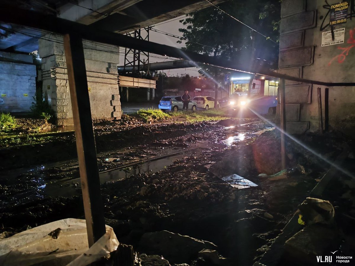 Вода во Владивостоке почти везде сошла, но улица Спортивная до сих пор затоплена. Воды местами по колено, причём в обе стороны – и к Калинина, и к Луговой. Некоторые машины, доезжая до затопленного участка, не решаются ехать дальше и разворачиваются, двигаясь по односторонней против движения.