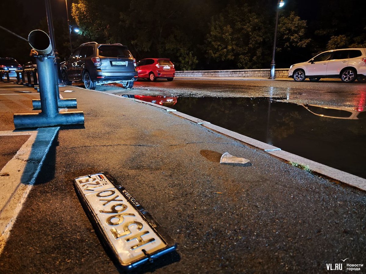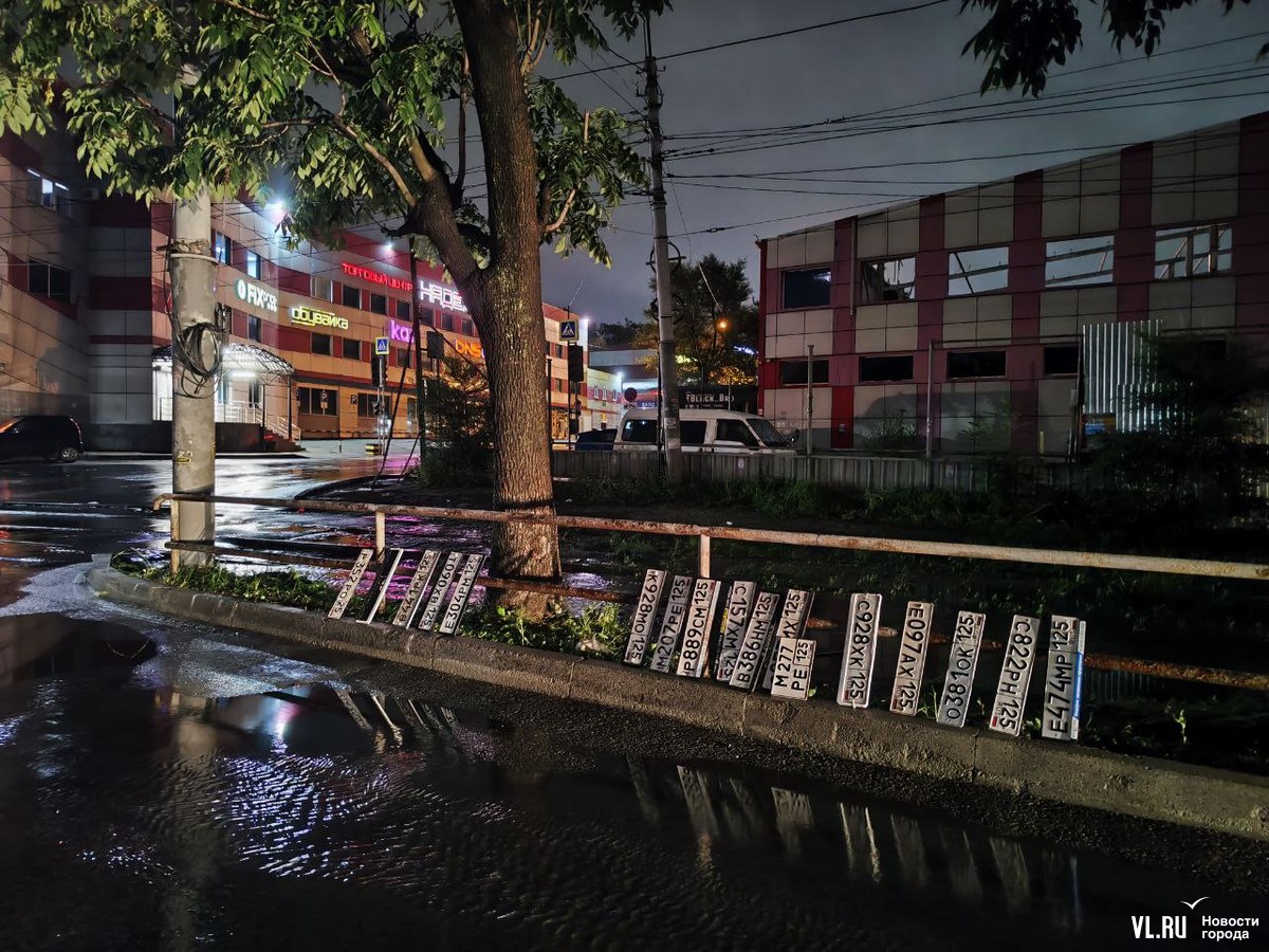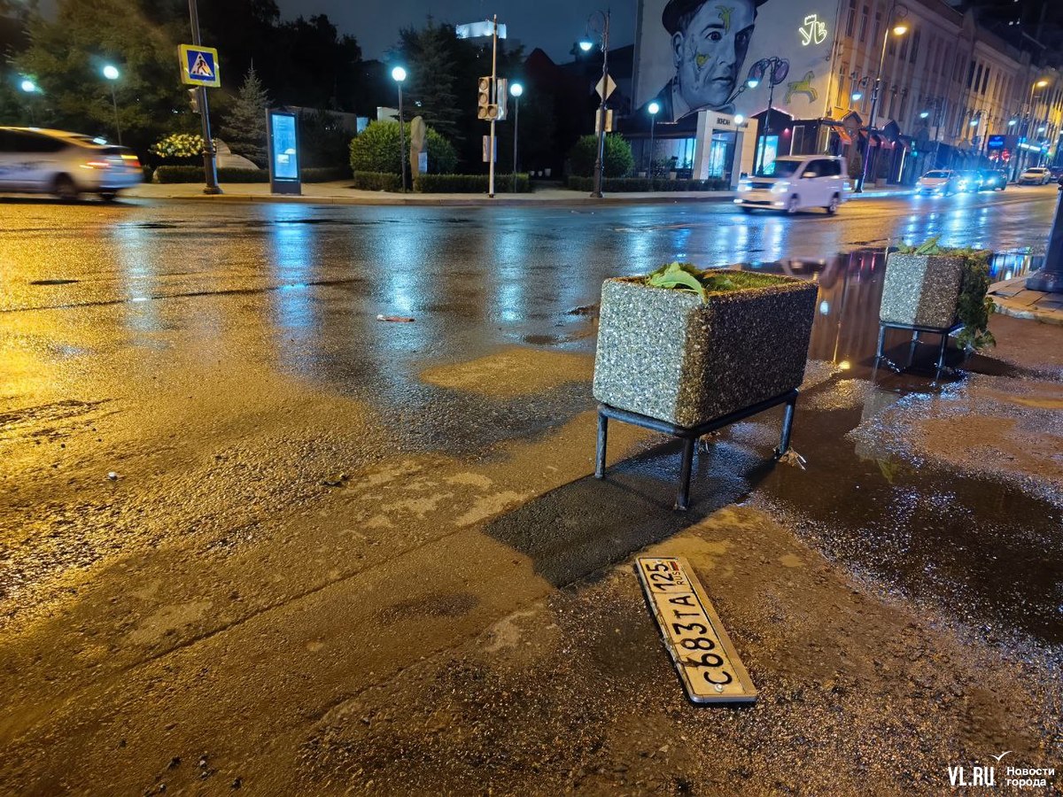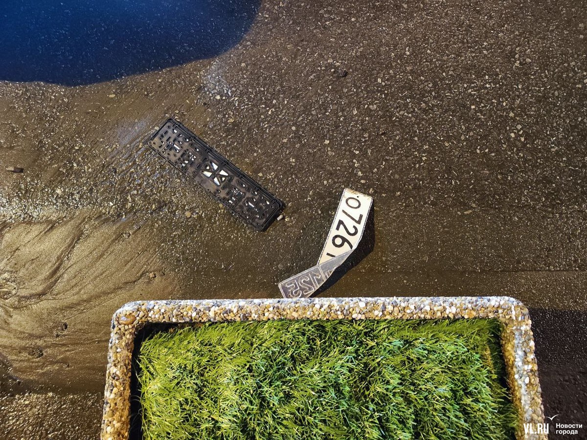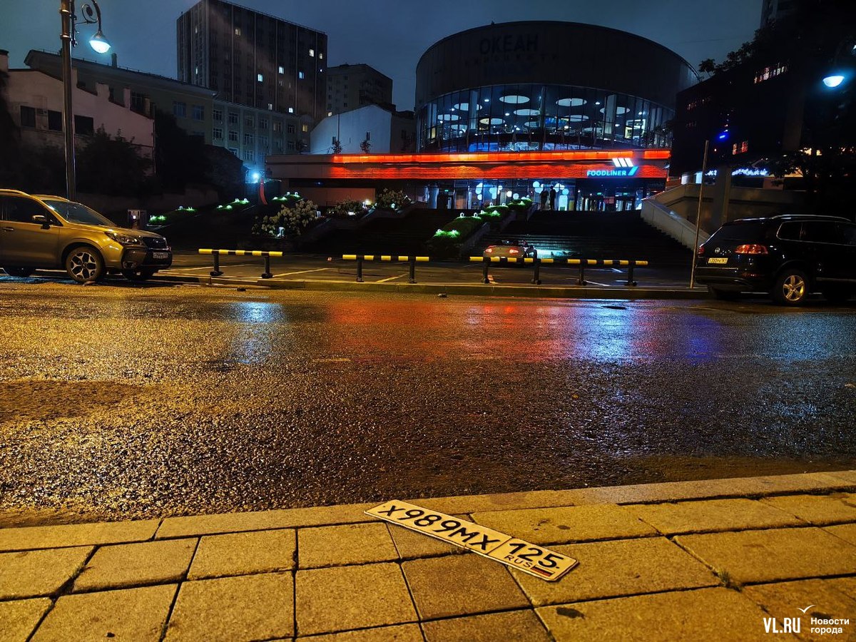 На Пограничной, где вечером катались на сапах, сейчас тоже сухо. Решётки ливнёвок открыты, всё давно утекло в них. Валяется три автомобильных номера, а возле пешеходного перехода на «Динамо» стоит брошенный автомобиль посреди дороги. Возле кинотеатра «Океан» тоже остались лужи и несколько автомобильных номеров.
