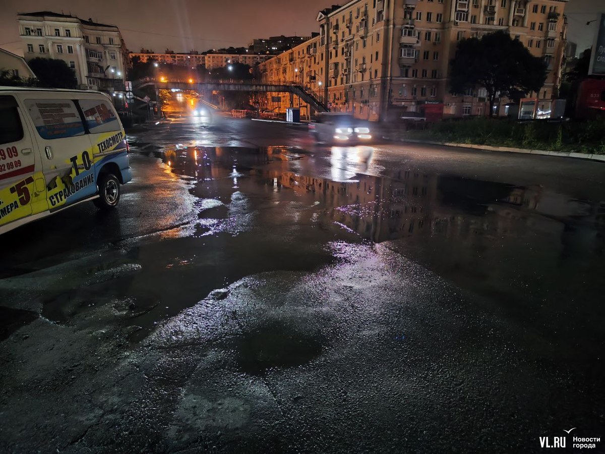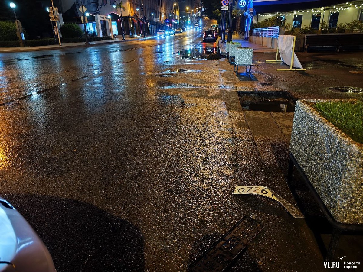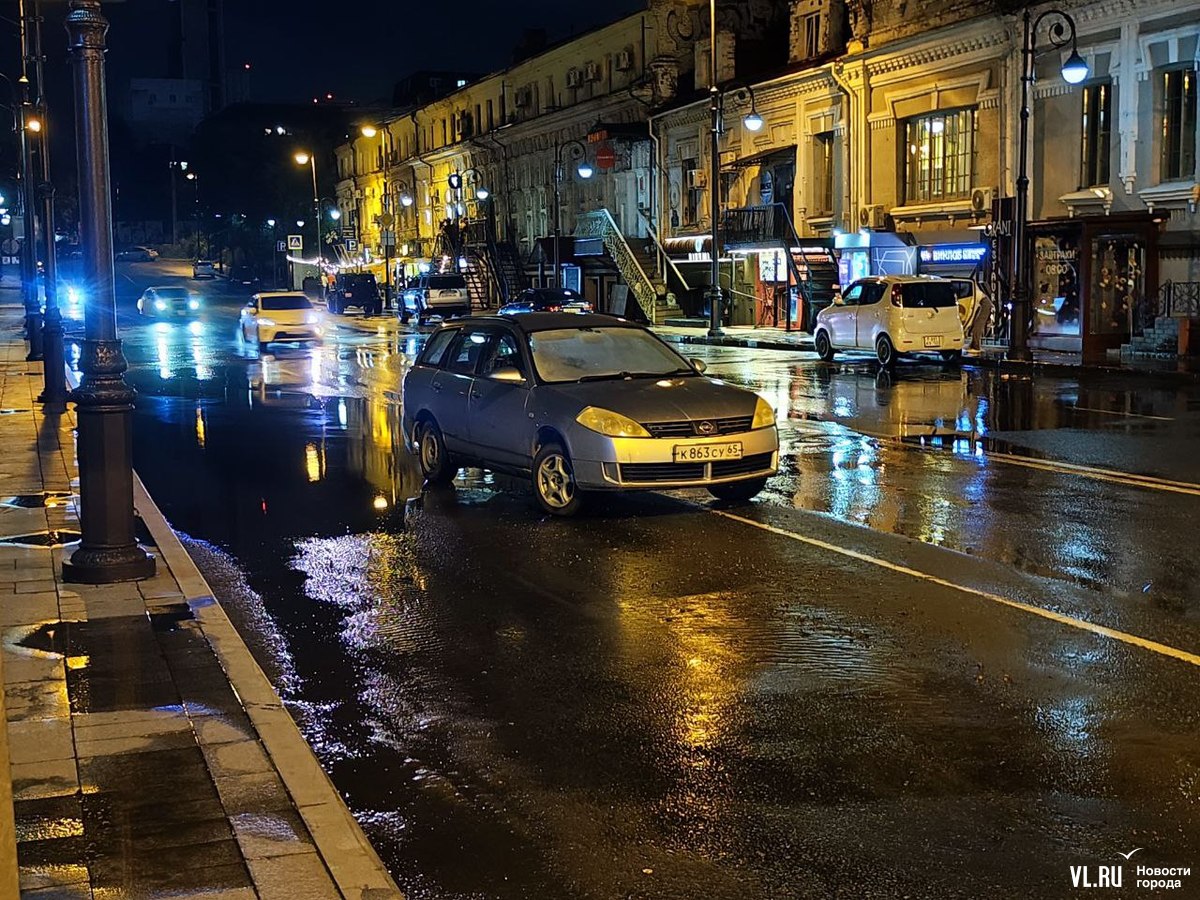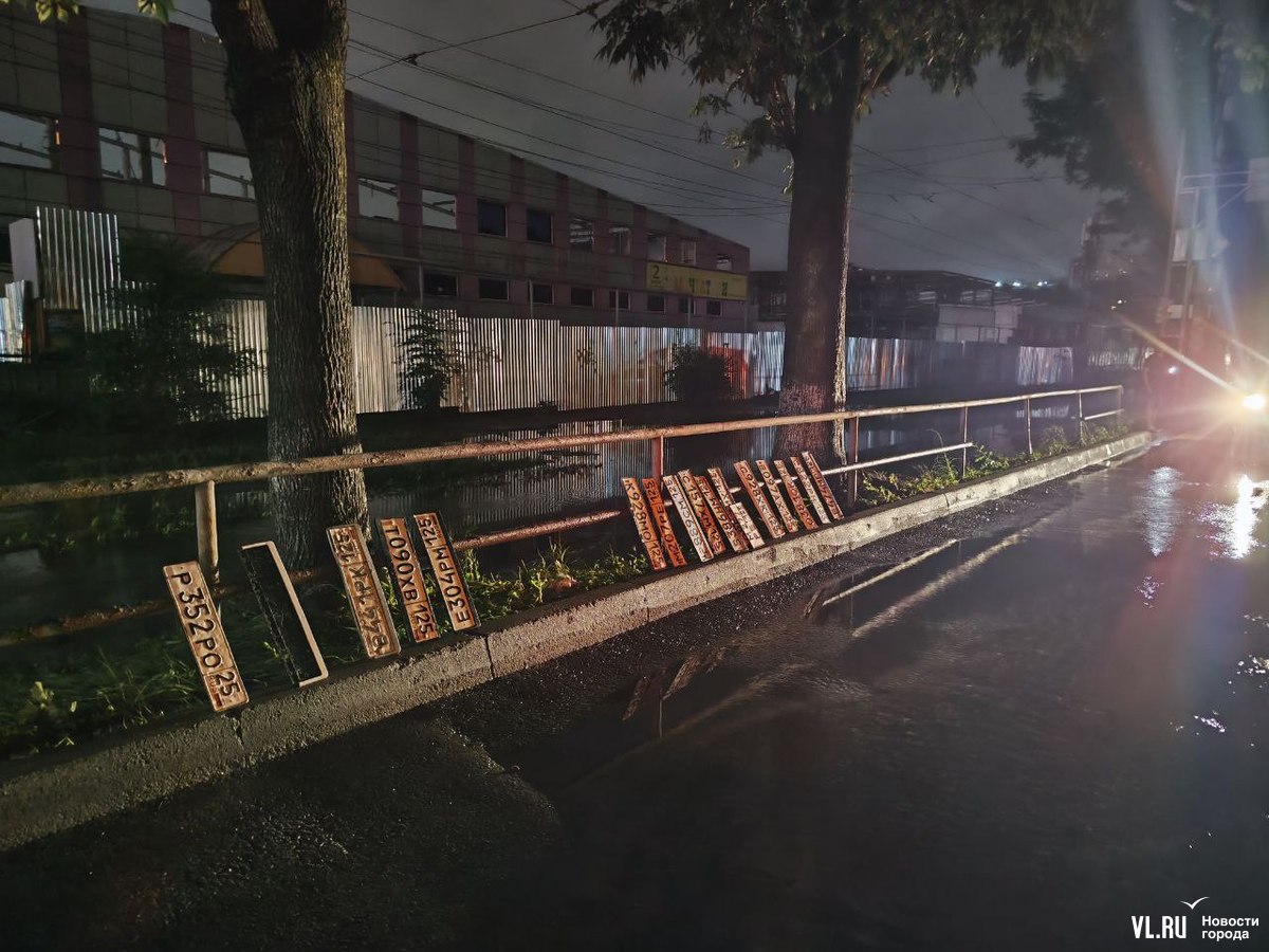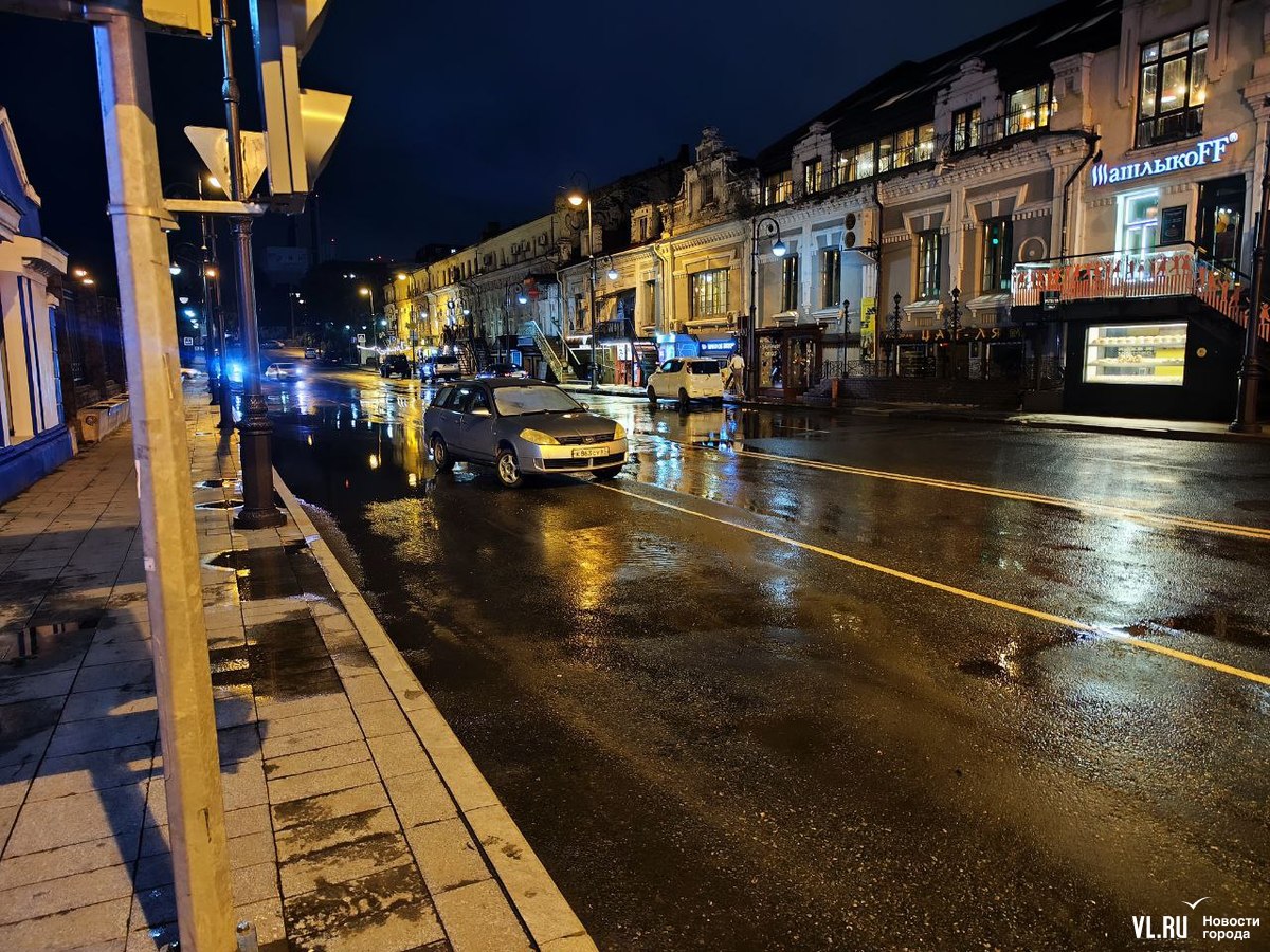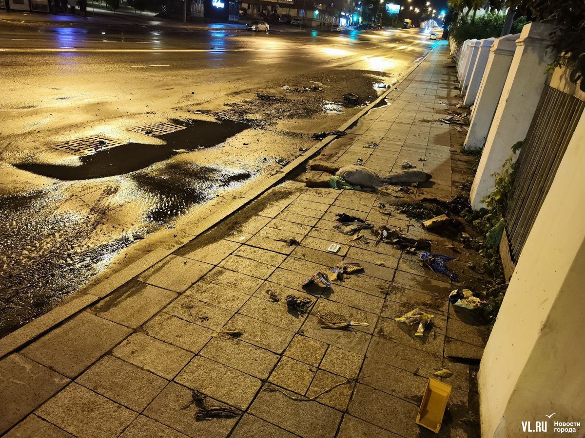 На Пограничной, где вечером катались на сапах, сейчас тоже сухо. Решётки ливнёвок открыты, всё давно утекло в них. Валяется три автомобильных номера, а возле пешеходного перехода на «Динамо» стоит брошенный автомобиль посреди дороги. Возле кинотеатра «Океан» тоже остались лужи и несколько автомобильных номеров.