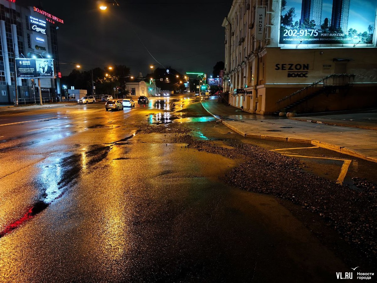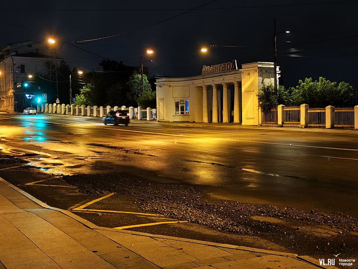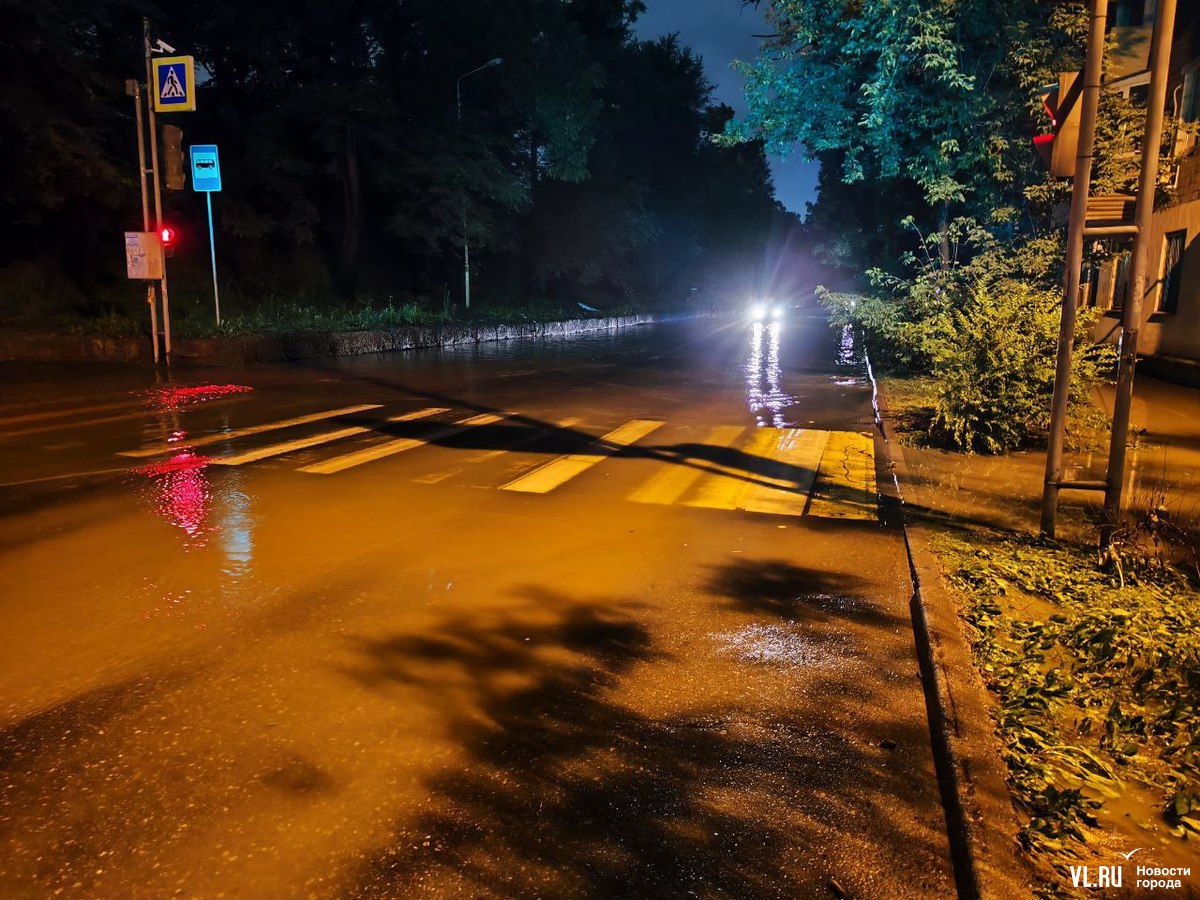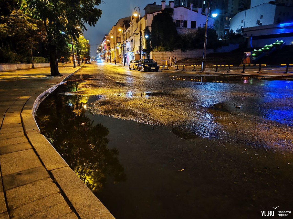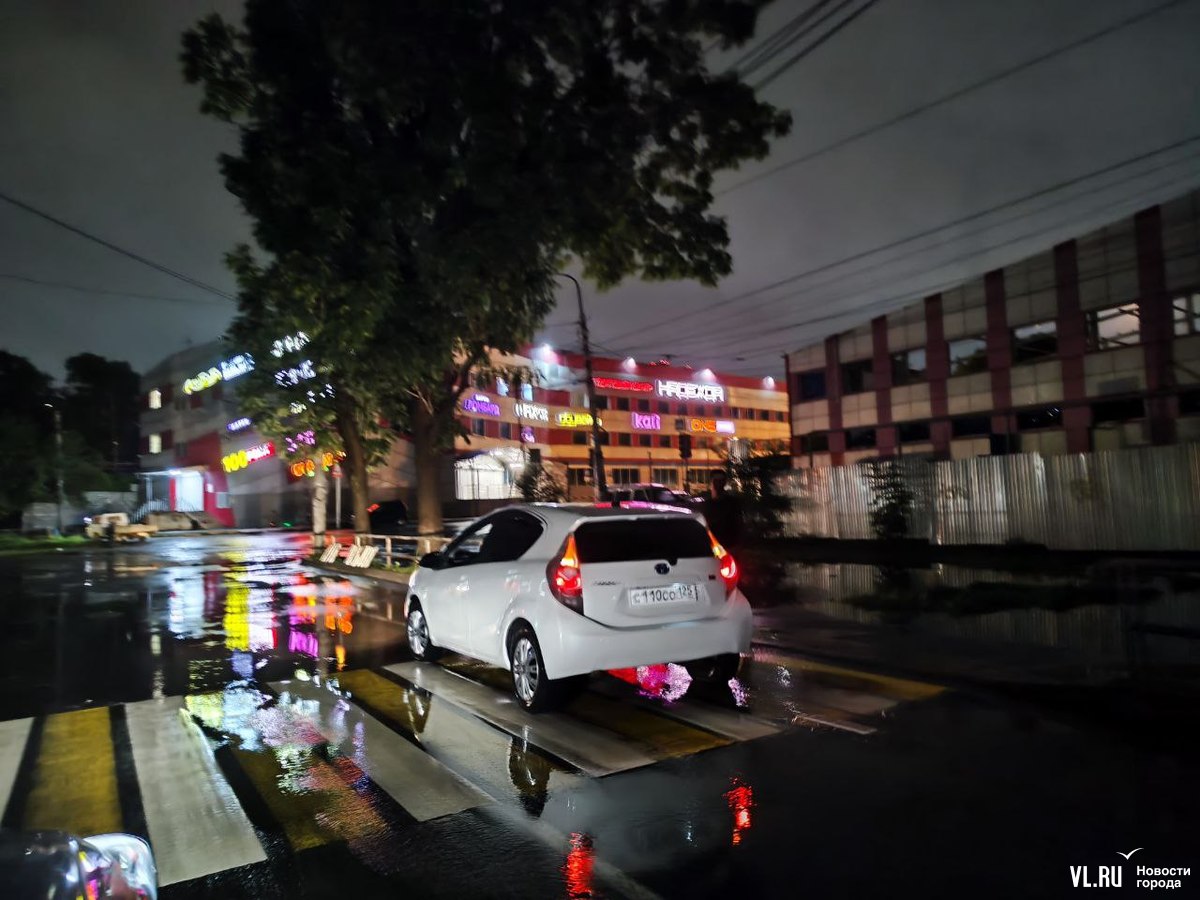 На Пограничной, где вечером катались на сапах, сейчас тоже сухо. Решётки ливнёвок открыты, всё давно утекло в них. Валяется три автомобильных номера, а возле пешеходного перехода на «Динамо» стоит брошенный автомобиль посреди дороги. Возле кинотеатра «Океан» тоже остались лужи и несколько автомобильных номеров.