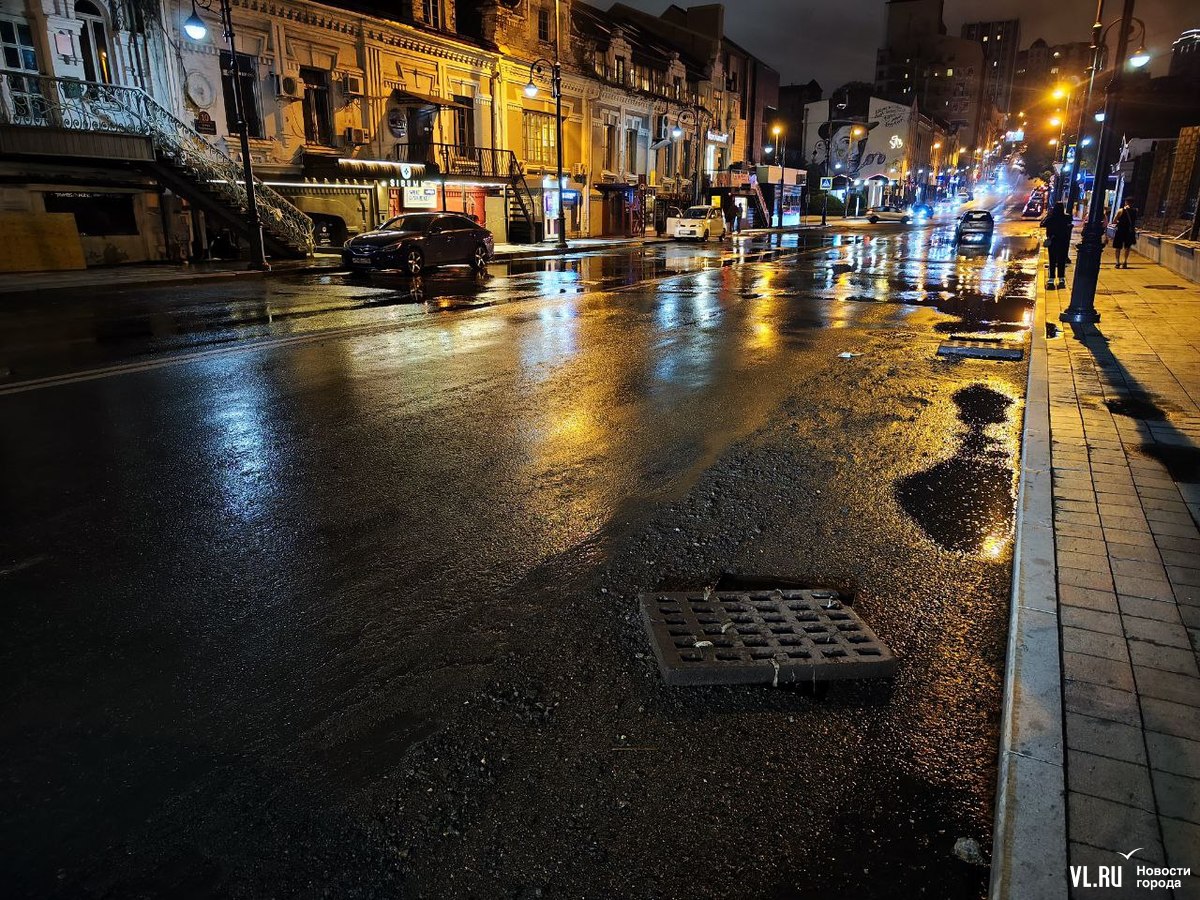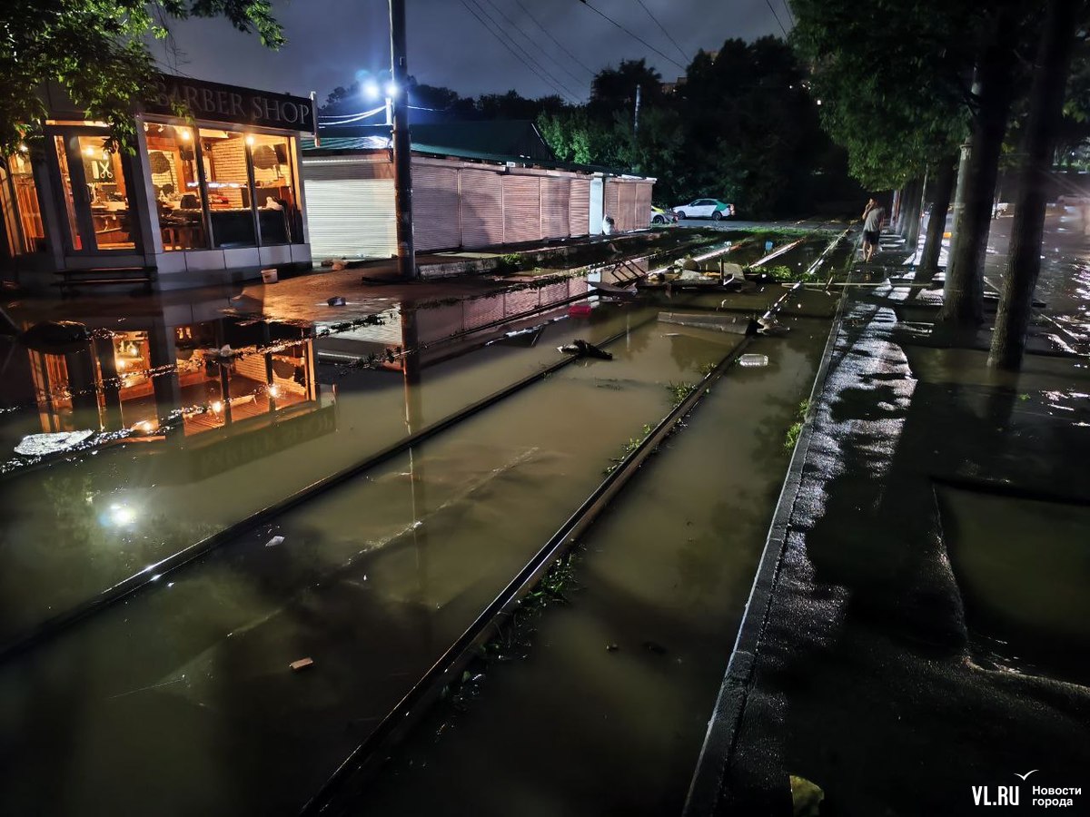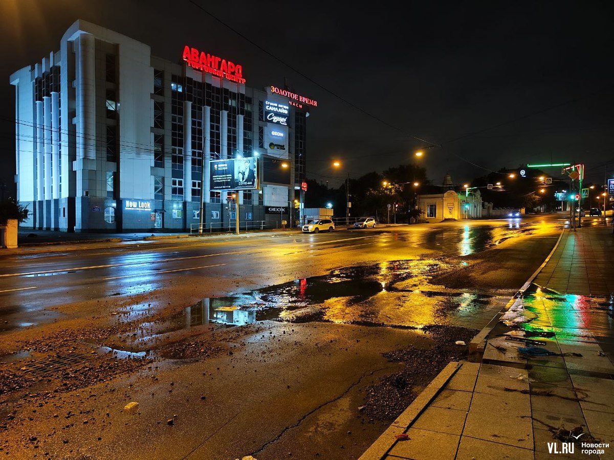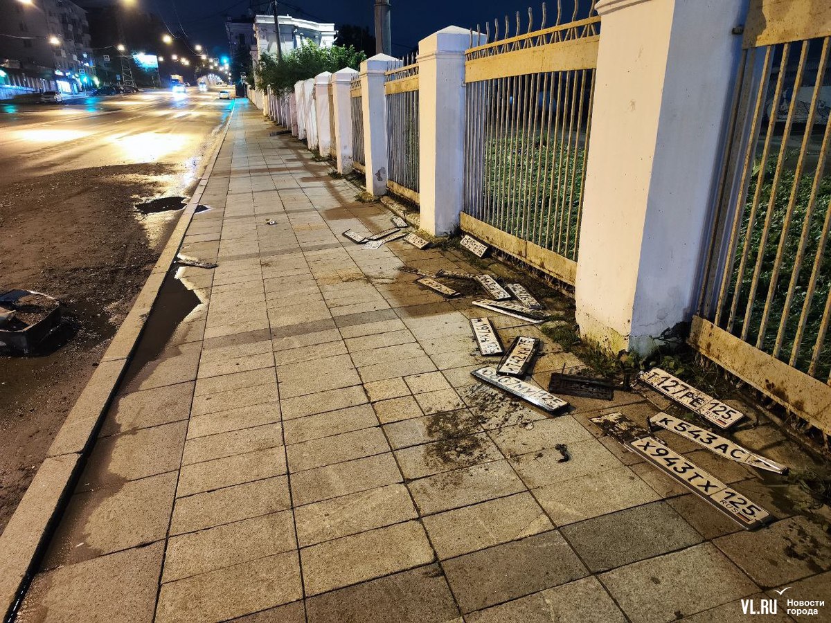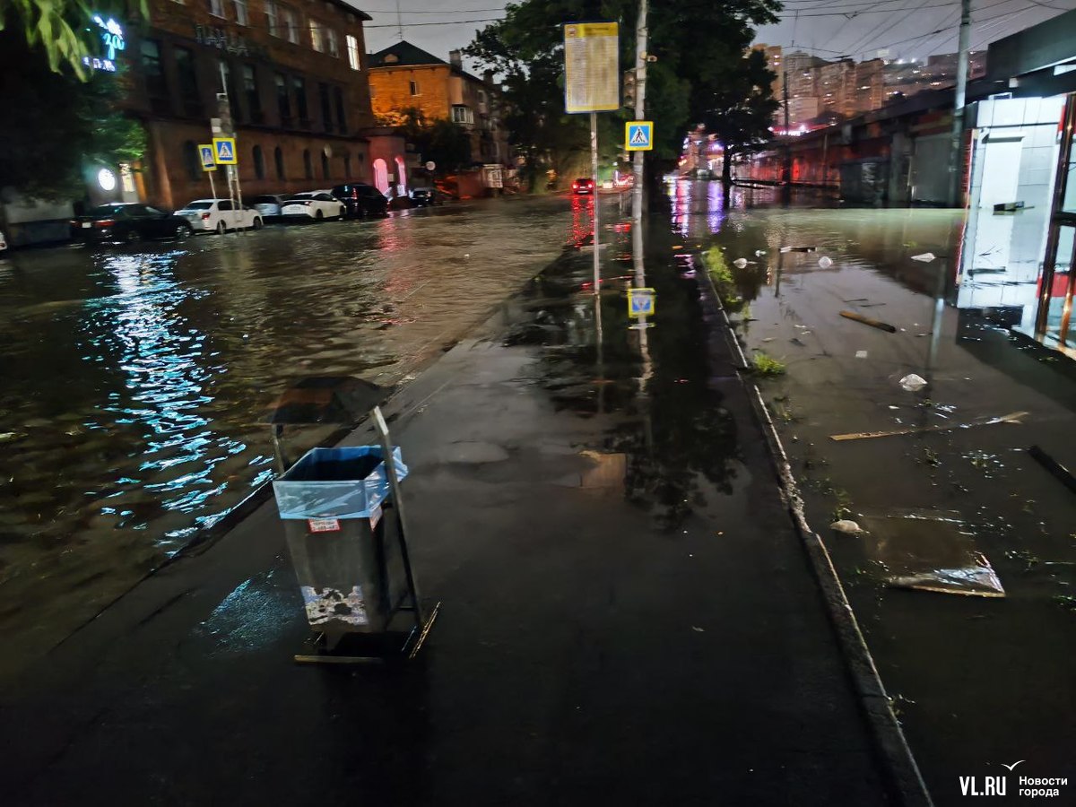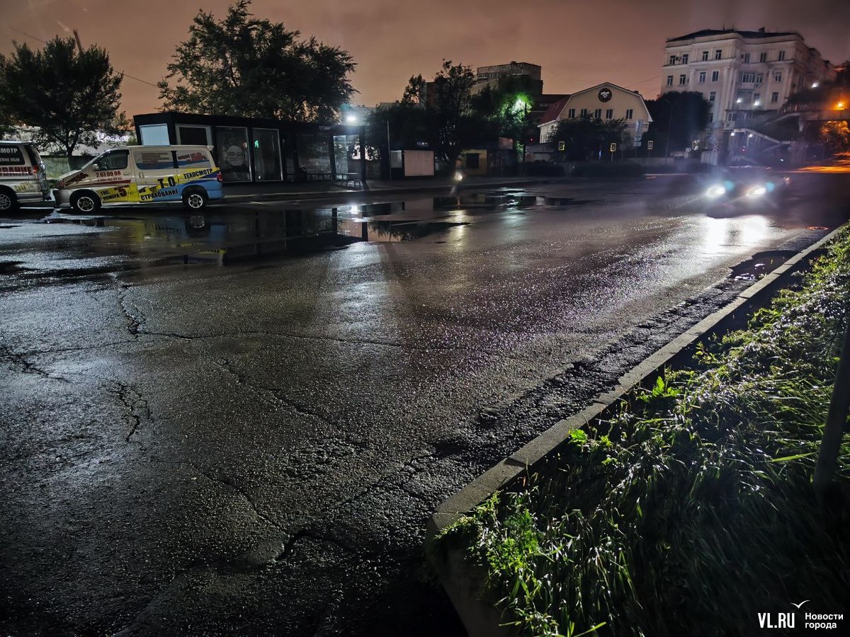 На Пограничной, где вечером катались на сапах, сейчас тоже сухо. Решётки ливнёвок открыты, всё давно утекло в них. Валяется три автомобильных номера, а возле пешеходного перехода на «Динамо» стоит брошенный автомобиль посреди дороги. Возле кинотеатра «Океан» тоже остались лужи и несколько автомобильных номеров.