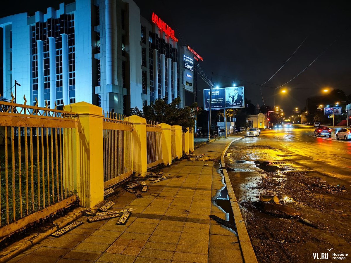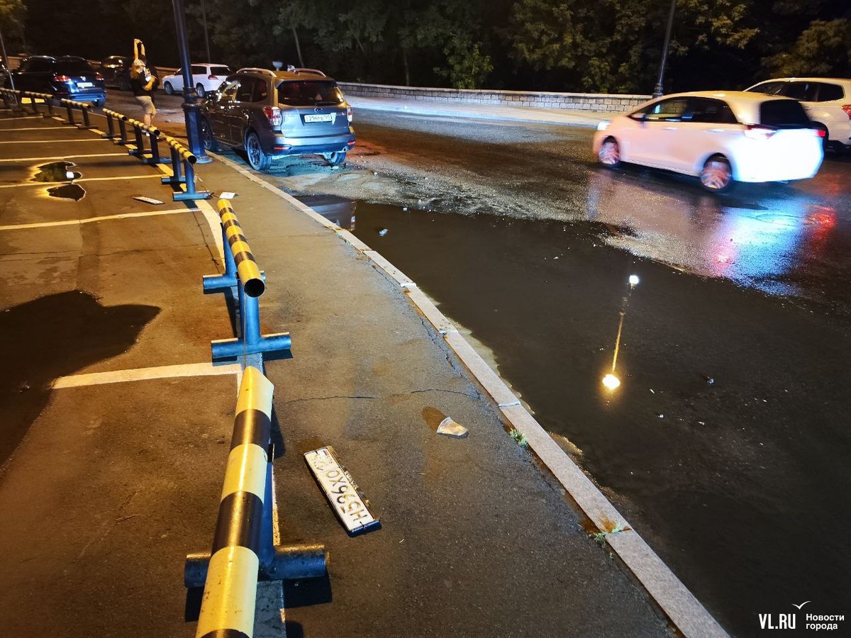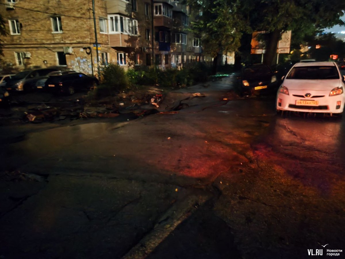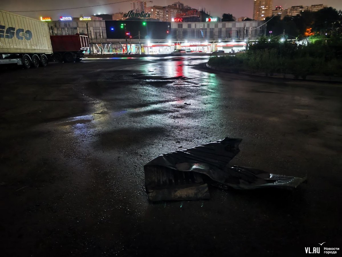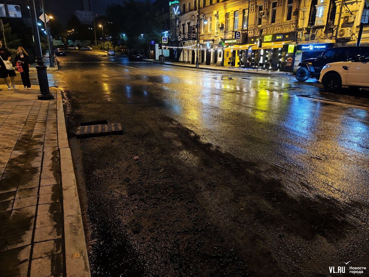 На Пограничной, где вечером катались на сапах, сейчас тоже сухо. Решётки ливнёвок открыты, всё давно утекло в них. Валяется три автомобильных номера, а возле пешеходного перехода на «Динамо» стоит брошенный автомобиль посреди дороги. Возле кинотеатра «Океан» тоже остались лужи и несколько автомобильных номеров.