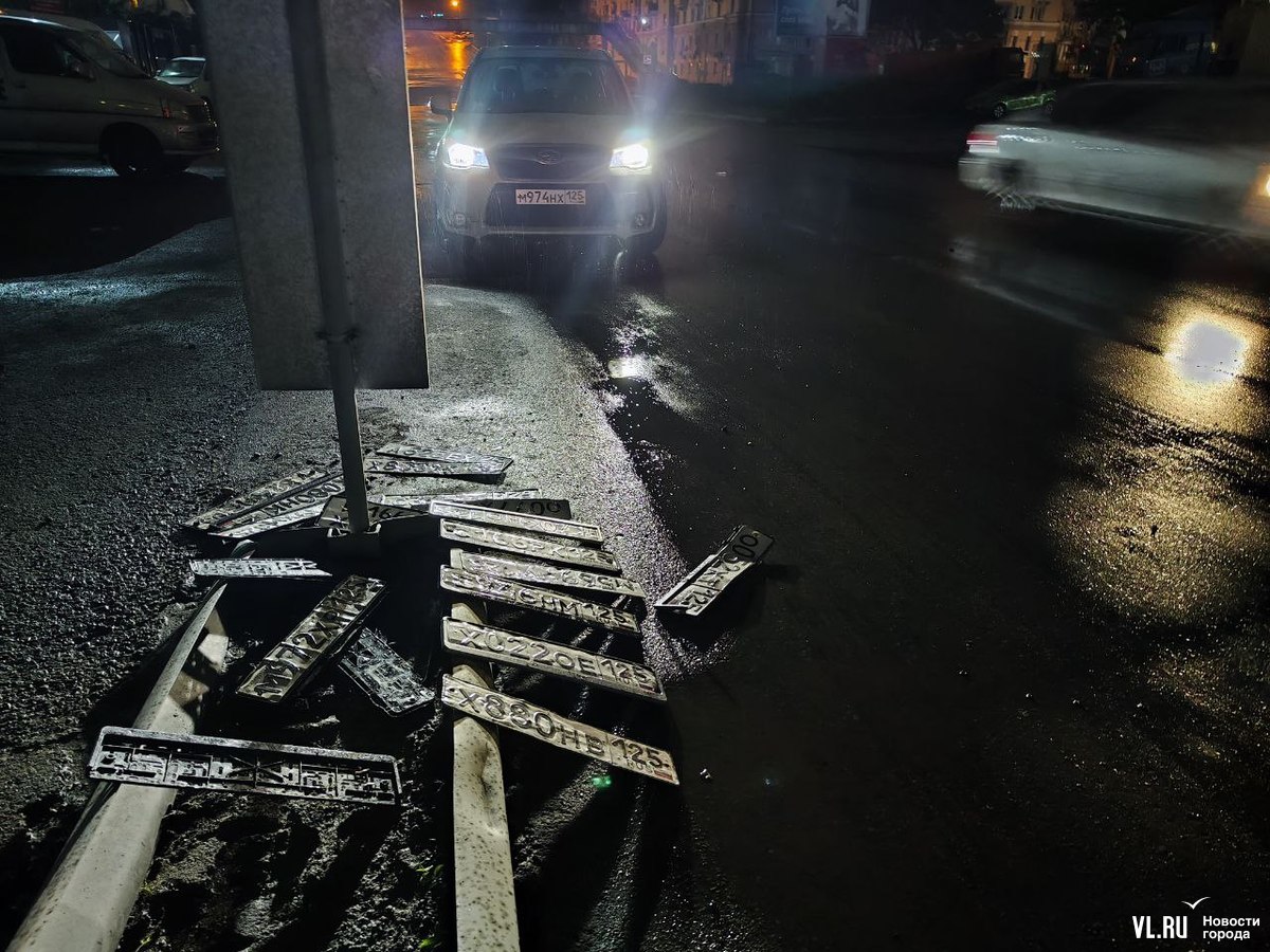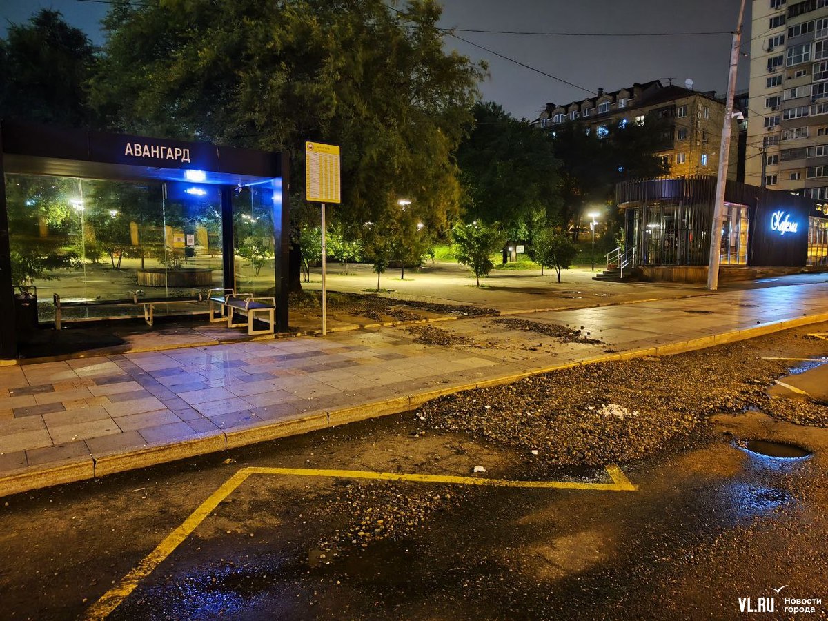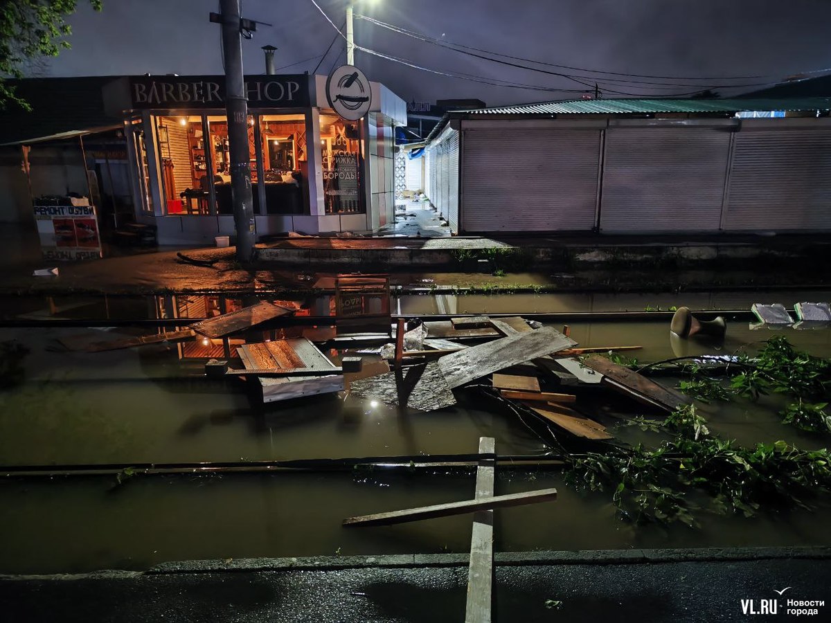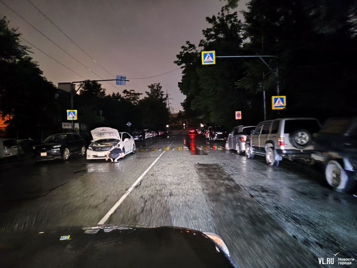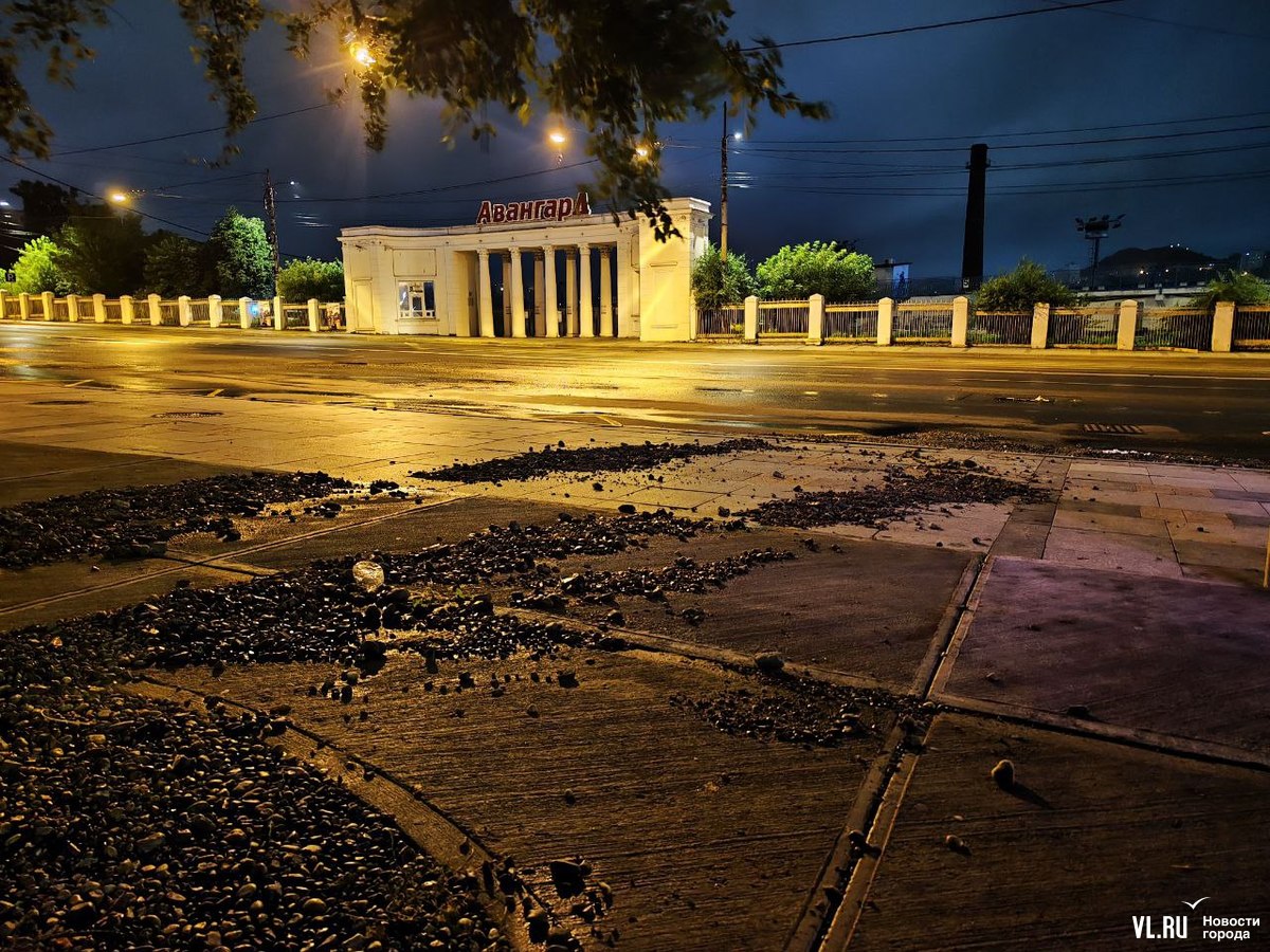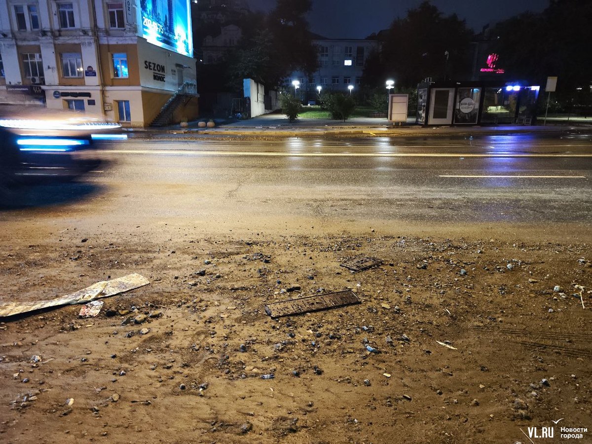 На Пограничной, где вечером катались на сапах, сейчас тоже сухо. Решётки ливнёвок открыты, всё давно утекло в них. Валяется три автомобильных номера, а возле пешеходного перехода на «Динамо» стоит брошенный автомобиль посреди дороги. Возле кинотеатра «Океан» тоже остались лужи и несколько автомобильных номеров.