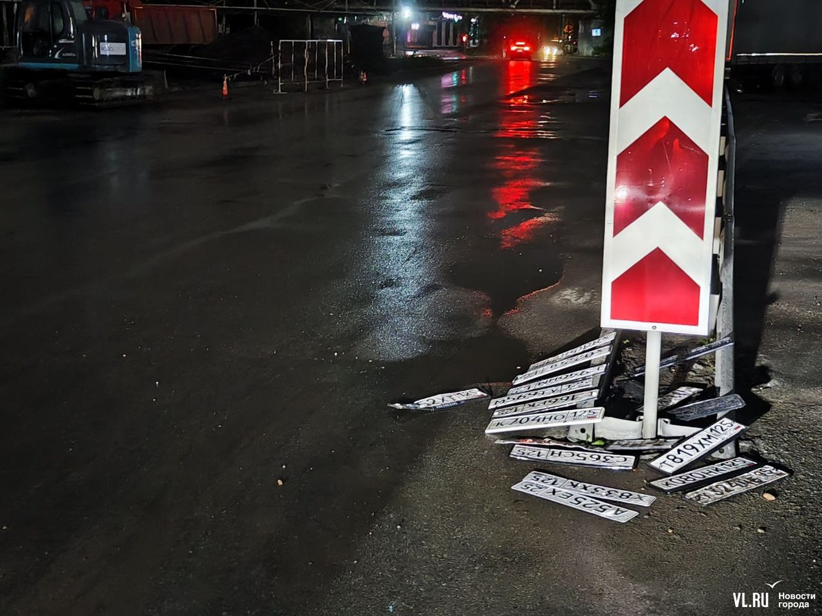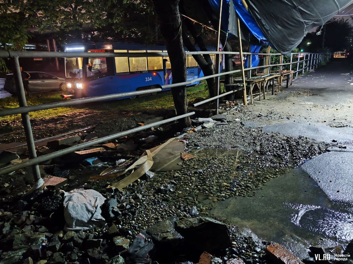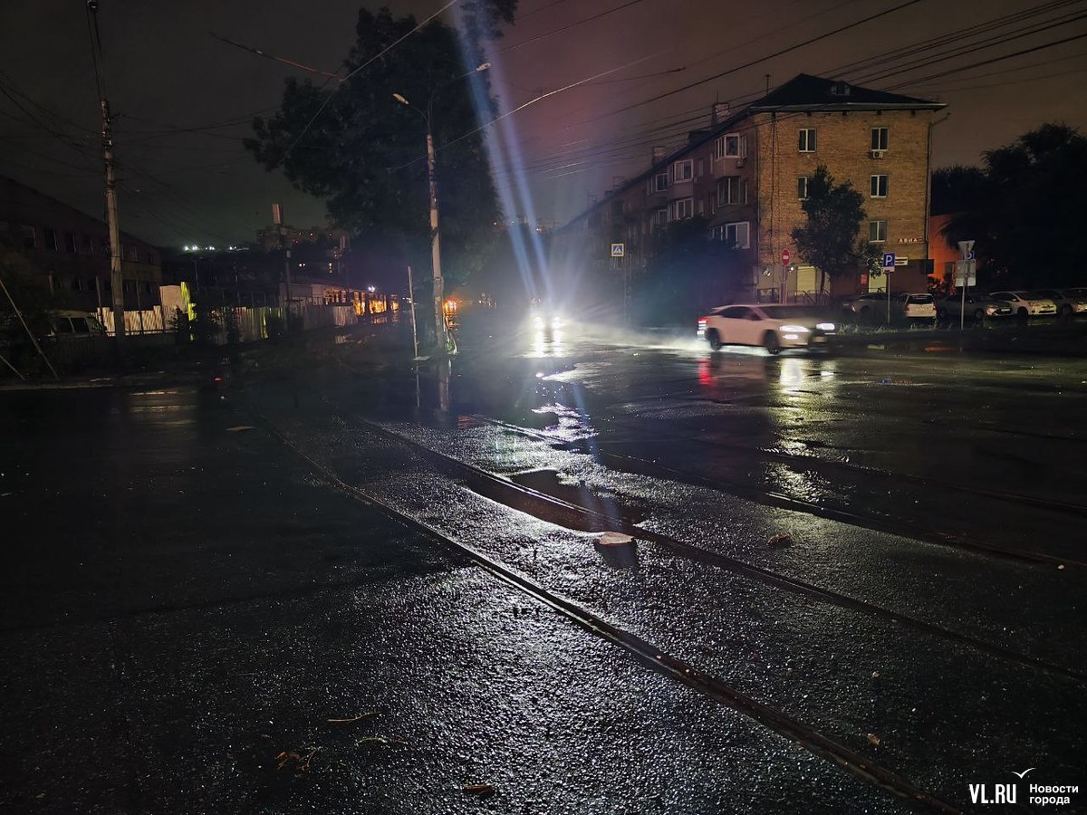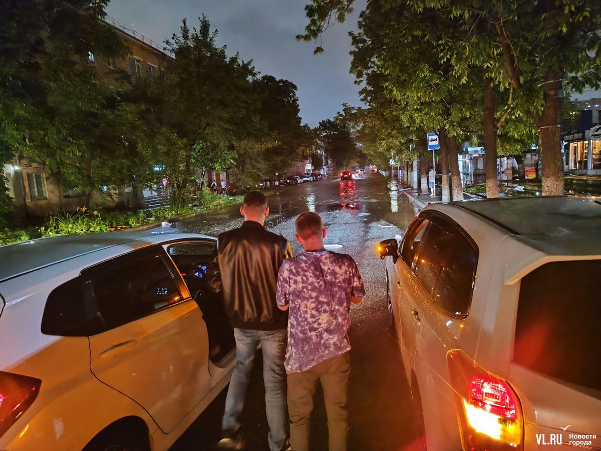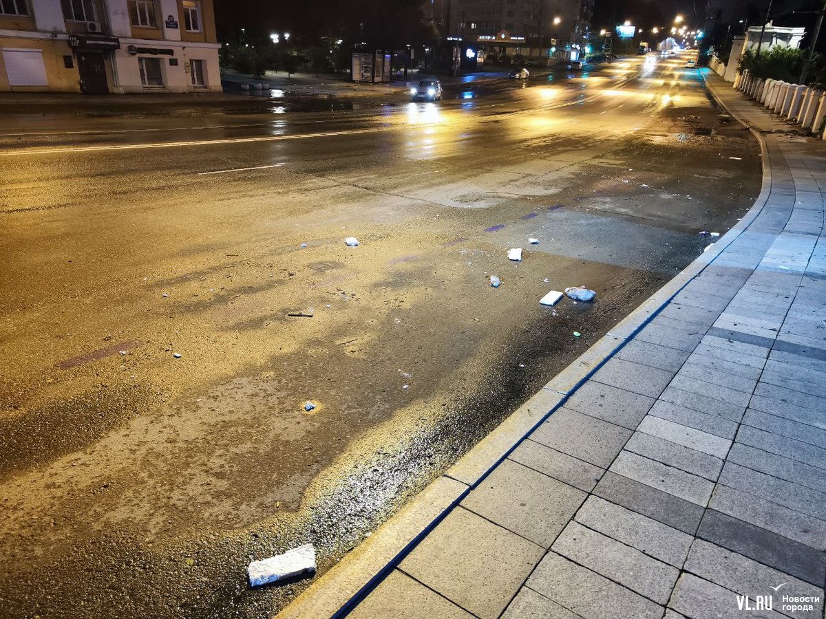 На Пограничной, где вечером катались на сапах, сейчас тоже сухо. Решётки ливнёвок открыты, всё давно утекло в них. Валяется три автомобильных номера, а возле пешеходного перехода на «Динамо» стоит брошенный автомобиль посреди дороги. Возле кинотеатра «Океан» тоже остались лужи и несколько автомобильных номеров.