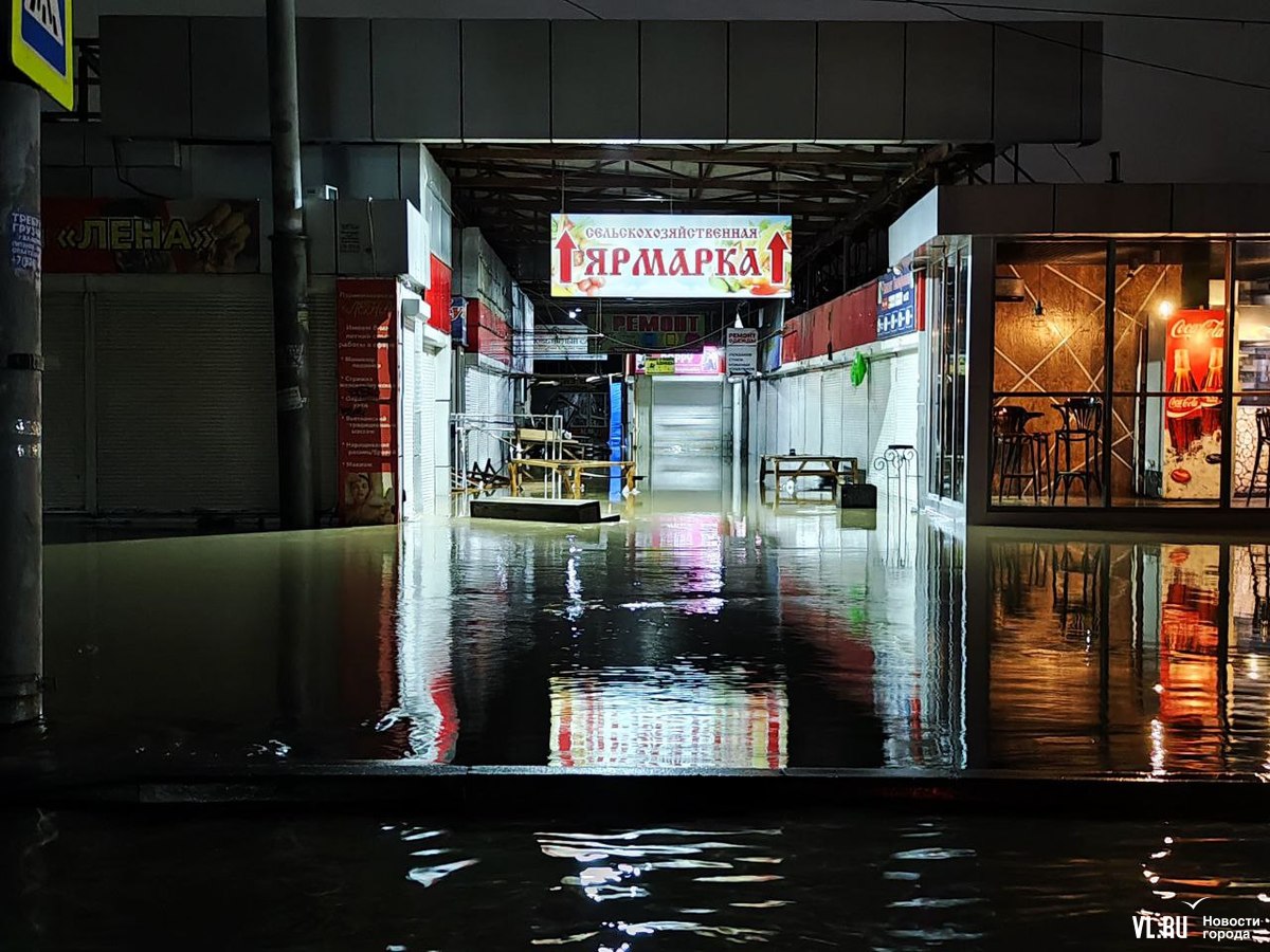 Затоплен вход на рынок, пешком можно ходить только по воде. Заглохших машин не видно, зато недалеко от ТЦ «Надежда» сейчас склад утерянных госномеров.