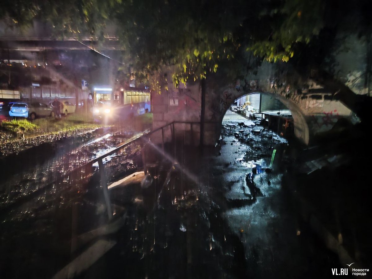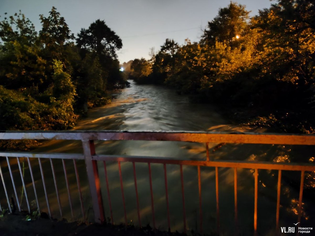 Все остальные места, которые ещё недавно были подтоплены, уже высыхают. На соседней улице Фадеева только небольшие ручьи. Возле дома по Фадеева, 14а, где потоки воды сносили машины, сейчас видны только огромные проломы в дороге. Но тут темно, последствия наводнения придётся рассматривать завтра. У пешеходного перехода стоит машина на аварийках, кто-то в 2 часа ночи заглядывает ей под капот. Река Объяснения очень многоводна сейчас, почти до края. Но мест выхода из русла не видно.