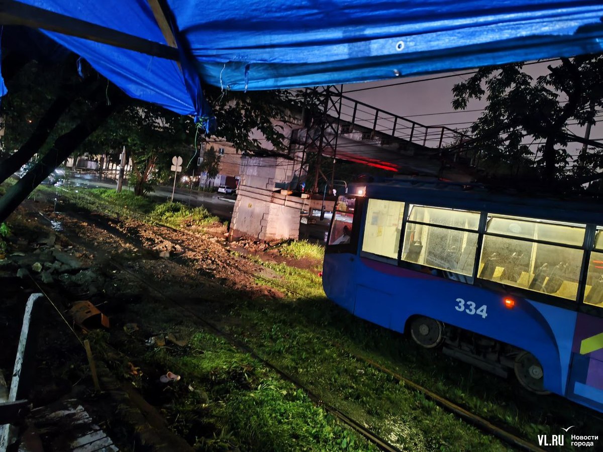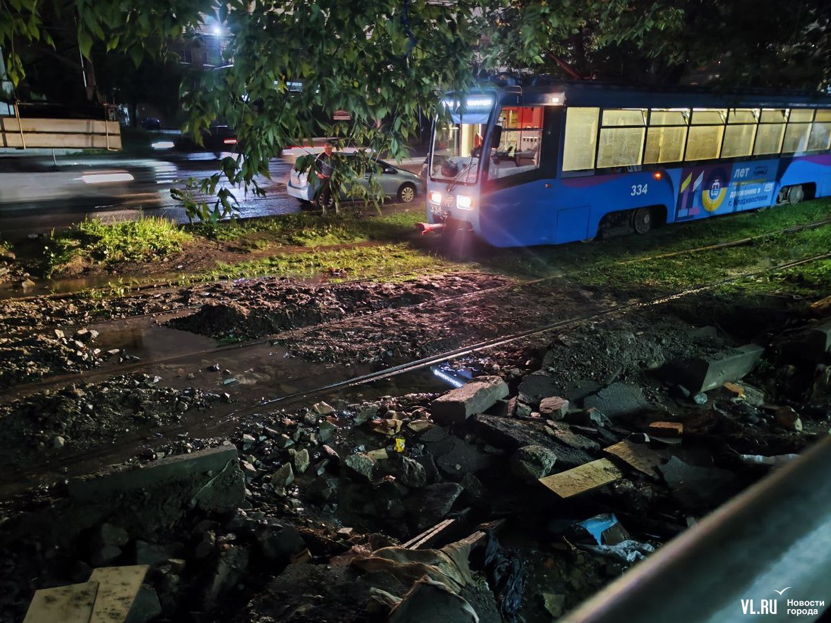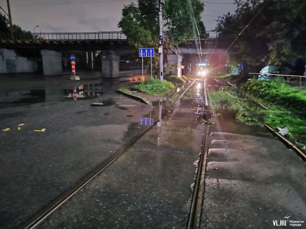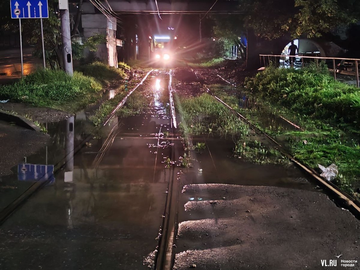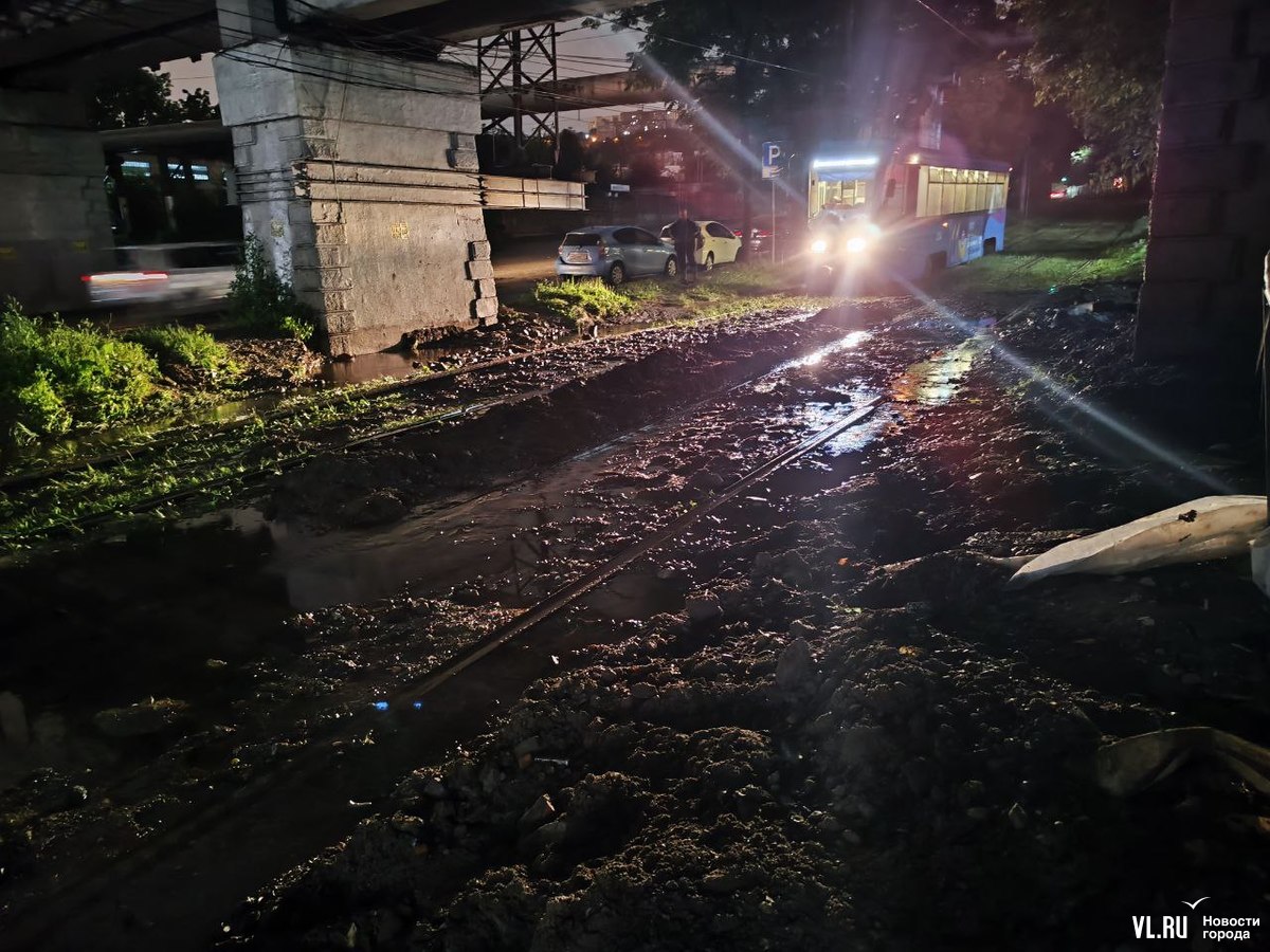 Трамвайные рельсы в районе Спортивного рынка частично затоплены, а частично завалены крупногабаритных мусором. Чтобы завтра запустить движение, нужно будет провести уборку. Более того, ближе к Луговой на рельсы сошёл грунт. Похоже, что пути здесь тоже не проходимы. Сейчас тут стоит трамвай.