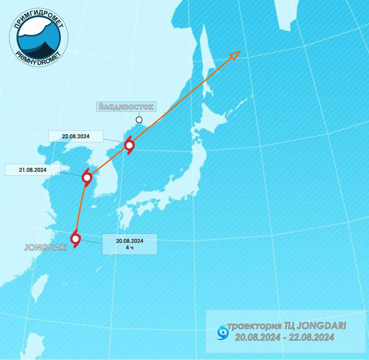 Сегодня вихрь продолжает двигаться в северном направлении. Утром 21 августа он окажется у западного побережья полуострова Корея. Однако если вчера его траектория по прогнозу выходила через границы Китая и КНДР ровно на середину Приморского края, то по последним расчётам шторм отворачивает от Приморья и пройдёт вдоль юго-восточного побережья. Предположительно, утром 22 августа JONGDARI выйдет в Японское море, затем станет смещаться над его акваторией недалеко от приморского побережья. Несмотря на изменённую прогностическую траекторию тропического циклона, влияние его на погоду Приморского края ожидается значительным, штормовое предупреждение, объявленное вчера на 22 и 23 августа, остаётся в силе.