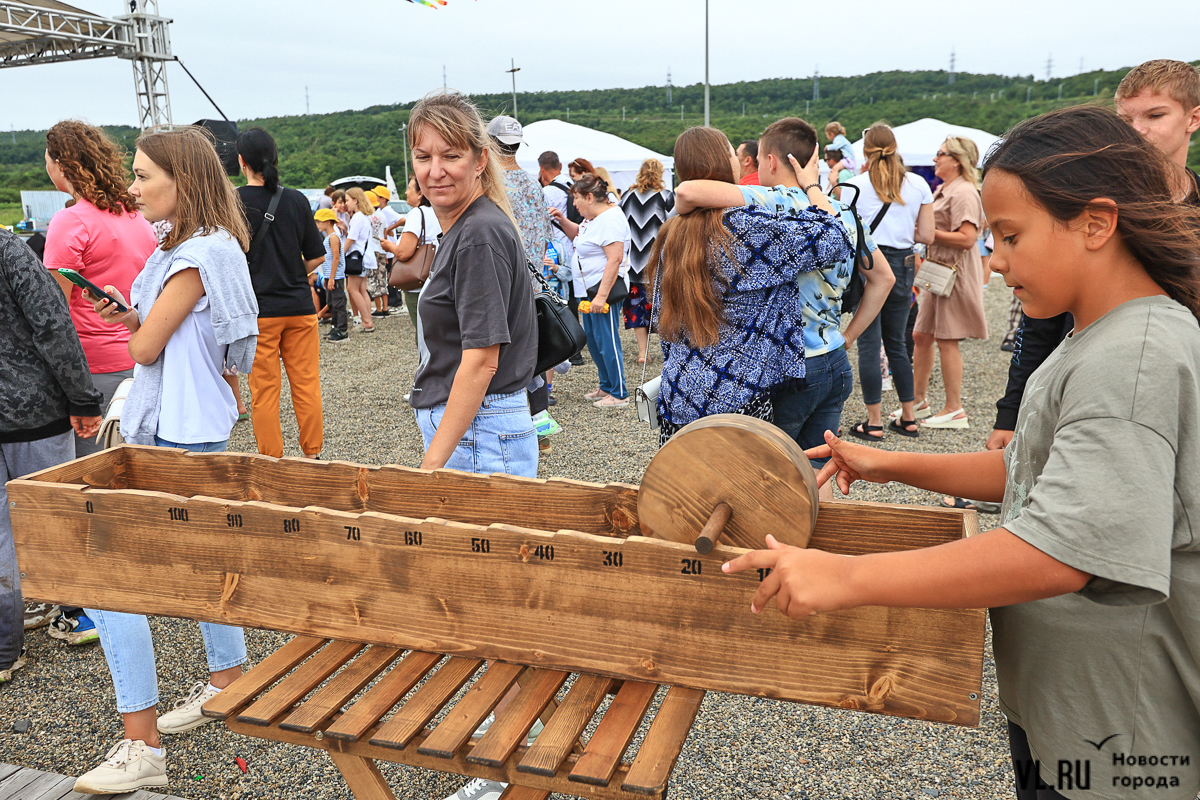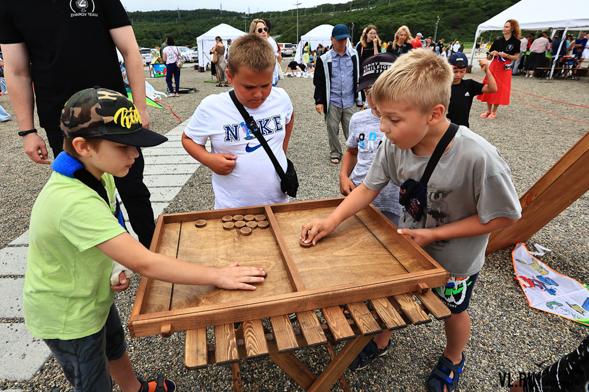 Главной темой, конечно, стал запуск воздушных змеев – в середине дня в небе их было около пары десятков. Привлекали внимание большие фигуры тигра, змеи, крокодила, осьминога, чайки. В 15:30 запустили самого большого, а точнее, самого длинного змея этого дня – в цветах российского триколора.
