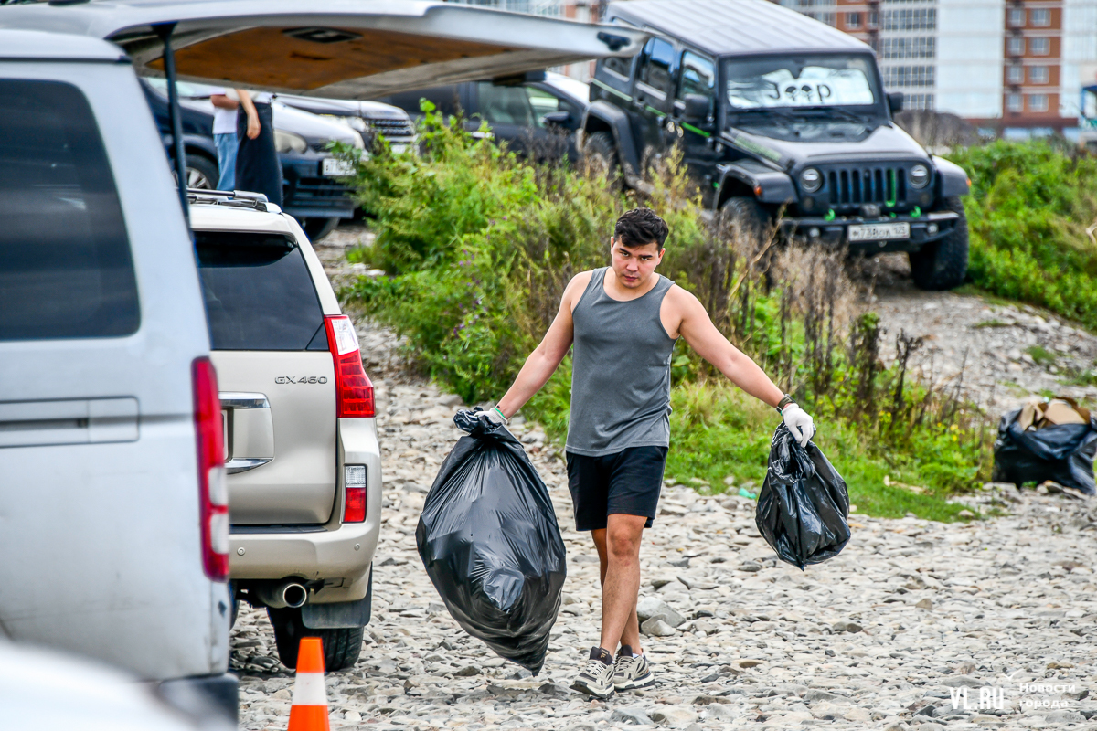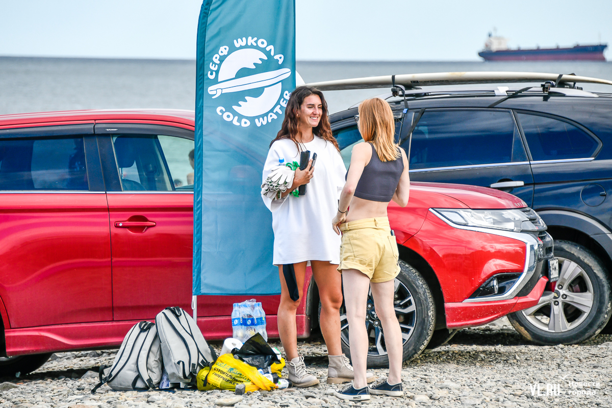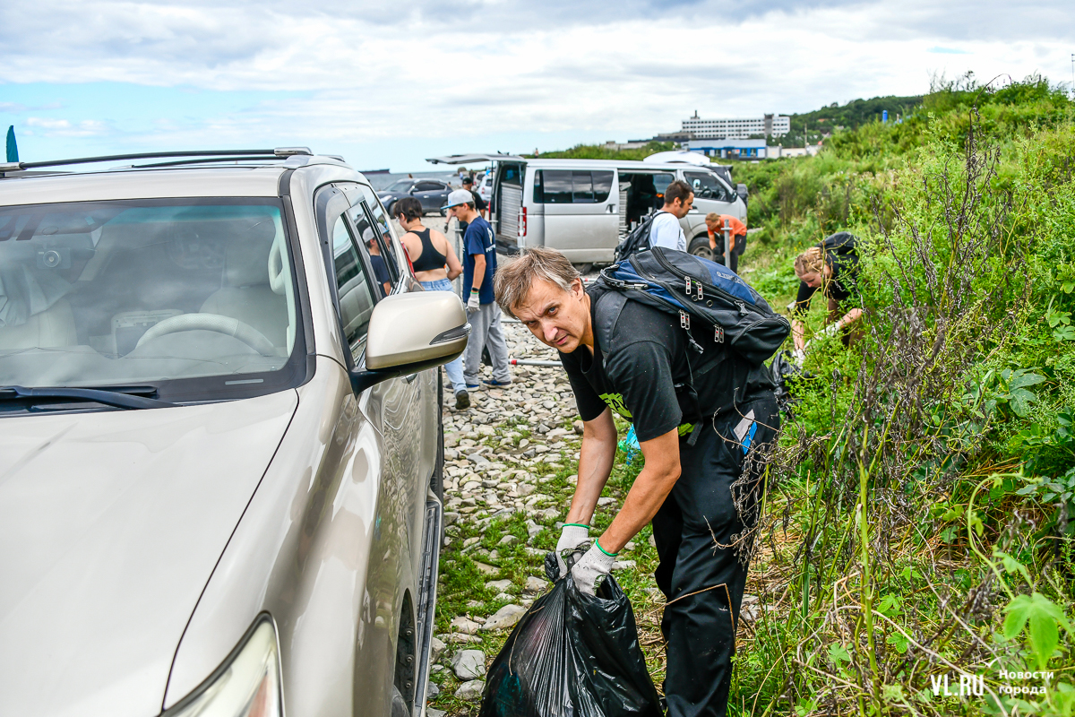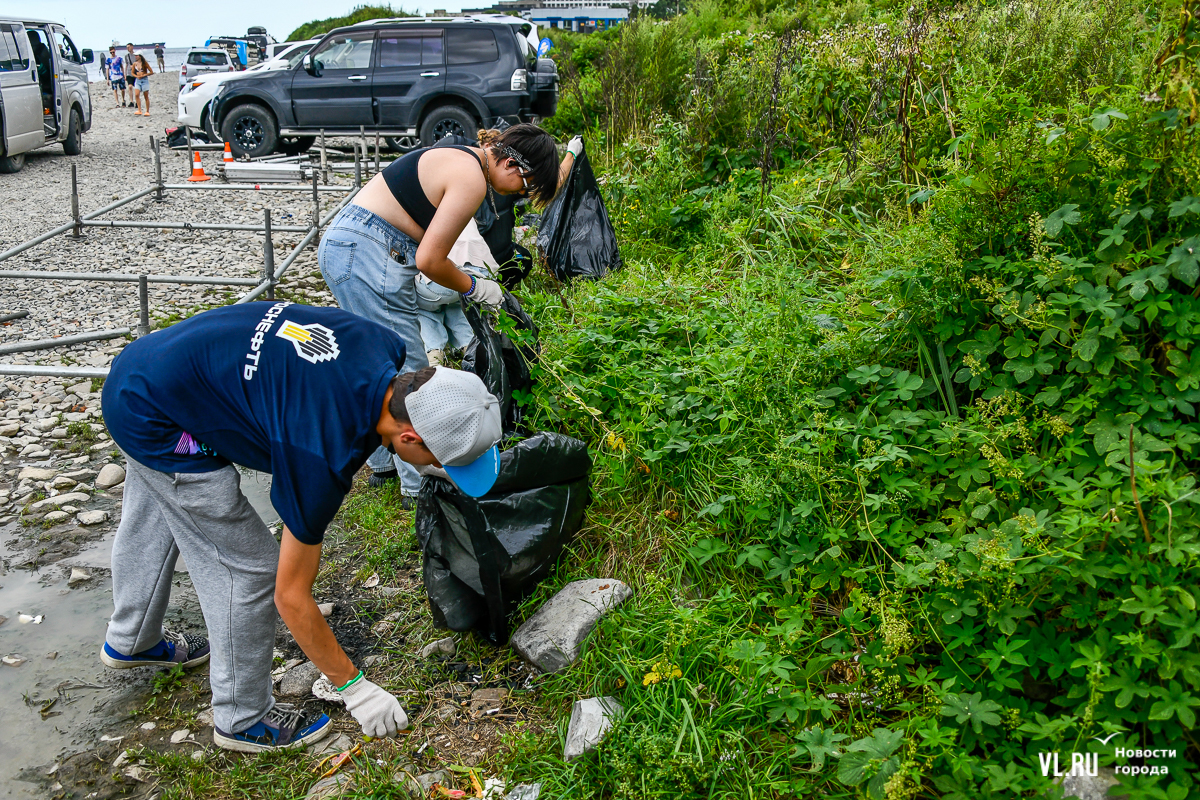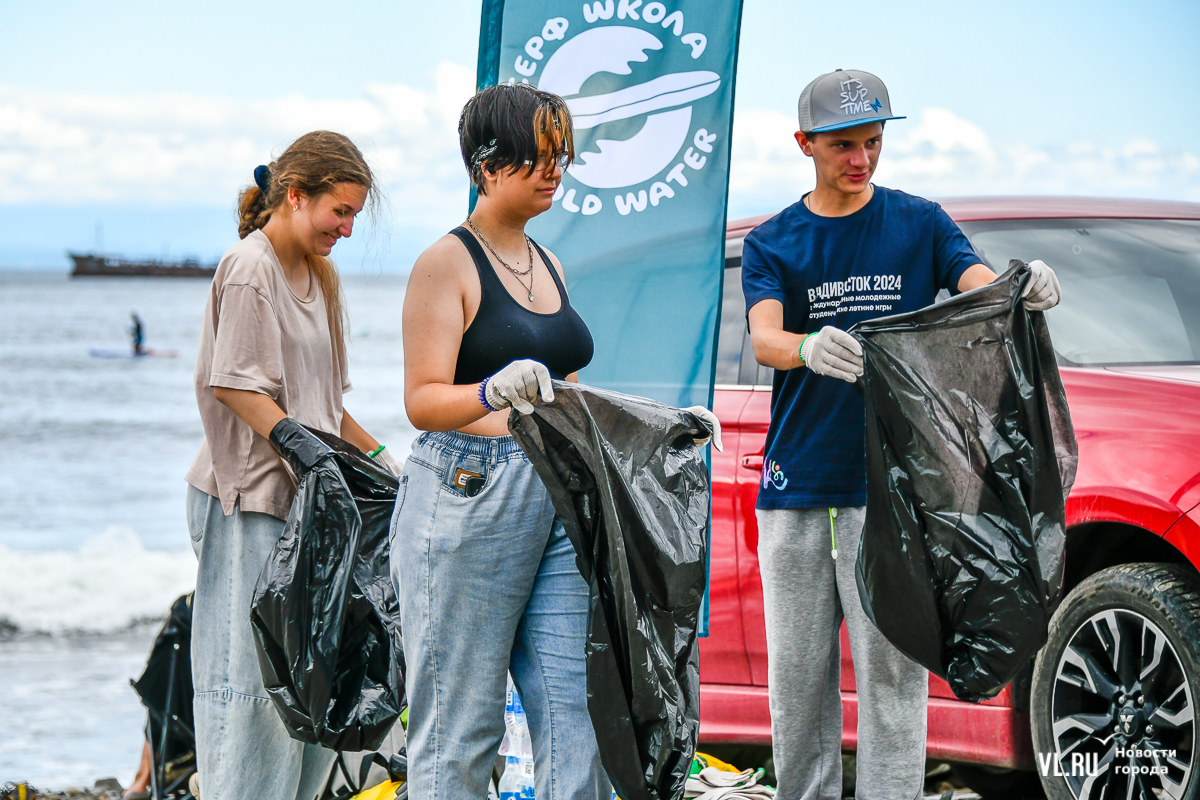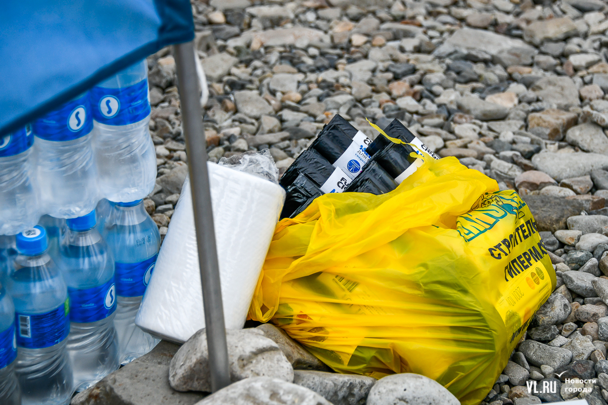 На пляже не повернуться – выглянуло солнце, люди купаются и загорают. А те, кто гоняет на досках, выходя из моря, присоединяются к уборке. Мешки, перчатки, бумажные полотенца, питьевая вода – всё есть. Об этом позаботились организаторы, АНО «Лига холодной воды», которая занимается, в том числе, подготовкой соревнований сёрферов. Их представитель Игорь Попов говорит, что это нормальная история, когда люди убирают побережье. Они несколько раз за сезон устраивают субботники и здесь, и в бухте Чернышева на острове Русский.