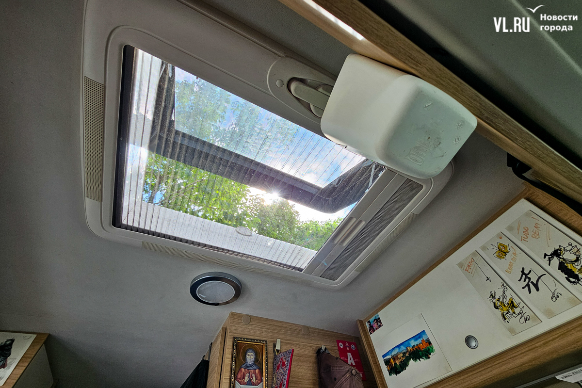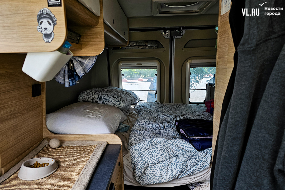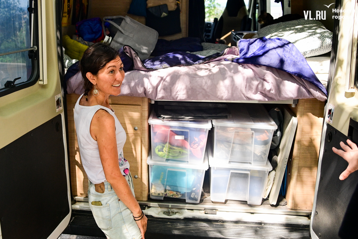 «У нас немного одежды – вся всесезонная одежда хранится на нескольких полках. Воды мы используем мало – у нас есть контроллер, показывающий, сколько ещё её осталось. Под кроватью прячется бак на 90 литров воды, её мы используем для всего – чтобы готовить, принимать душ. Сейчас мы используем её очень экономично – может спокойно хватить на 10 дней. Ещё мы можем следить, сколько электричества осталось, потому что дом работает на солнечных батареях. Во Владивостоке с солнцем проблематично, мы долго искали место, где будет попадать солнечный свет», – объяснили Сара и Паоло.