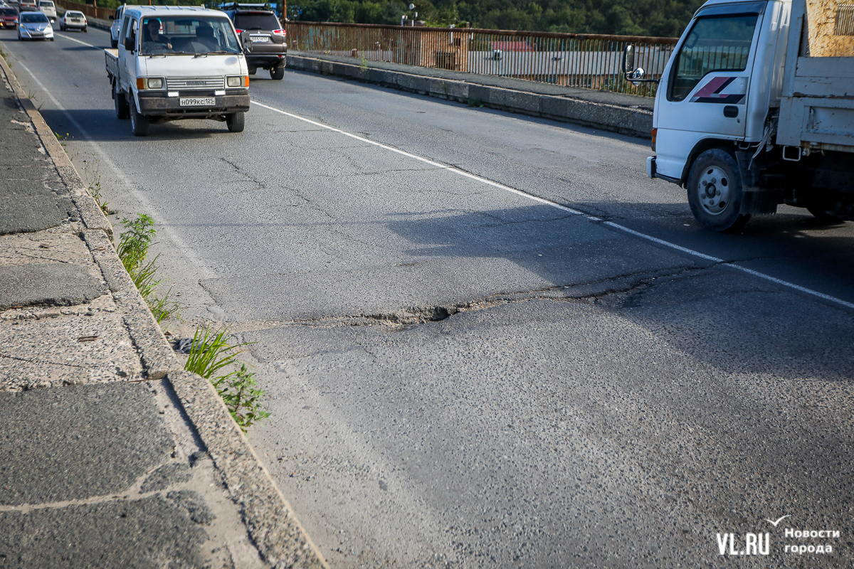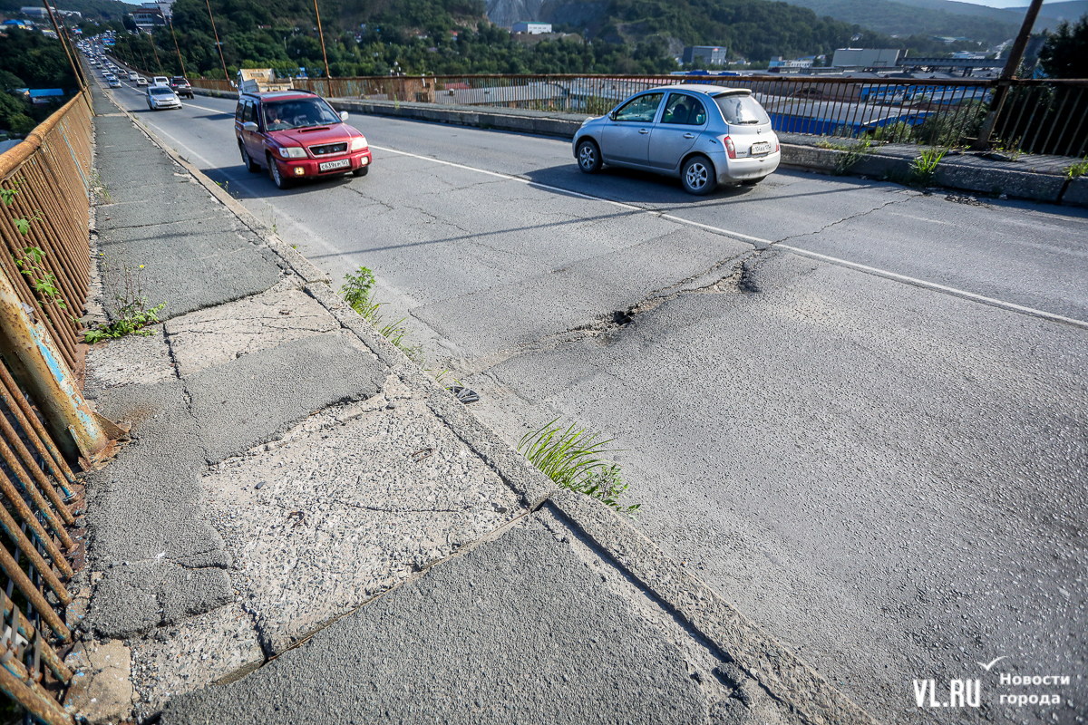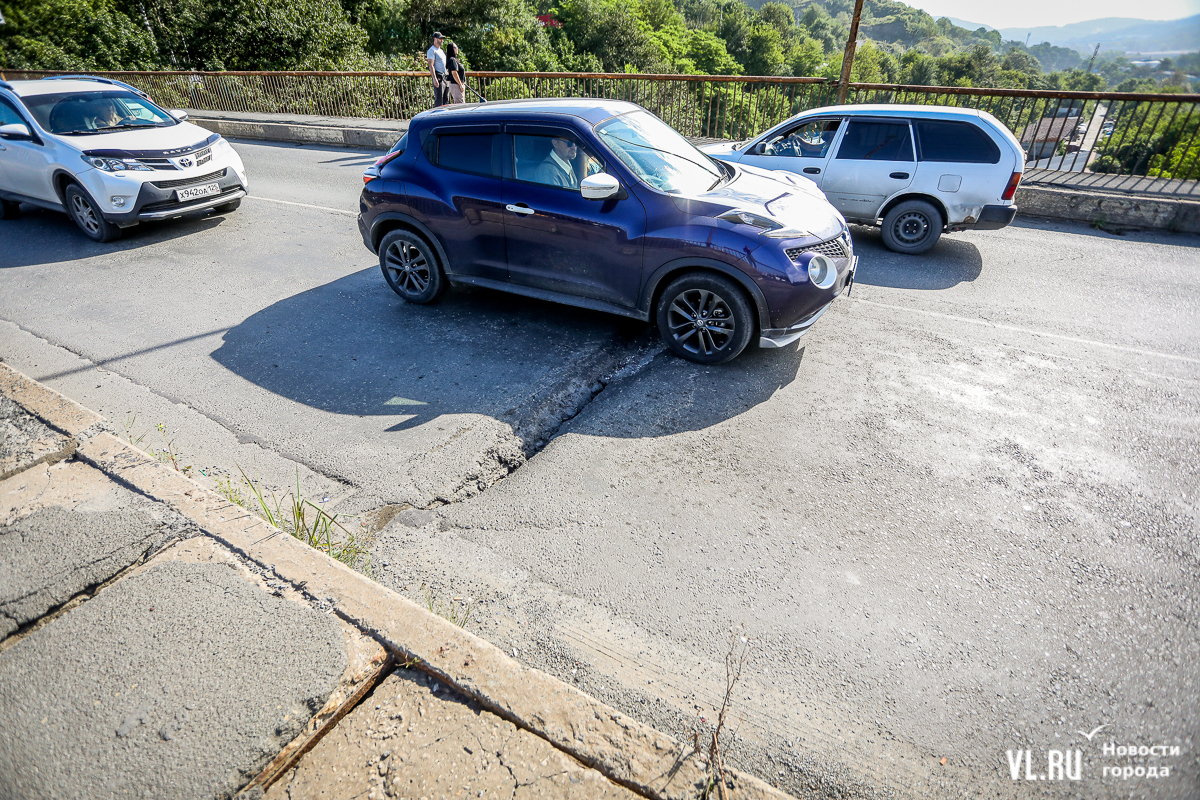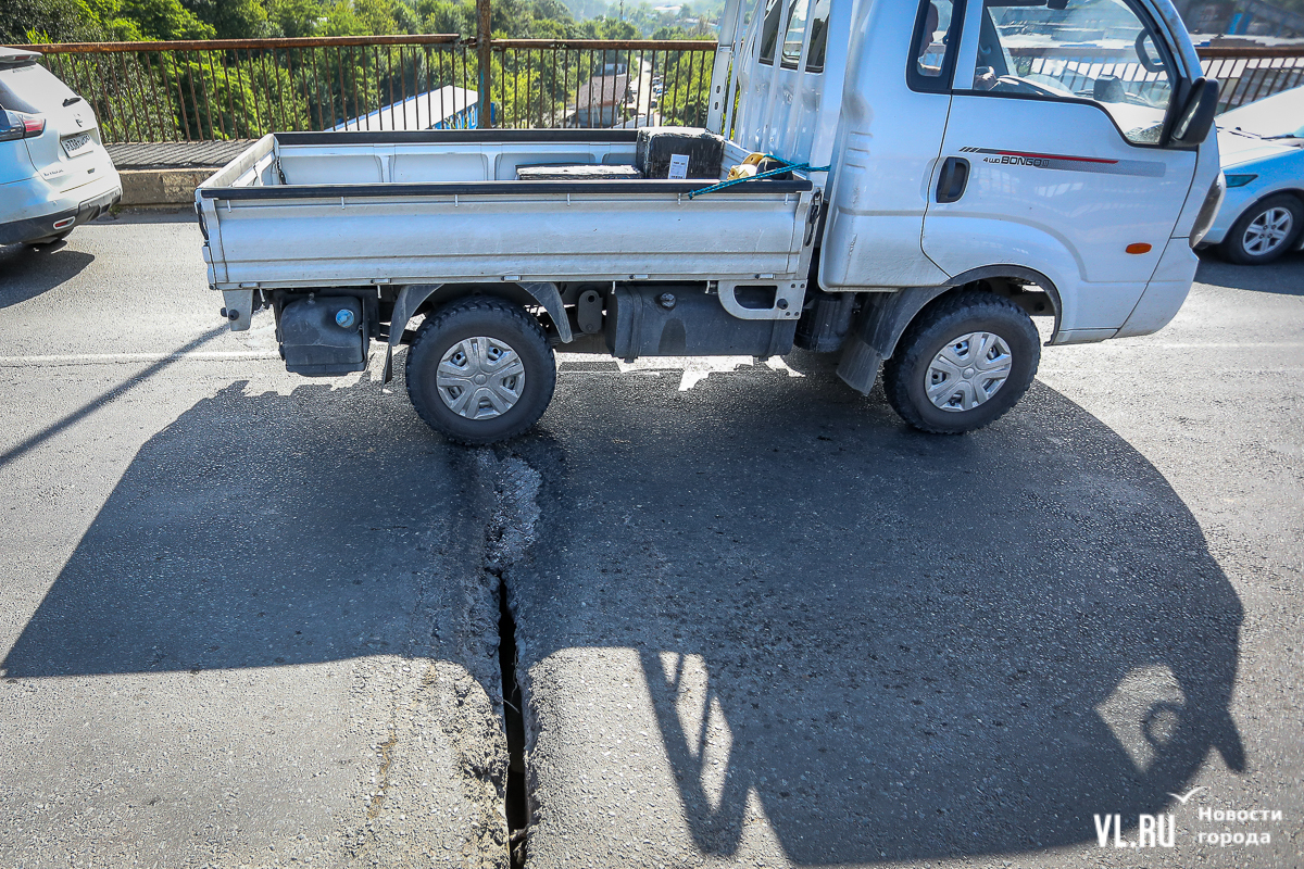 Пробка с Выселковой на Рудневский мост, кажется, уже круглосуточная. Причиной тому стал разошедшийся шов в многострадальном дорожном полотне. Если идти по мосту пешком, то в дыру можно увидеть небольшой кусочек улицы Снеговой, которая проходит под ним. Дальше, у съезда с моста в сторону Луговой, есть ещё один повреждённый шов. Пока там дыра не сквозная, но очень к этому стремится. В администрации Владивостока сообщили, что ремонт на Рудневском проведут в течение двух недель.