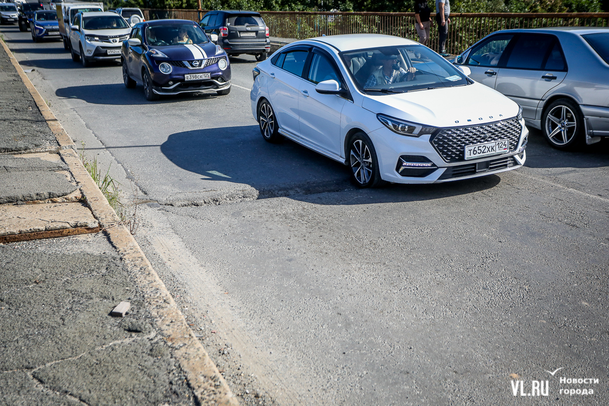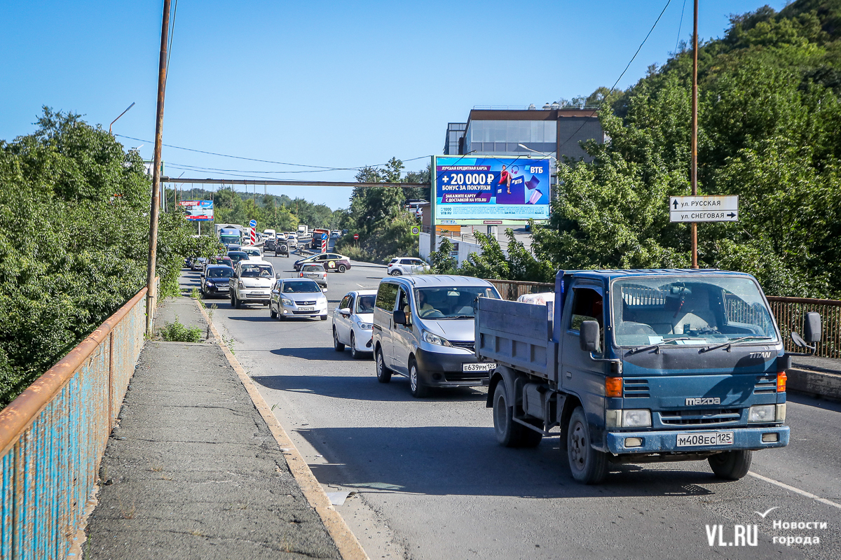 Улица Луговая от Дальрыбвтуза и Выселковая от поворота на «Китай-город» стоят в бесконечной пробке из-за состояния Рудневского моста. Сейчас на нём образовались сквозные и почти сквозные дыры, которые тормозят весь трафик – чтобы их преодолеть, приходится выезжать на встречку или сбрасывать скорость почти до нуля.
