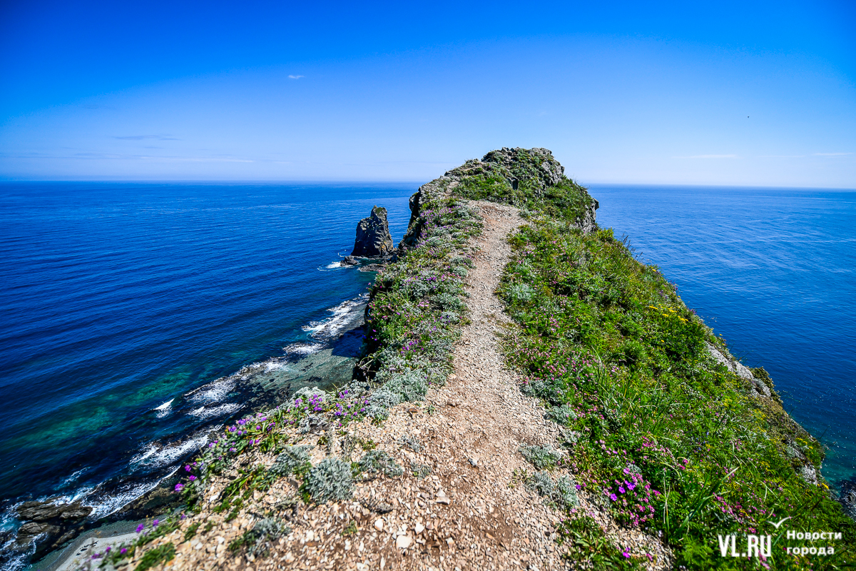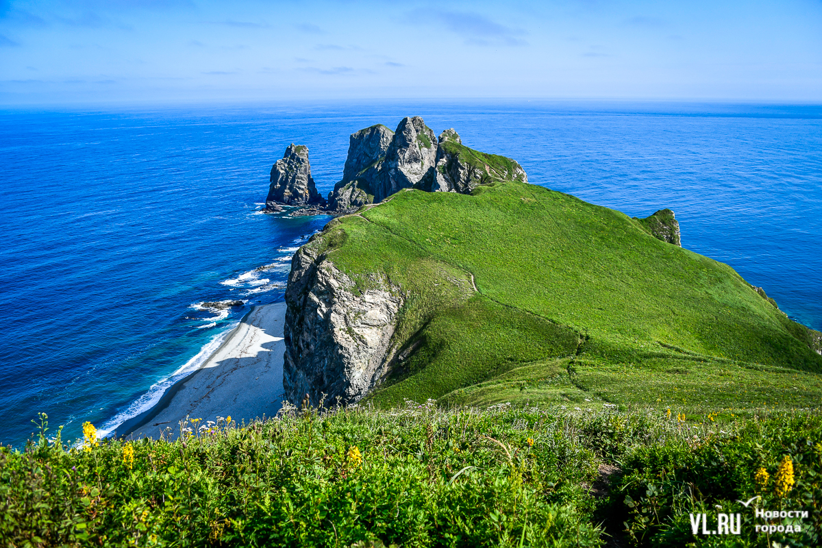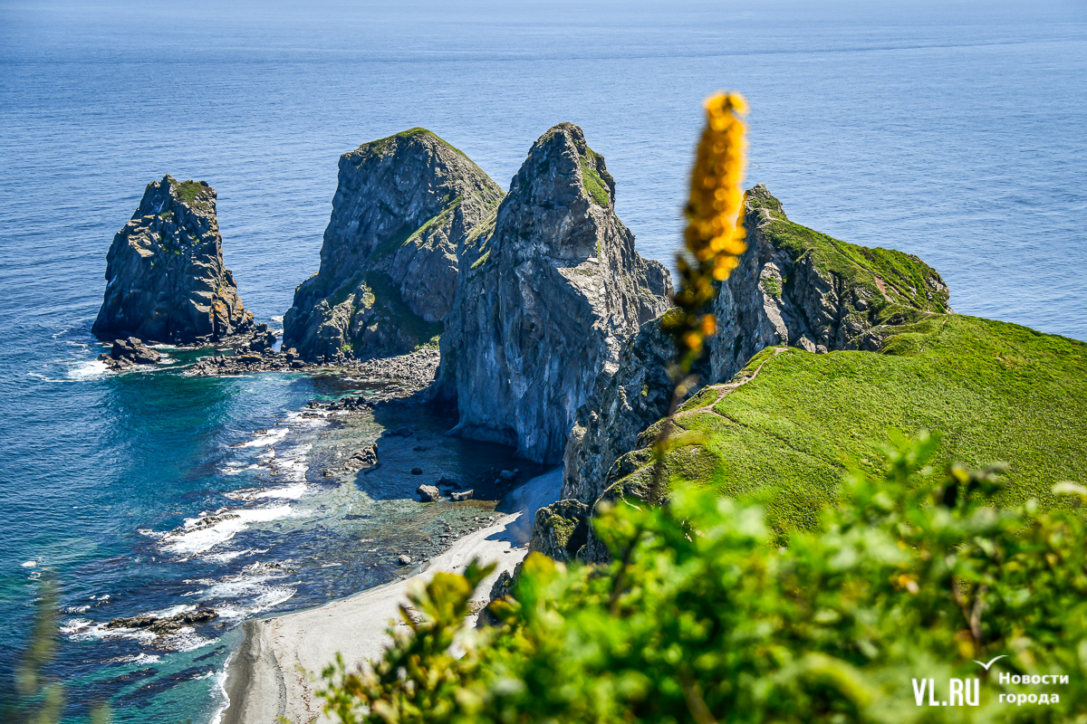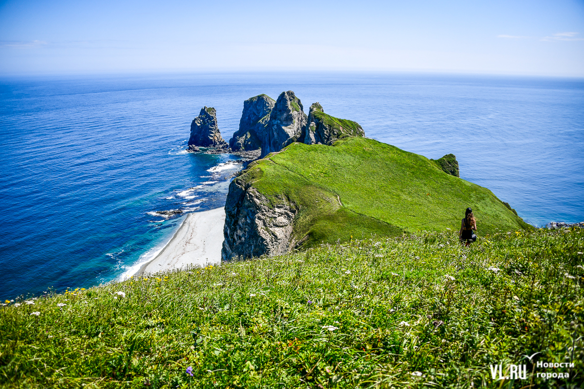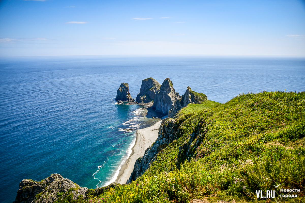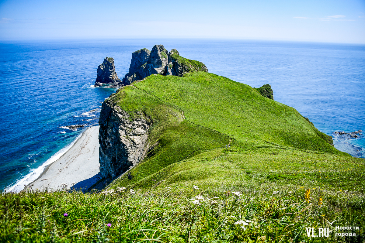 С высоты открывается просто невообразимый пейзаж – большое поле с цветами и холмами, а в конце возвышаются четыре обрывистые скалы, уходящие в море. Именно они и дали название мысу. Как показывает практика, часть туристов не уходит дальше видовой площадки, а зря. Если спуститься с сопки к самому мысу, то откроется совершенно другой вид. А после можно сходить на пустынный пляж. Тропинка к нему протоптана и хорошо просматривается. Правда, потом придётся потратить немало усилий, чтобы забраться обратно на видовую. Подъём получается местами крутой и затяжной. Именно поэтому лучше посещать мыс в прохладную погоду или во второй половине дня, когда температура воздуха не такая высокая. И обязательно захватите с собой питьевую воду.