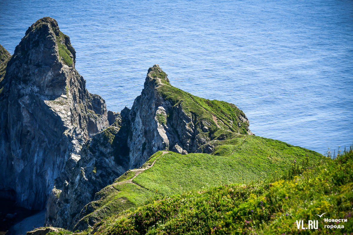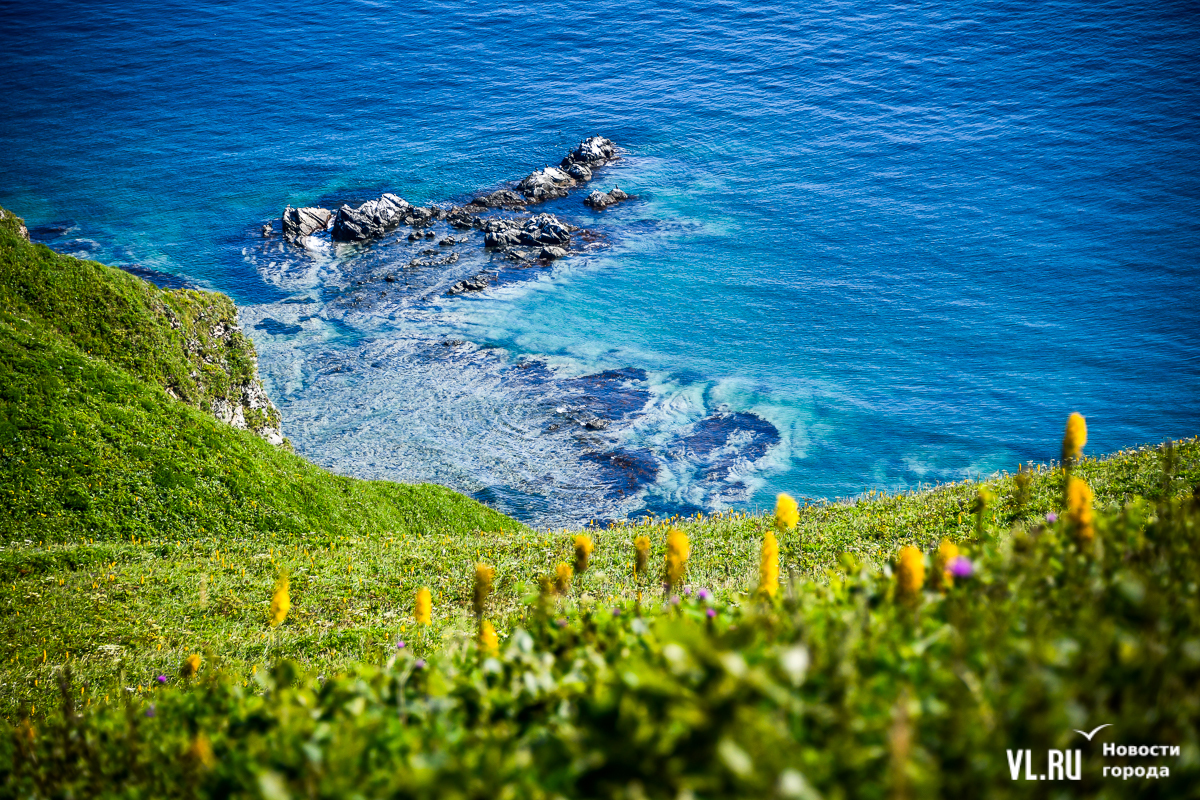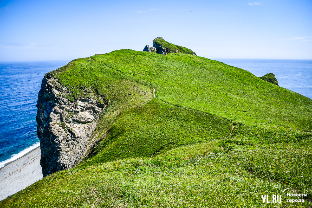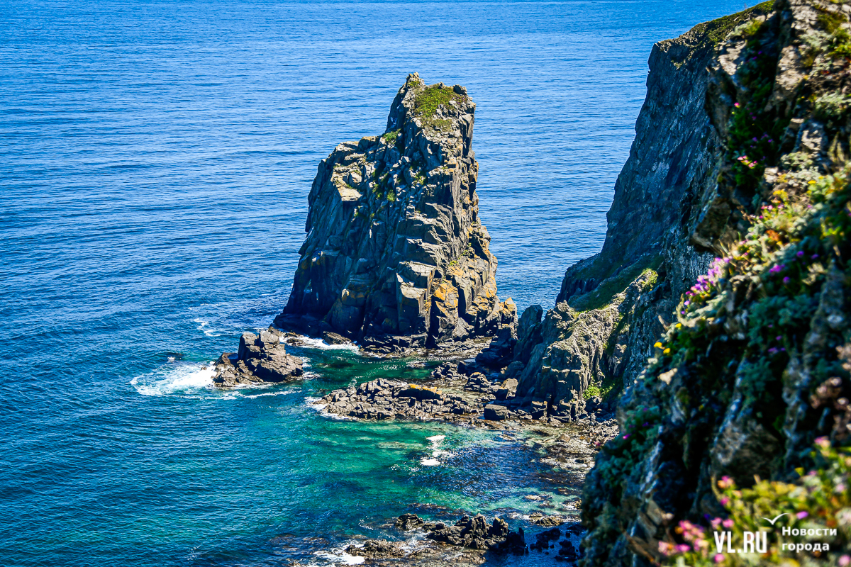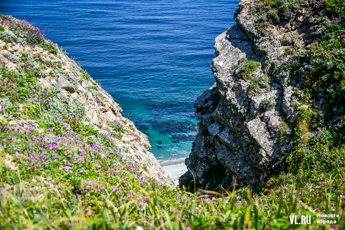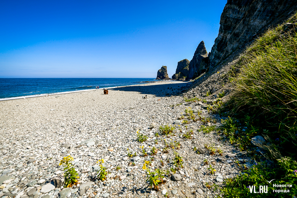 С высоты открывается просто невообразимый пейзаж – большое поле с цветами и холмами, а в конце возвышаются четыре обрывистые скалы, уходящие в море. Именно они и дали название мысу. Как показывает практика, часть туристов не уходит дальше видовой площадки, а зря. Если спуститься с сопки к самому мысу, то откроется совершенно другой вид. А после можно сходить на пустынный пляж. Тропинка к нему протоптана и хорошо просматривается. Правда, потом придётся потратить немало усилий, чтобы забраться обратно на видовую. Подъём получается местами крутой и затяжной. Именно поэтому лучше посещать мыс в прохладную погоду или во второй половине дня, когда температура воздуха не такая высокая. И обязательно захватите с собой питьевую воду.