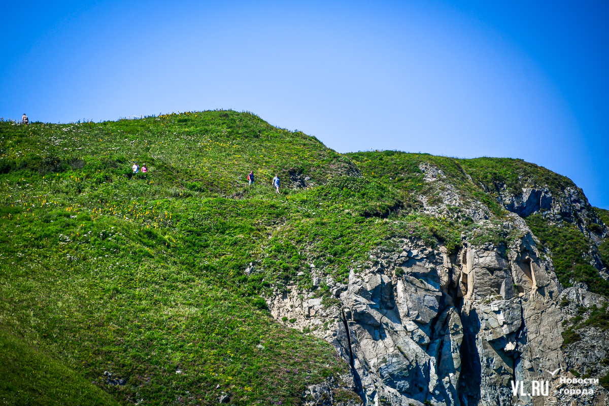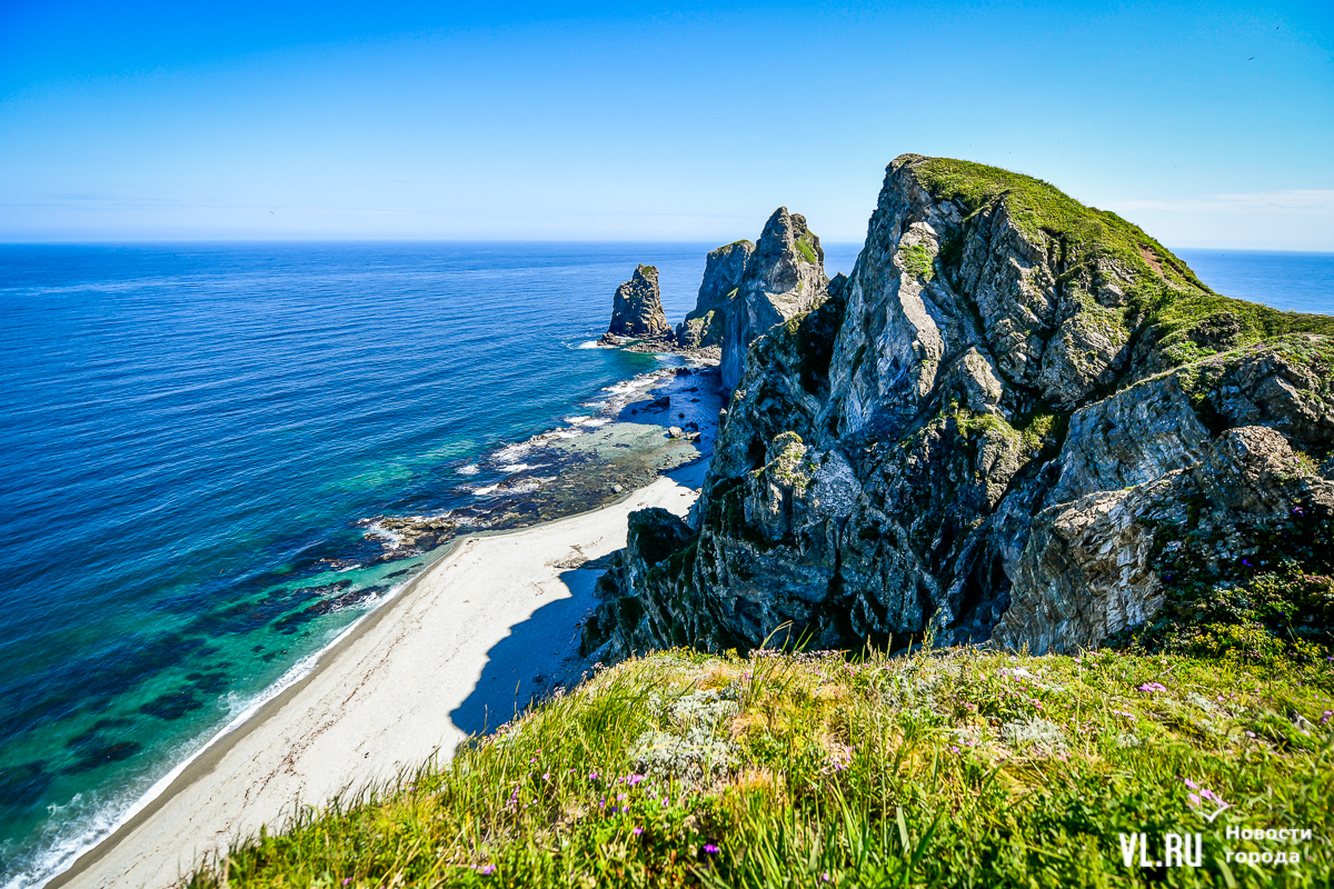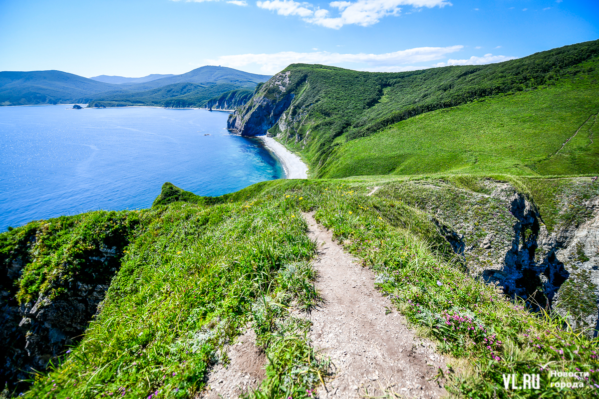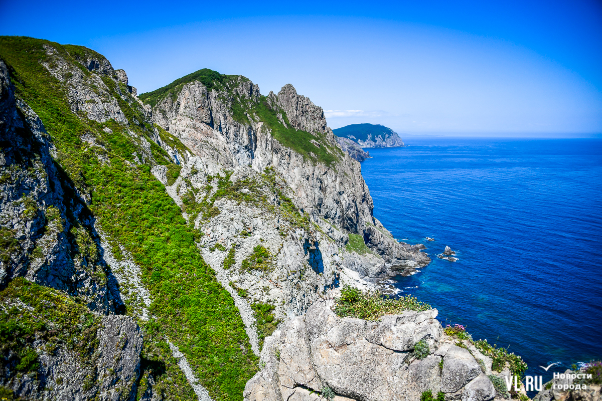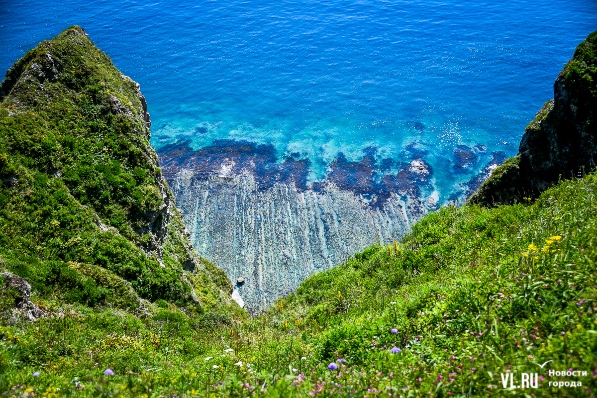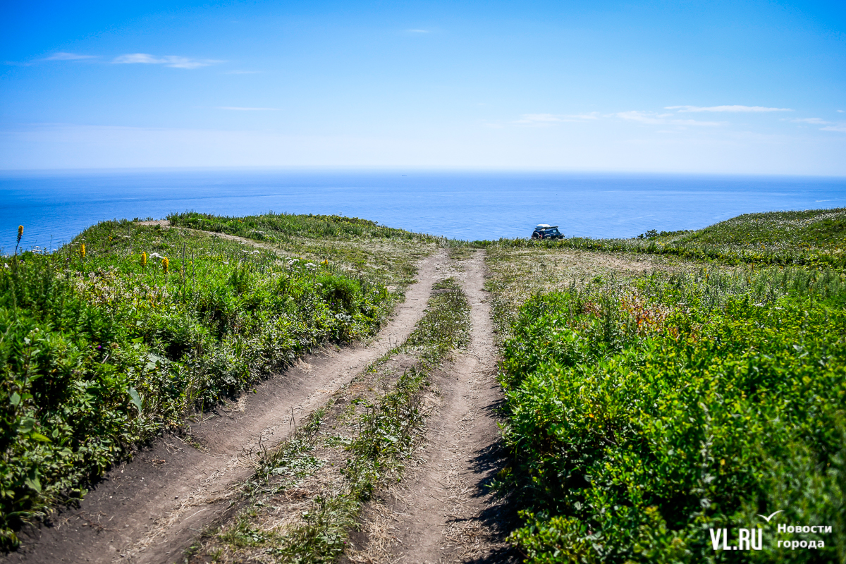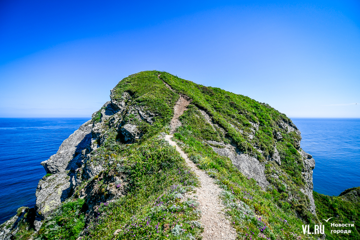 С высоты открывается просто невообразимый пейзаж – большое поле с цветами и холмами, а в конце возвышаются четыре обрывистые скалы, уходящие в море. Именно они и дали название мысу. Как показывает практика, часть туристов не уходит дальше видовой площадки, а зря. Если спуститься с сопки к самому мысу, то откроется совершенно другой вид. А после можно сходить на пустынный пляж. Тропинка к нему протоптана и хорошо просматривается. Правда, потом придётся потратить немало усилий, чтобы забраться обратно на видовую. Подъём получается местами крутой и затяжной. Именно поэтому лучше посещать мыс в прохладную погоду или во второй половине дня, когда температура воздуха не такая высокая. И обязательно захватите с собой питьевую воду.