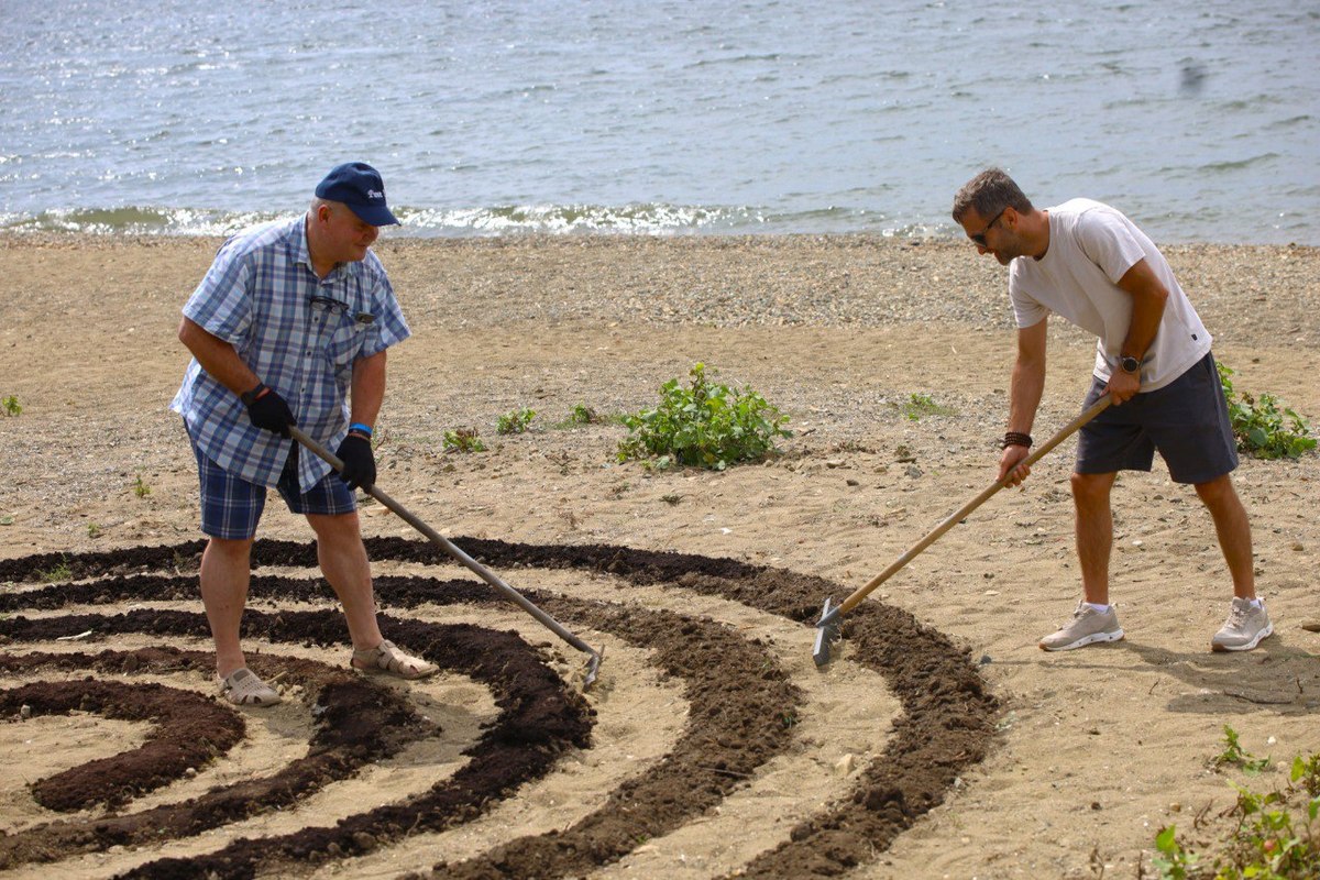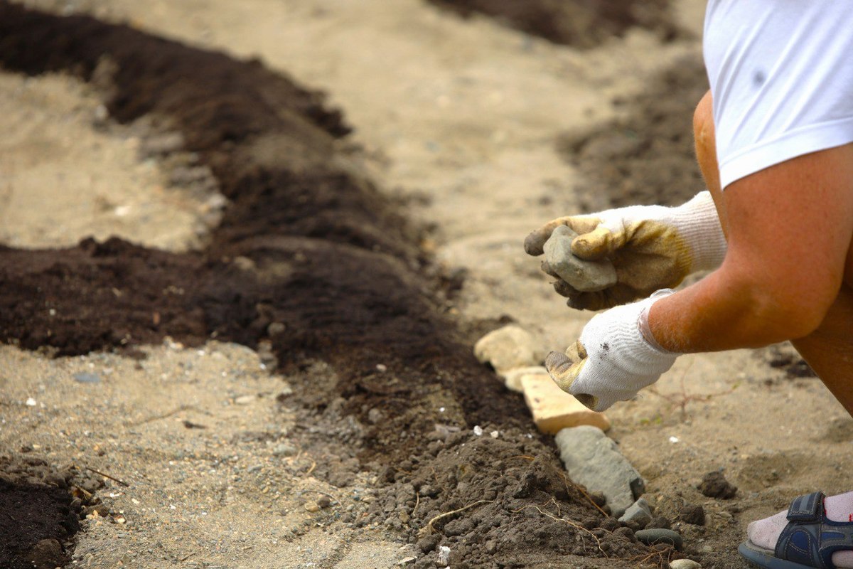 В создании необычного арт-объекта приняли участие горожане и сотрудники муниципальных служб. Они рассыпали семена по заранее начерченному узору и укрыли их землёй. Края узора оформили с помощью камней, собранных здесь же, на набережной.