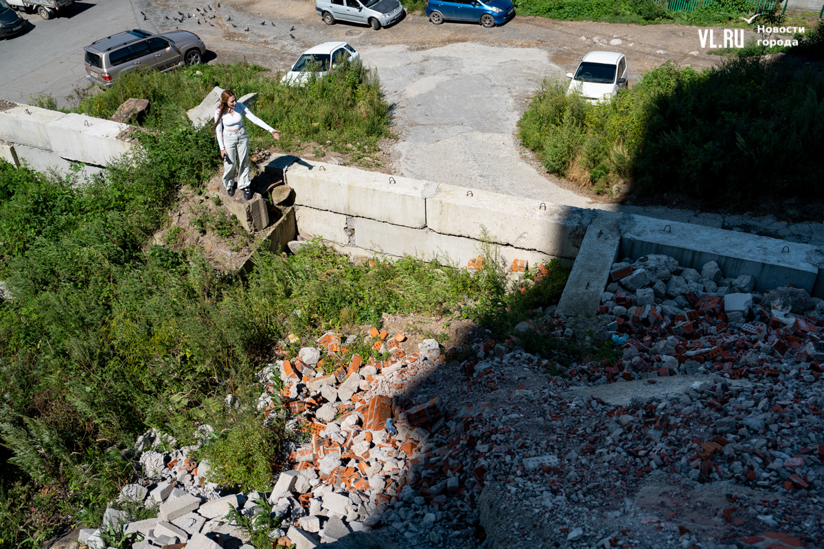 О доме № 2а Новости VL.ru рассказывали несколько раз. Дом строили больше десяти лет. Застройщик неоднократно привлекался к административной ответственности, а многочисленные нарушения не позволяли выдать заключение о соответствии законченного строительства объекта. После сдачи в 2018 году здесь вместе с асфальтом и бордюрами начал сползать косогор. Люди переживали, что вслед за ним пойдёт вниз и дом. В 2023 году косогор огородили. Решение выглядело спорным – бетон сдерживает только нижнюю часть косогора. Недавно здесь травмировался ребёнок, упавший в «карман» между верхней частью косогора и бетонной стеной.