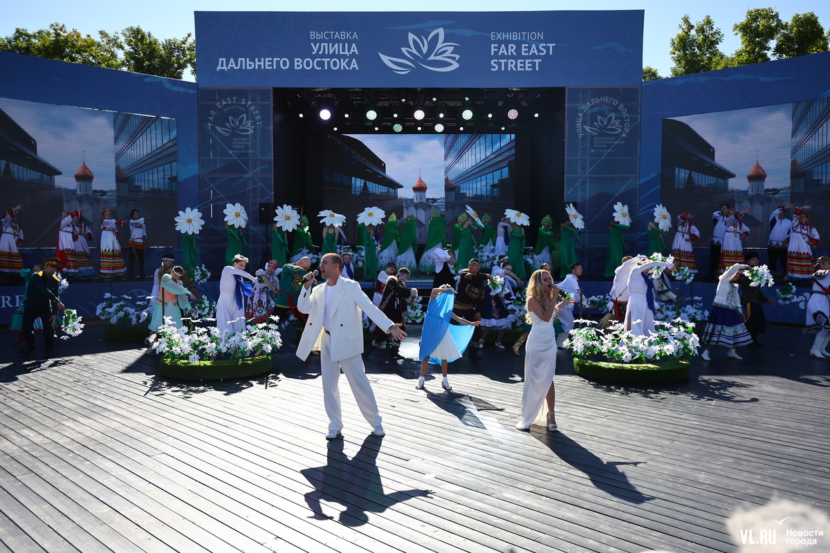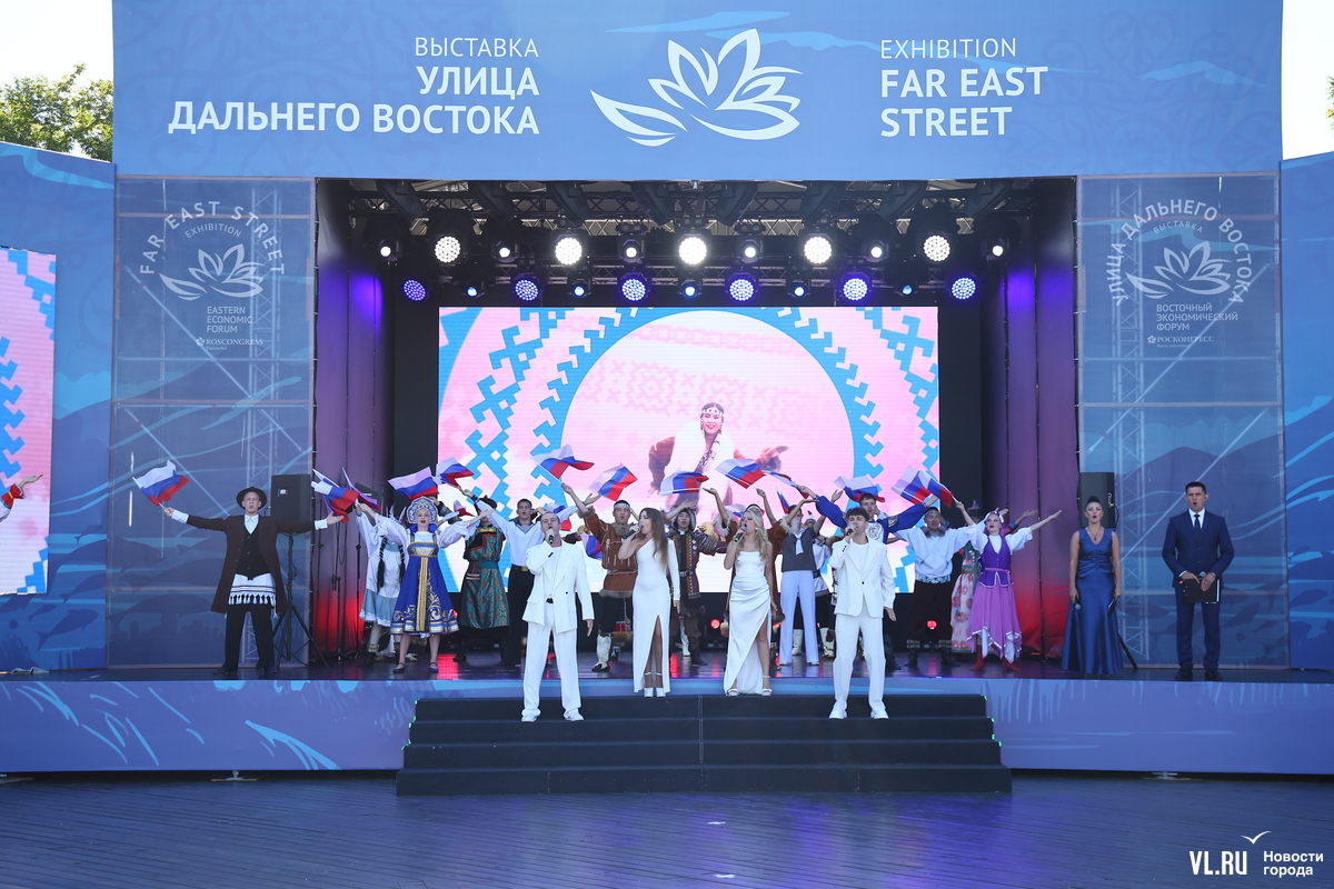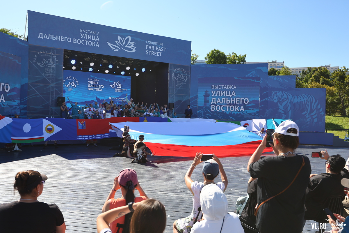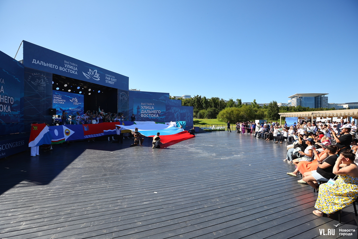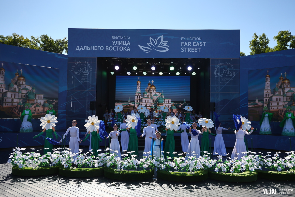 Открыл выставку флешмоб «Время жить на Дальнем Востоке»: прозвучала песня «Дальний Восток», которую написал народный артист России, поэт-песенник Илья Резник. Участники флешмоба вынесли на сцену флаги регионов федерального округа и развернули большой российский триколор.