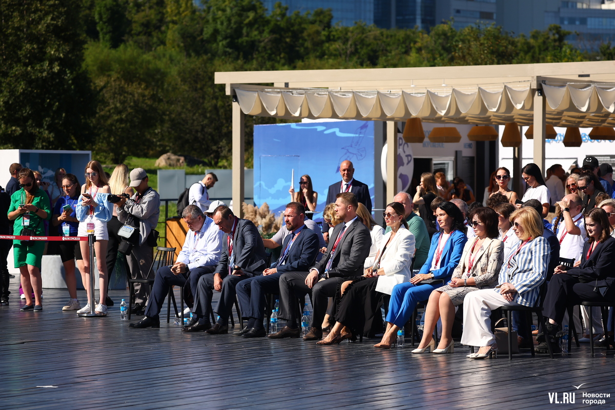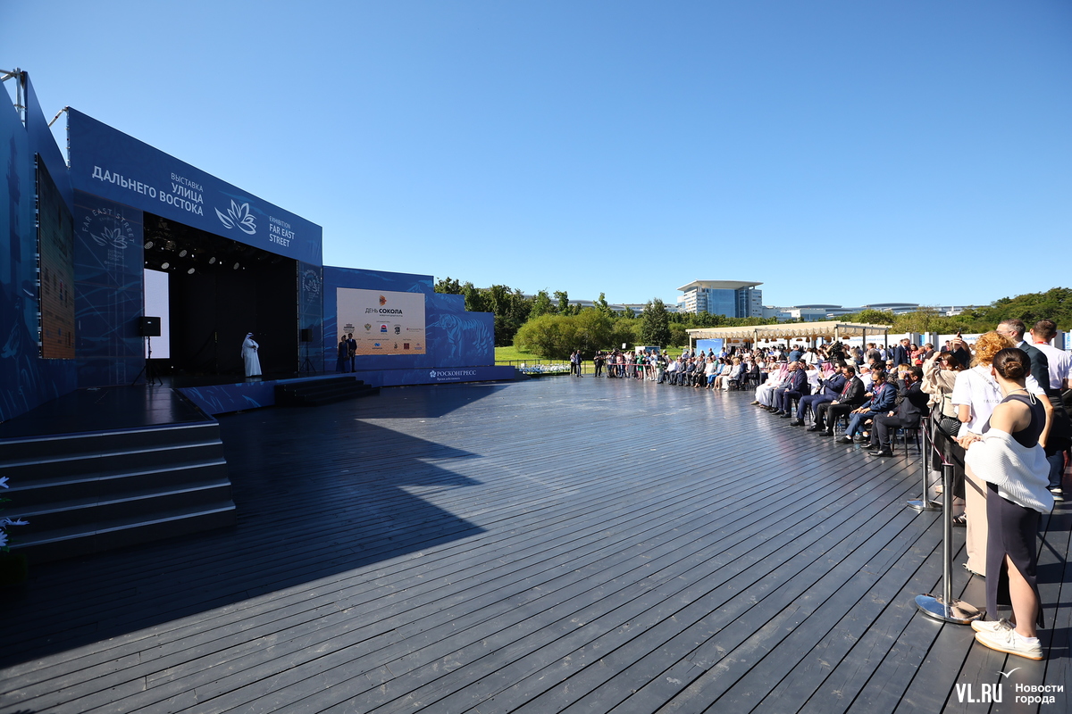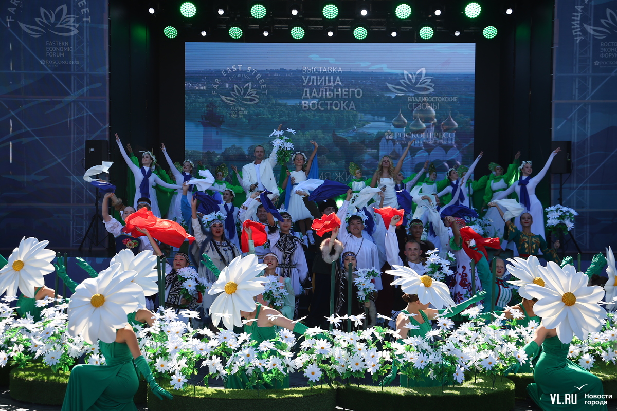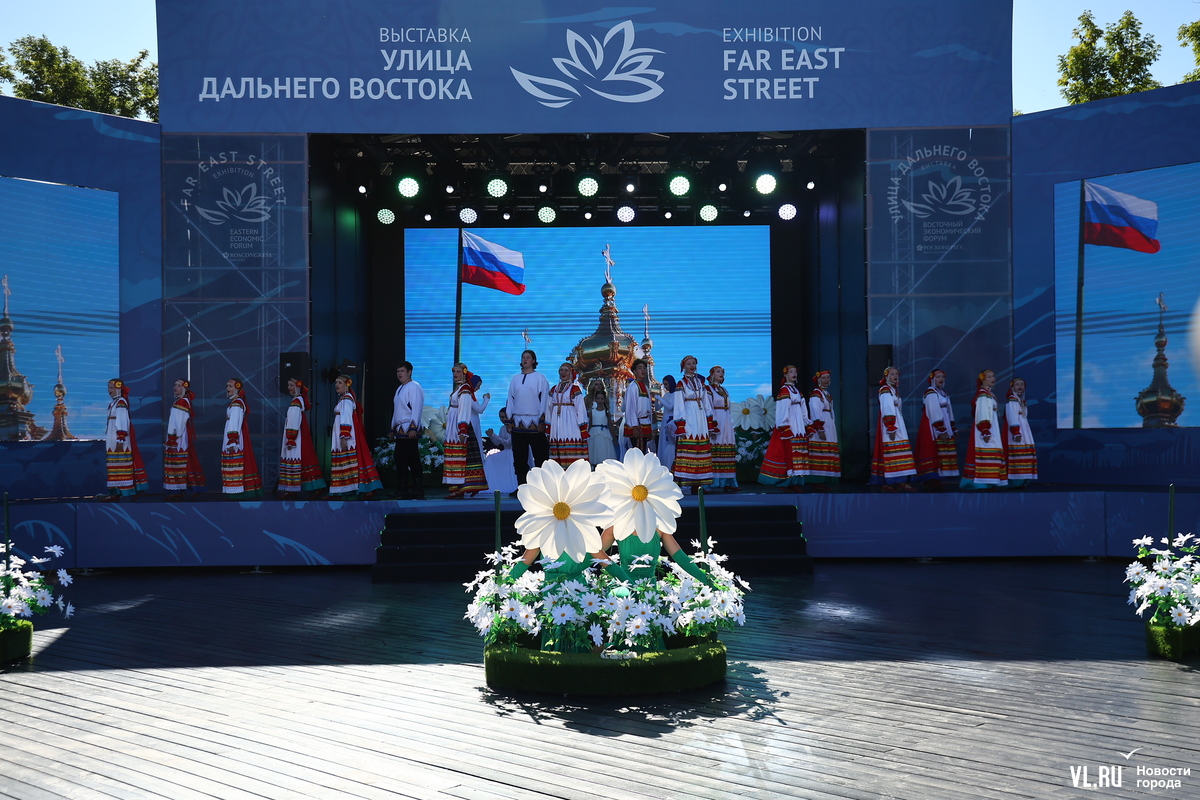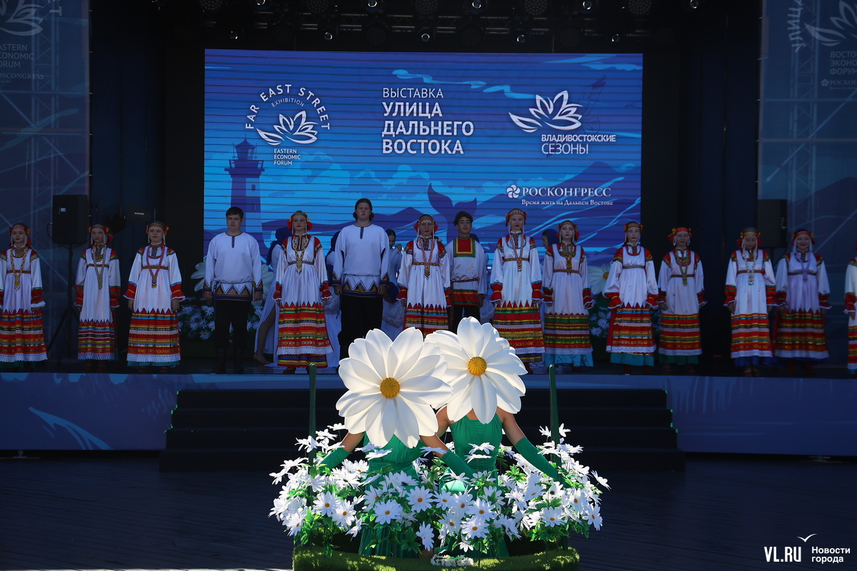 Открыл выставку флешмоб «Время жить на Дальнем Востоке»: прозвучала песня «Дальний Восток», которую написал народный артист России, поэт-песенник Илья Резник. Участники флешмоба вынесли на сцену флаги регионов федерального округа и развернули большой российский триколор.