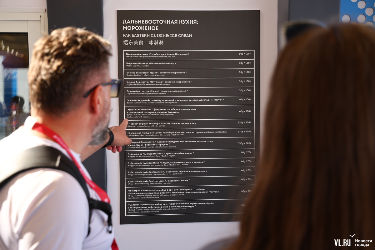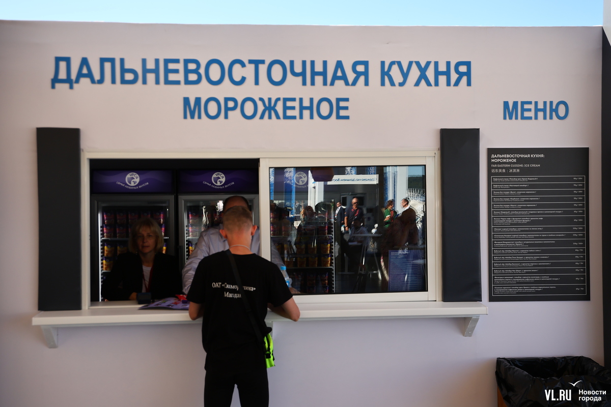 Здесь же на фуд-корте «Дальневосточная кухня: Россия встречает Азию» рестораторы и повара предложат попробовать дальневосточные варианты русской кухни и русифицированные варианты азиатских блюд. Здесь кормят блинами (270 руб.) с икрой (+250 руб.), лососем (+200 руб.) и сгущёнкой с дальневосточным кедровым орехом (+180 руб.), дальневосточной ухой (450 руб.) и дальневосточным пловом (470-520 руб.). На десерт гостям предложат медовик таёжный (480 руб.) и конфеты-грильяж «Стеклянный пляж». Также в меню входят камбала в азиатском соусе (550 руб.), хрустящие блинчики харумаки с крабом и минтаем (390-650 руб.), русский рыбацкий ломоть с неркой (750 руб.), икрой нерки (680 руб.) и дальневосточной сельдью (600 руб.), а также напитки из дальневосточных дикоросов.