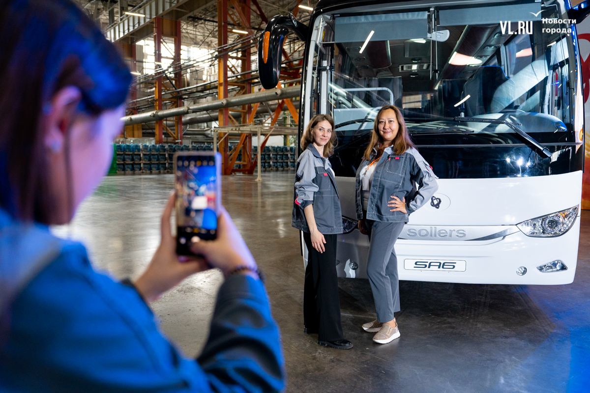 На заводе Sollers на Дальзаводской собрались чиновники, рабочие предприятия, журналисты. Все выстроились в ряд в одном из цехов и ждали, пока Денис Мантуров в сопровождении Адиля Ширинова заглянет внутрь новых автобусов. Журналистам прогуляться по производству не дали, поэтому узнать, что собой представляет крупноузловая сборка в современном понимании, не вышло.