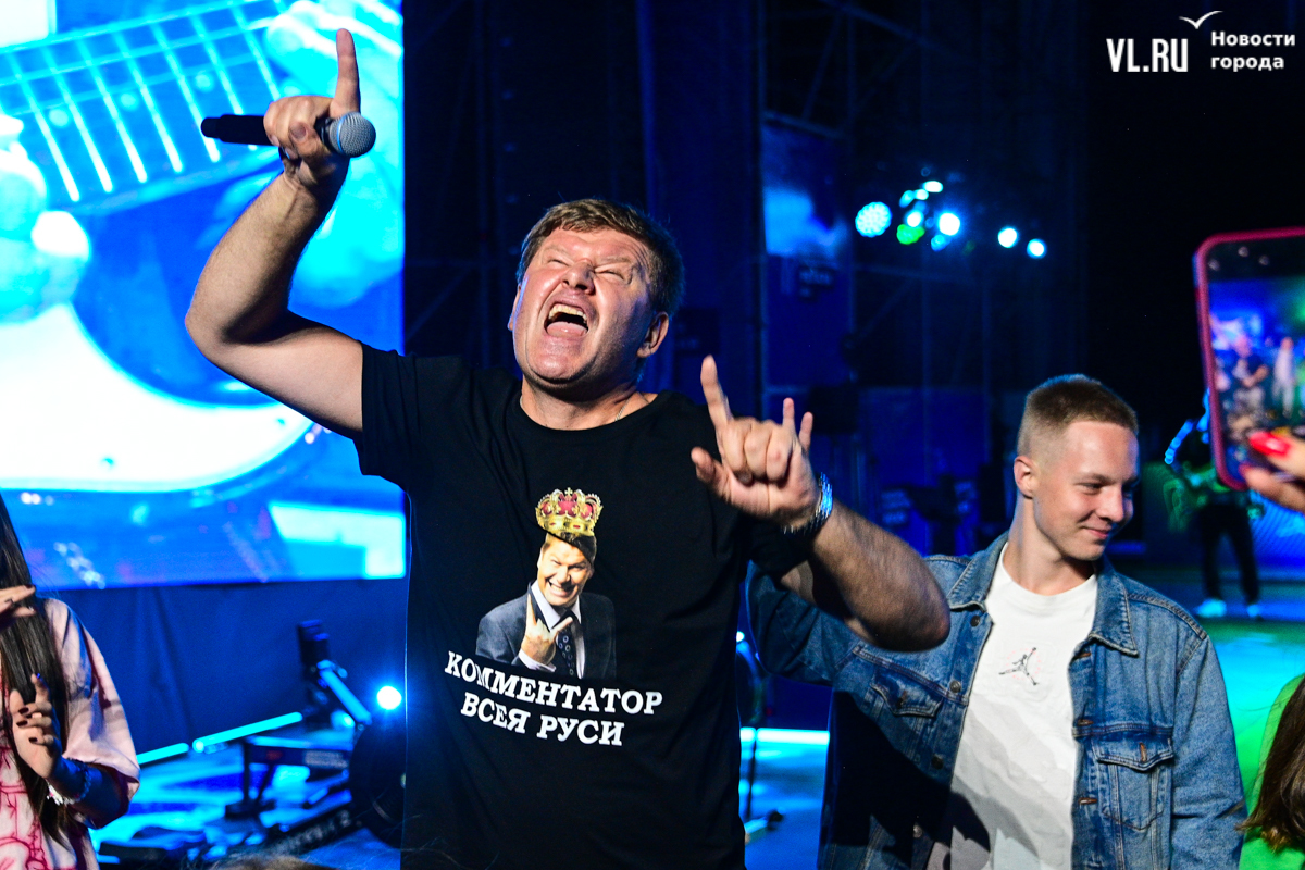 А после, неожиданно для всех, он пригласил зрителей присоединиться к нему и залезть прямо на сцену. Слушателей было немного, поэтому самые активные легко поместились там. Дмитрий Губерниев давал всем «пять», водил по сцене со всеми паровозик и при этом успевал петь вживую, хотя уровнем исполнения по итогу мало кто остался доволен – зато заряд положительных эмоций получили абсолютно все. В какой-то момент Дмитрий снял верх костюма и вернулся в футболке с надписью «Лучший комментатор всея Руси» и собственным портретом в короне. В этот момент стало не очень понятно, устраивает солист на сцене фарс, полный постиронии, специально или «колбасится» на сцене с детьми от души. Но главное, сами дети были в восторге.