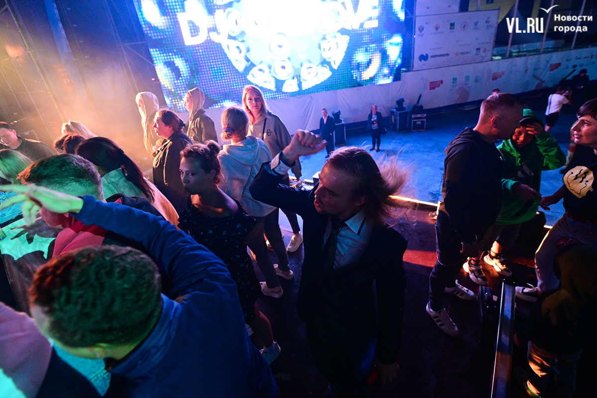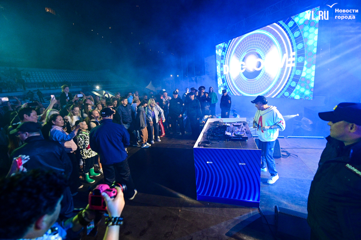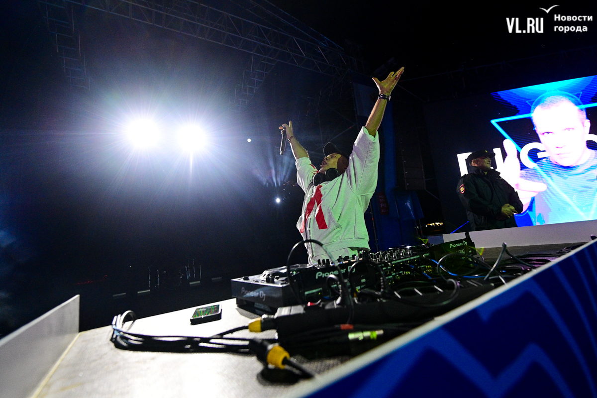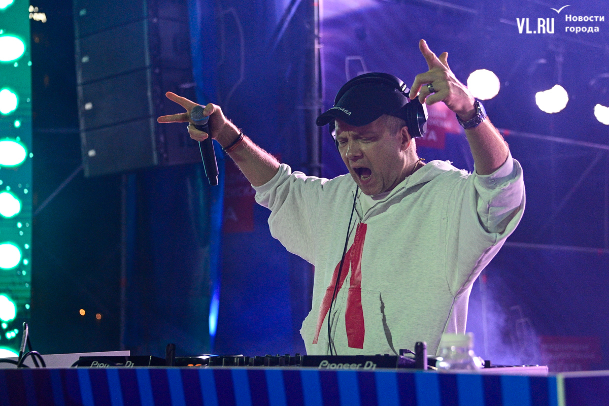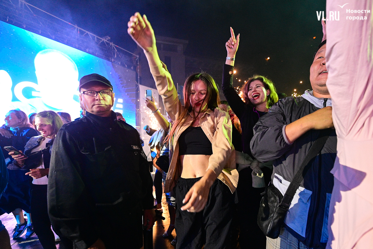 А потом на сцену выбежал DJ Groove – он сразу предложил всем подниматься к нему, чтобы создать атмосферу настоящей тусовки в клубе. Песни «На заре» и Sweet Dreams заиграли совсем по-новому, превращаясь то в свой электронный танцевальный вариант, то в сэмпл для новой композиции. Перед звездой нулевых в ряд выстроились полицейские, которые то и дело пританцовывали или снимали друг друга на телефон. Дети пробовали тренажёры для гребли, которые не убрали со сцены, а родители отрывались по полной.